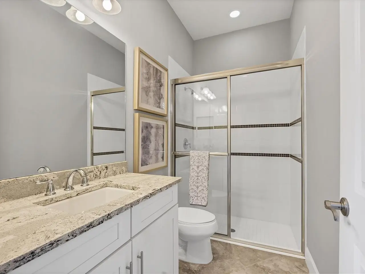 Spacious en-suite bathroom with dual sinks and frameless glass shower