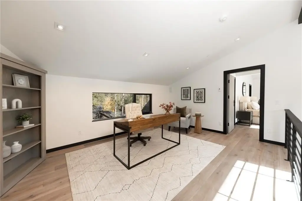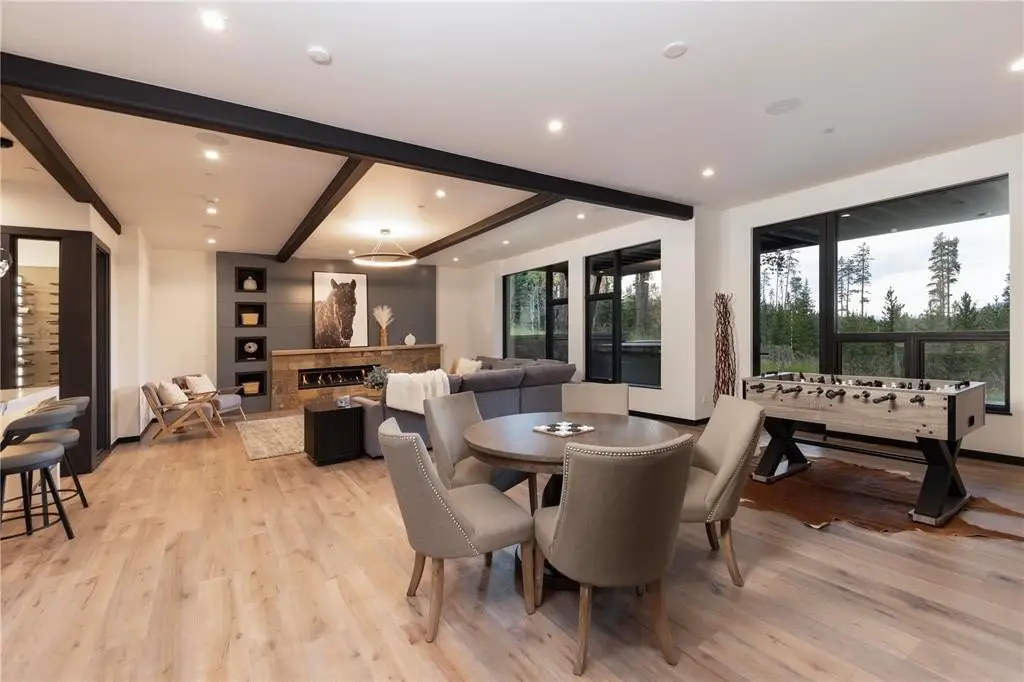 Welcome to this stunning new Allen/Guerra designed masterpiece nestled amidst the serene grandeur of the mountains and seamlessly integrated into the picturesque landscape of the prestigious, Jack Nicklaus signature Breckenridge Golf Course. This architectural treasure seamlessly blends mountain modern design with the picturesque beauty of its surroundings, offering an unparalleled living experience for those seeking a luxurious retreat. Large windows strategically placed throughout the home invite abundant natural light to flood the interior spaces, blurring the boundaries between indoors and outdoors and providing panoramic views of the protected mountain corridor. Step inside, and you are greeted by an open-concept layout that emphasizes spaciousness and fluidity. The interior design showcases custom steel beam work, stacked stone, unique sports bar, stunning glass wine room and multi-level outdoor living areas for everyone to enjoy.