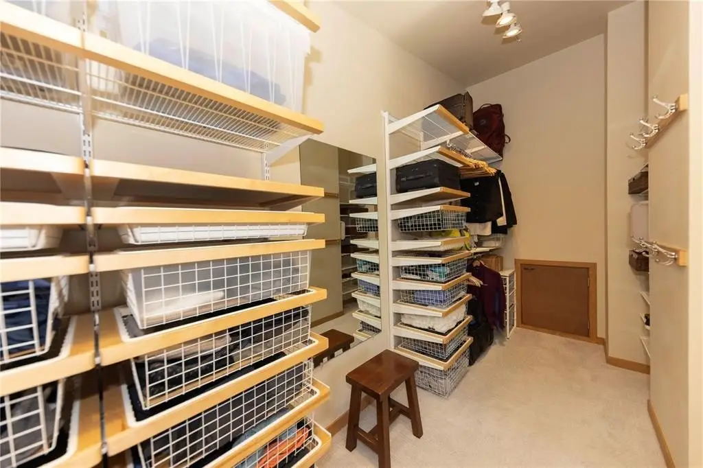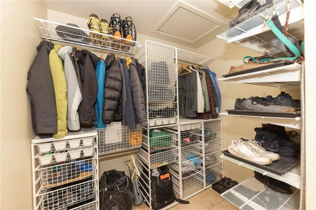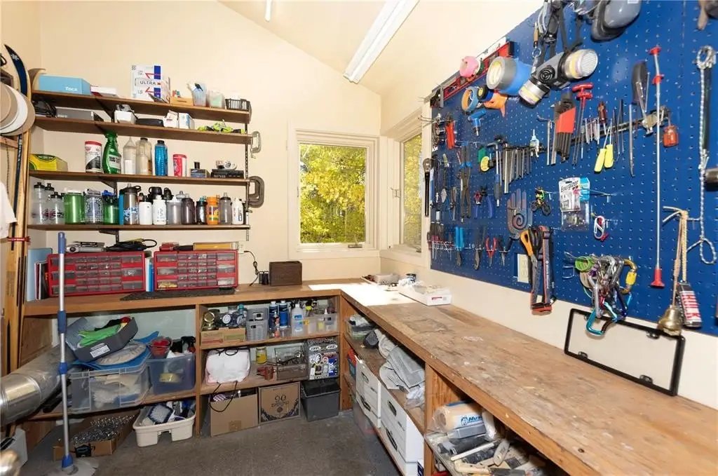 Spacious attached garage with storage cabinetry