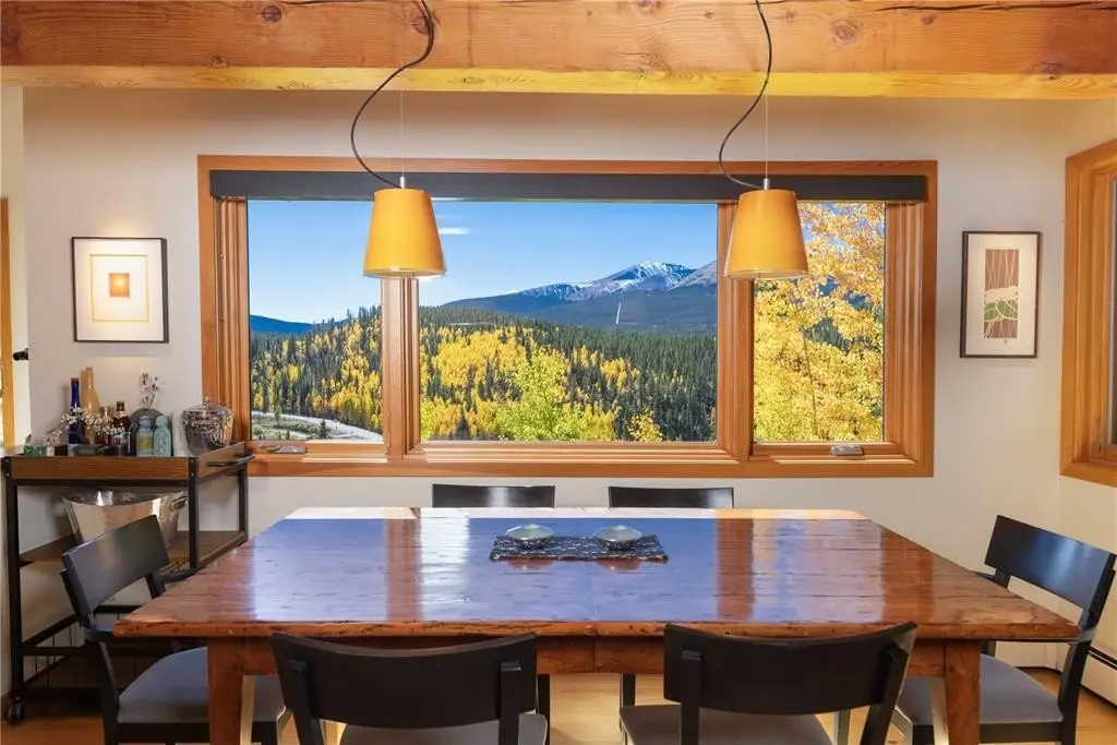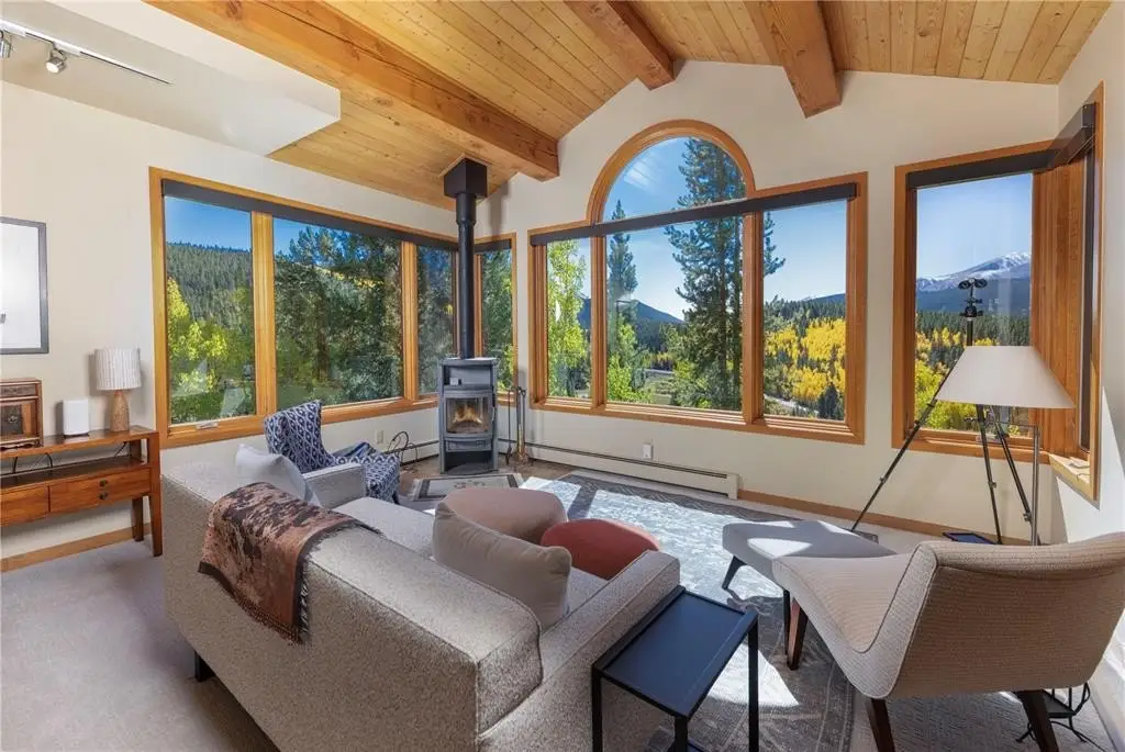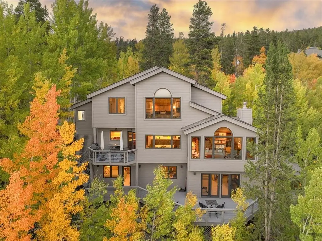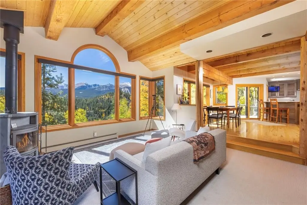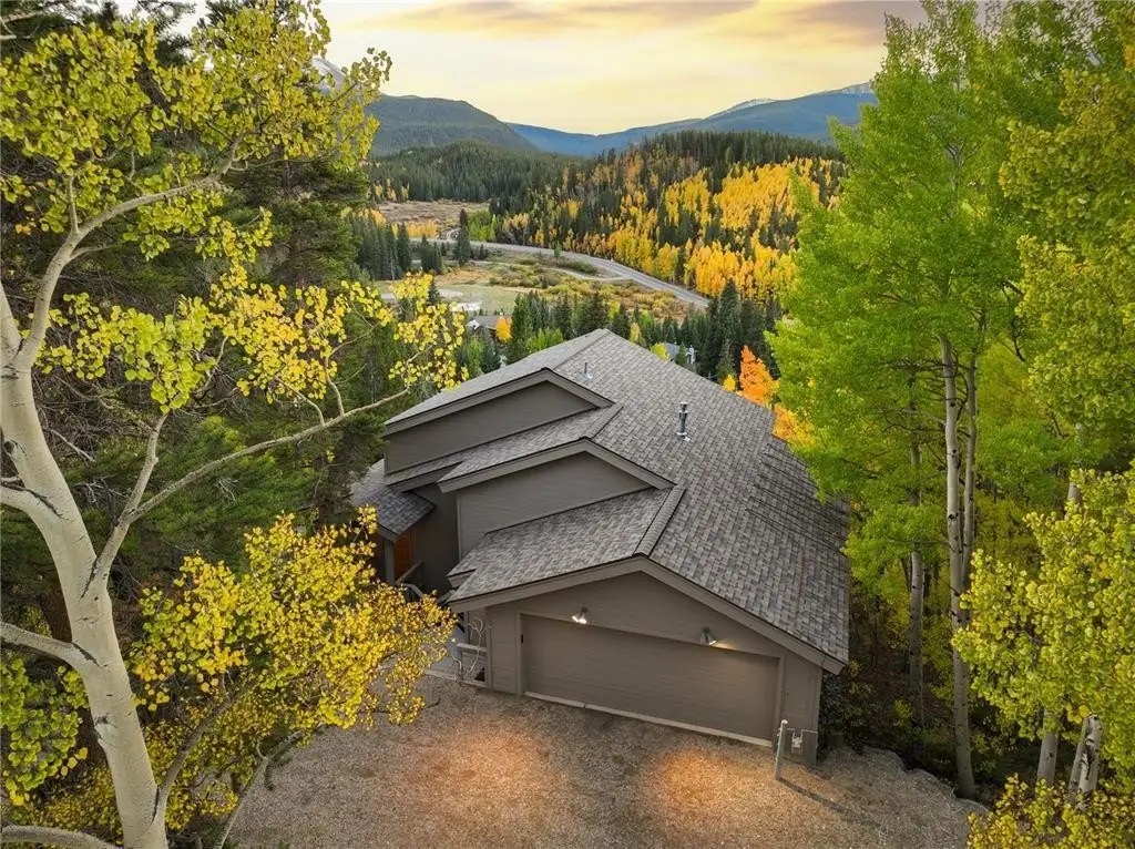 Nestled in a serene forest of aspens and evergreens, this 4-bedroom, plus office, contemporary mountain retreat in Breckenridge captures the essence of Colorado living. Bathed in passive solar light, the home offers breathtaking views of ten iconic peaks, including Quandary, Peak 10, Baldy, Red, and Hoosier Ridge. Set on 1.2 acres, the property has been thoughtfully updated with newer carpet, fresh exterior paint, a newer roof, expanded driveway, and newer front entry stairs, decks and exterior staircases. Inside, the heart of the home is a fully remodeled chef’s kitchen featuring William Ohs custom cabinetry, a Subzero refrigerator, gas cooktop and double oven, and old-growth Hickory floors that flow into the dining area. Step out onto the adjacent deck for grilling with a BBQ directly connected to the gas line, perfect for entertaining under the stars. A Danish soapstone wood-burning stove anchors the main living room, and adjacent you will find a private office including a cozy reading nook and inspiring views of Baldy, while a secondary family room on the lower level opens to a sun-drenched deck ideal for morning coffee or afternoon lounging. The spacious attached garage includes storage cabinetry and a dedicated workshop. With panoramic views and a quick walk to the bus stop, this property offers it all. Whether you're seeking solitude, adventure, or a place to gather, this home provides a rare blend of craftsmanship, comfort, and alpine beauty.
