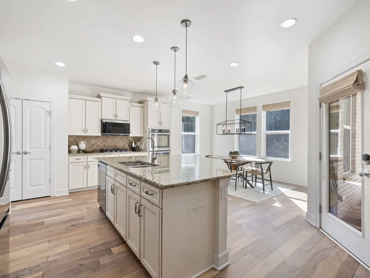 Welcome home to this stunning property with a layout that truly has it all! The gourmet kitchen is the heart of the home, featuring a large island and breakfast area that open to the great room with its cozy stone gas fireplace and beautiful coffered ceiling. Just off the foyer, the formal dining room shines with arched doorways and a wood accent wall that adds warmth and charm. The main level offers a relaxing primary suite with double closets plus a private guest ensuite--perfect for visitors. Upstairs, you'll find plenty of space with an oversized bonus room, a media room for movie nights, and two additional bedrooms, along with extra storage. Fresh white paint throughout makes every room feel bright and welcoming. Enjoy the outdoors year-round with a screened flagstone porch, a patio for grilling, and a level fenced backyard with irrigation--ideal for play, pets, and entertaining. A 3-car garage tops it all off.