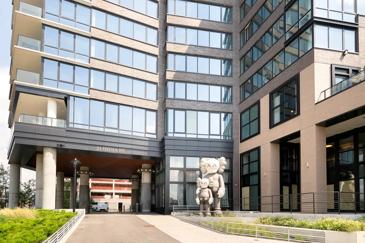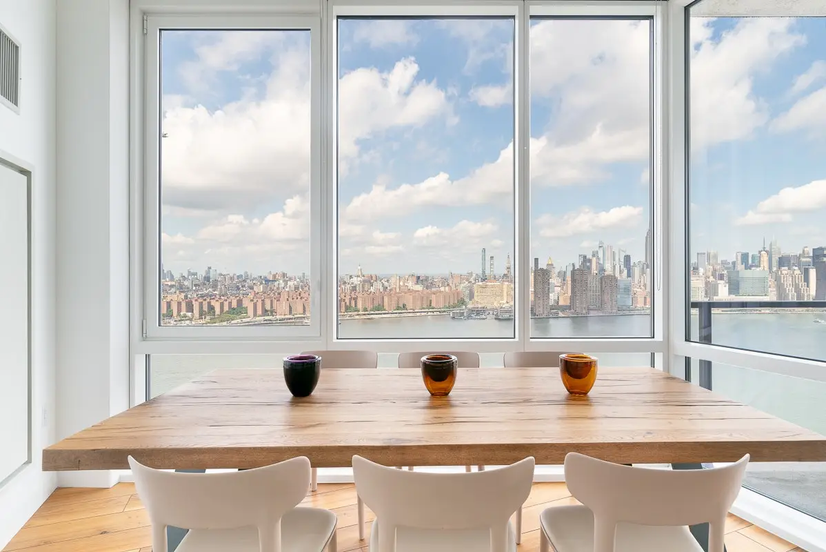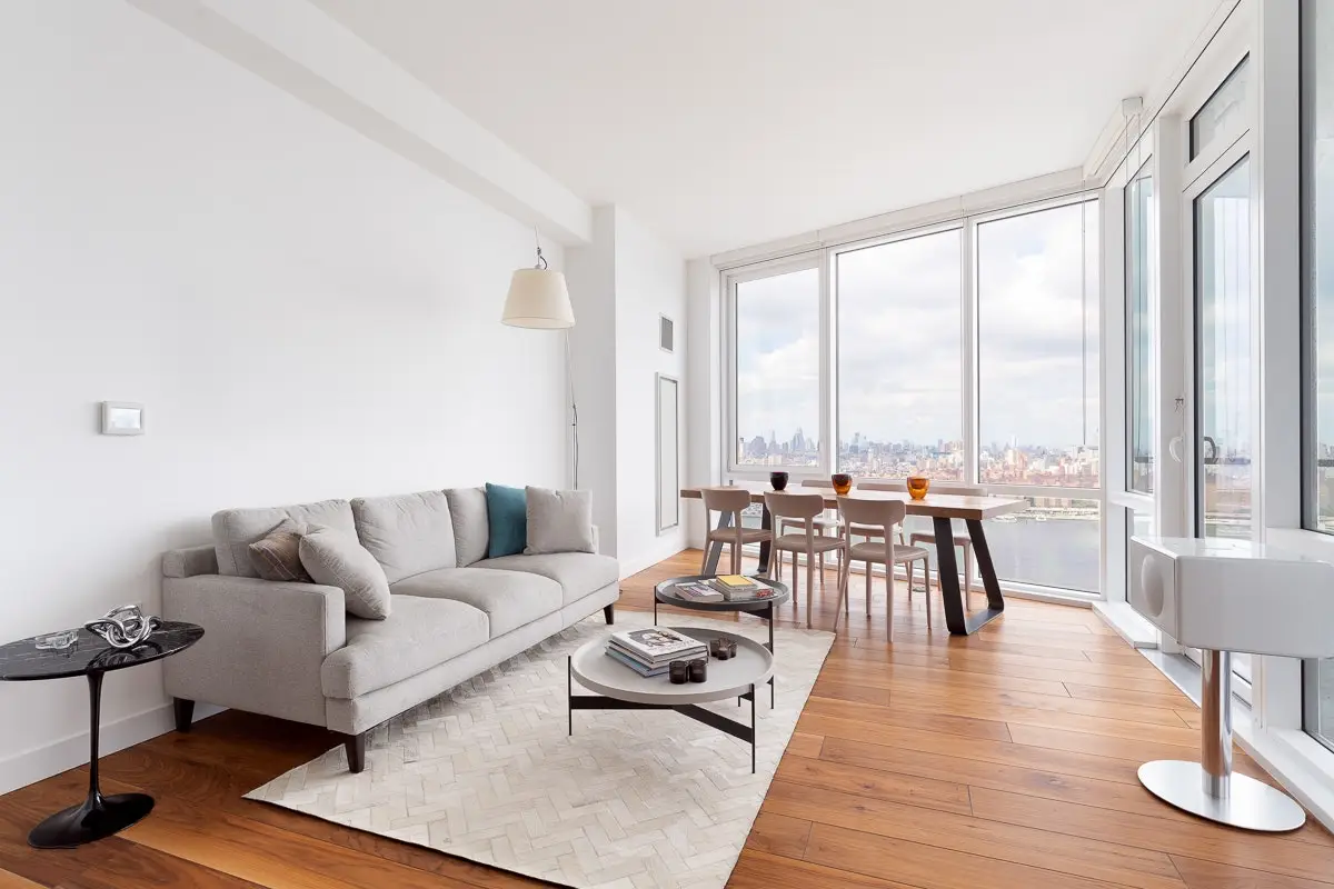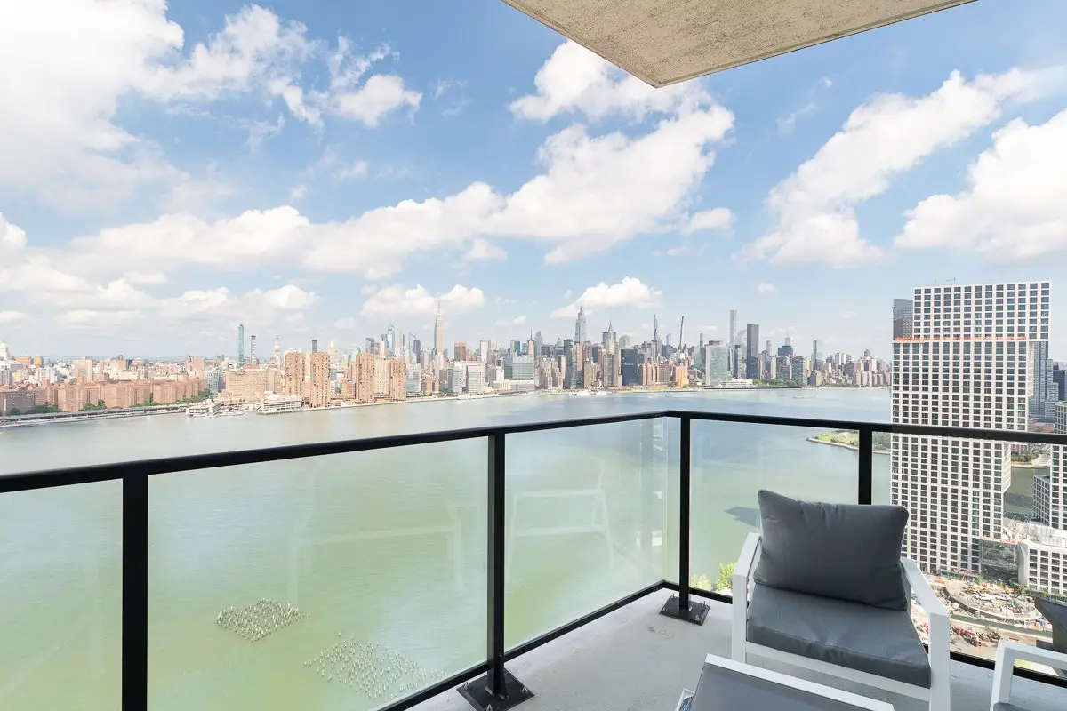 This expansive three-bedroom, 2.5-bathroom condominium residence soaks in expansive East River views from every room, including west-facing floor-to-ceiling windows in the living/dining room overlooking Manhattan and beyond. From its perch on the 34th floor of the decadent 21 India Street, residents will enjoy sweeping views of the river, skyline, and sky all year round via western and northern exposures. A formal entryway with two coat closets leads to a gallery, unfurling to reveal an open kitchen, dining and living space overlooking the East River with corner floor-to-ceiling windows. A large L-shaped kitchen provides bountiful storage and useful prep space in a unique two-tone design. Walnut cabinets are framed by a waterfall-edge countertop and herringbone Carrara tiles stretching to the ceiling. Opposite and conversational with this modern kitchen is a living and dining area stretching 32' wide. Ample space and flexibility provide for varied arrangements for separate dining and living areas, all gravitating towards captivating views. There is also a powder room located off the central hallway. Extending the living space is an approximately 90-square-foot balcony, perfect for an outdoor living or dining area. Secluded on the eastern side of the apartment is a spacious primary bedroom suite, complete with a walk-in closet, two additional closets, and a four-fixture master bathroom with double vanity and a large step-in shower with rain head. Two secondary bedrooms are located off a small gallery, each sharing a four-fixture bathroom. One of these bedrooms is a lovely corner room with floor-to-ceiling windows and more of those river views. This space could also double as a dramatic reading room, home office, or TV room. The other bedroom faces north and can accommodate a queen-sized bed with excellent closet space. Amenities abound at 21 India Street, including a 24-hour attended lobby, co-working space, fitness center with half basketball court, and outdoor spaces in the form of a sun deck and courtyard. Bike storage is available, as is third-party parking in the building. For transit, the building is located directly adjacent to the India Street Ferry Landing (ferry reportedly returning soon) and the G-train at Greenpoint Avenue (with a station entrance on India Street @ Manhattan Avenue).