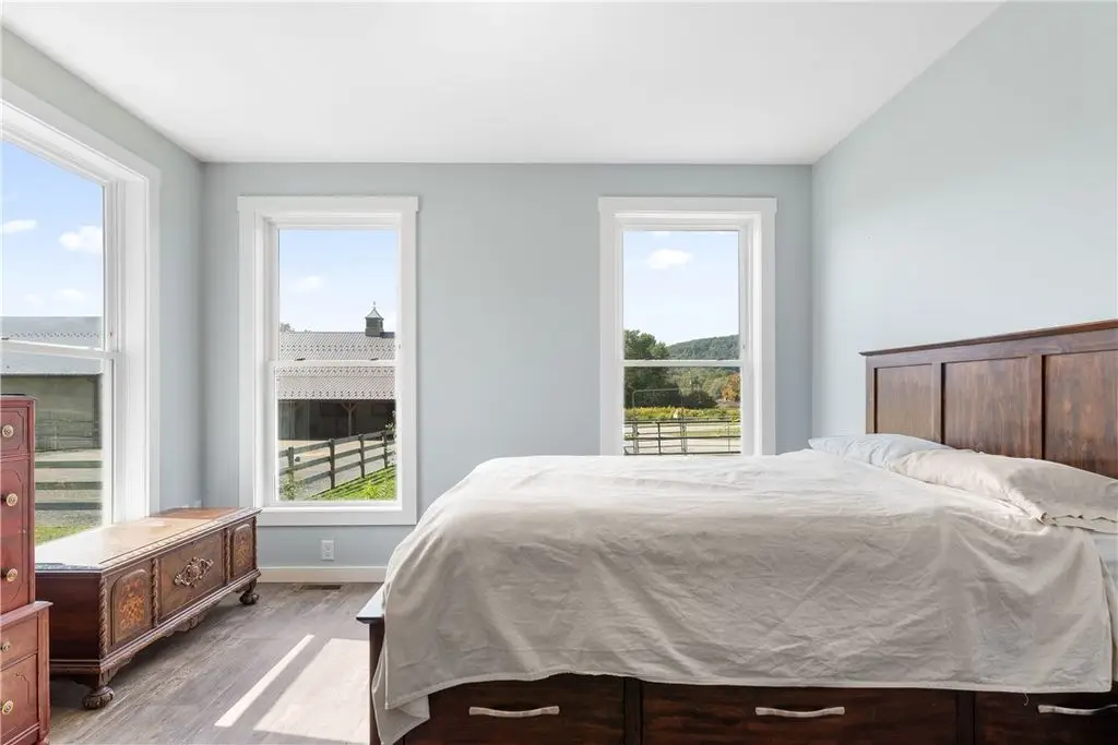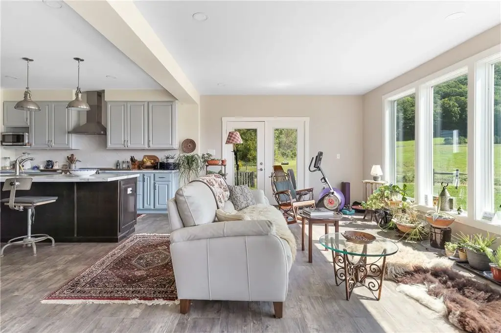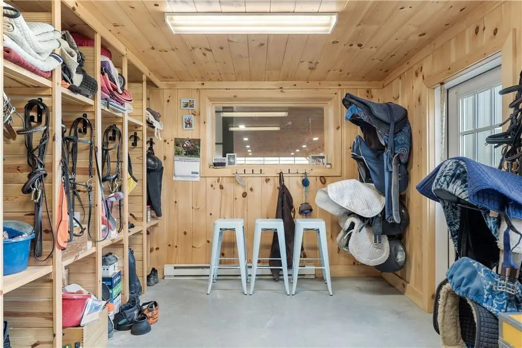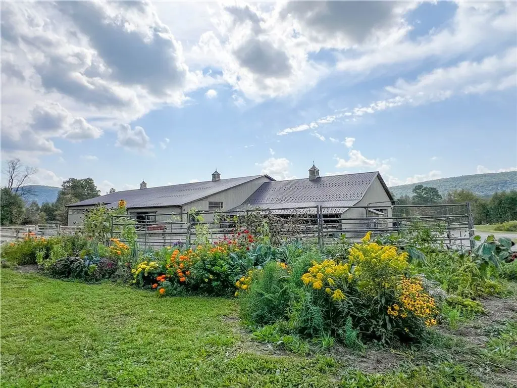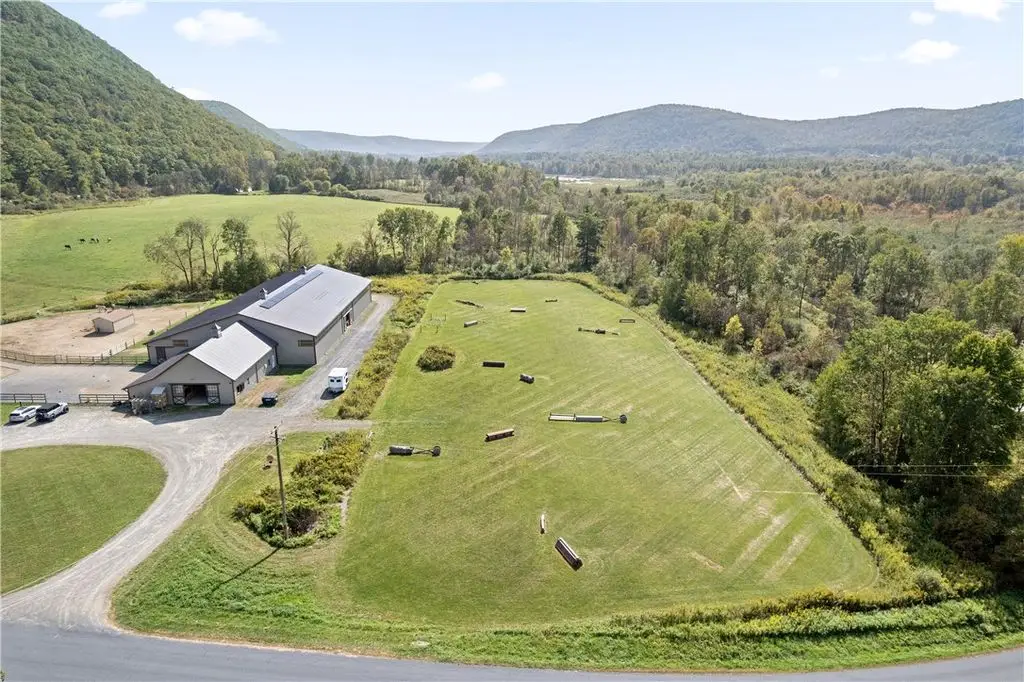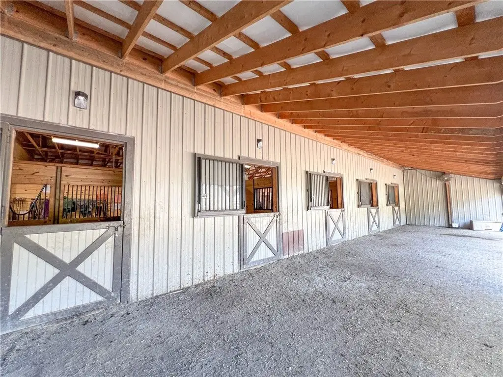 This exceptional equestrian property offers a rare combination of features. Set on 30 acres only 15 minutes from Cornell University in the Finger Lakes region, this facility's amenities are top of the line! The barn features 6 stalls, all with 12x12' mats, outlets and automatic waterers, a wash stall, heated bathroom, feed room, and heated tack room with observation area. 5 stalls have Dutch doors to the run-in shed and dry lot paddock that leads to a 20-acre pasture. The 80 x 160 indoor arena is perfect for year-round equestrian needs and the professionally built turf riding field with cross country jumps offers even more riding space. An additional paddock with run-in and large storage area off the arena round out this elite facility. Relax and watch your horses through the wall of windows in your 2020, 3-bedroom home with an open floor plan, 9-foot ceilings, lots of light, a perfect primary suite and plenty more space in the basement to expand or use for gym/rec activities. Geothermal heat for the home and solar for the house and stable result in very low utilities. Currently an income producing boutique boarding business. Continue a business or use it all for your own horses!