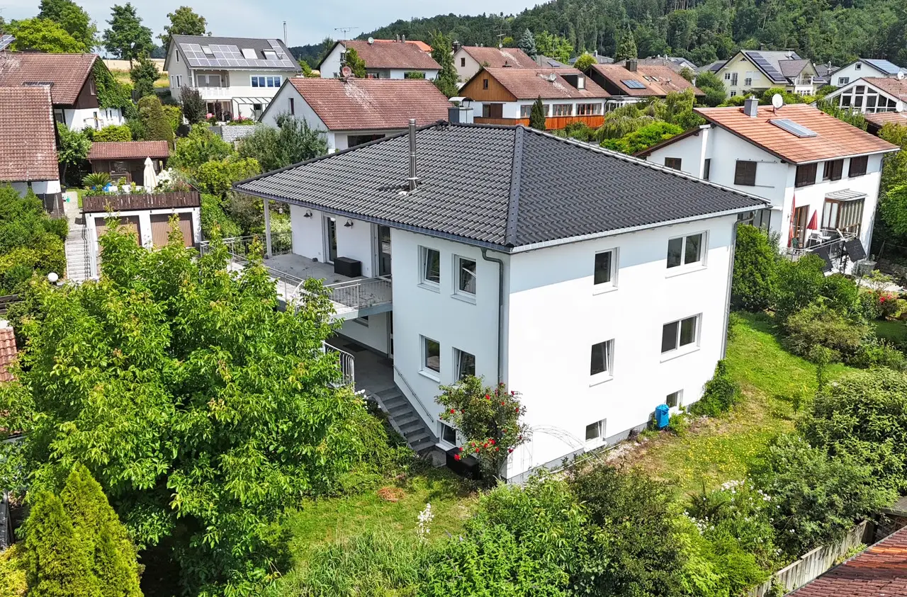 Spacious two-family house with granny apartment and modern living ambience in Bruckberg-Gündelkofen This attractive two-family house impresses with a successful combination of contemporary comfort, generous space and flexible usage options. Originally built in 1982, the building was extensively renovated and almost completely rebuilt in 2014. The total living space of approx. 260 m² includes the large terraces on a pro rata basis. The total living space is therefore around 230 m². The upper floor offers a modern living ambience with high ceilings, a spacious living and dining area, separate kitchen and a stylish panoramic fireplace, which gives the room a special atmosphere. A contemporary bathroom rounds off the attractive overall picture. The lower residential unit still retains its original character in some areas and is ideal for individual design ideas. Both apartments have a well thought-out room layout and offer plenty of space for several generations to live together comfortably or for a combination of owner-occupation and rental. Features include a high-quality fitted kitchen, parquet and tiled floors, guest WC, fireplace and modern building services with air/water heat pump. The house comprises a total of 7 rooms and 3 bathrooms. Two large terraces and a low-maintenance garden create ideal retreats for relaxing hours outdoors. There is also approx. 100 m² of additional usable space, 3 outdoor parking spaces and 2 garage parking spaces. Thanks to the modern technical equipment and the extremely well-kept condition, you will enjoy a high level of living comfort and energy efficiency (efficiency class A). A versatile house with many possibilities - for sophisticated living, cross-generational use or as a stable investment. You can call up the 360-degree digital tour under this link: https://tour.giraffe360.com/ff1323a9ac704e6986c75516be466c85/