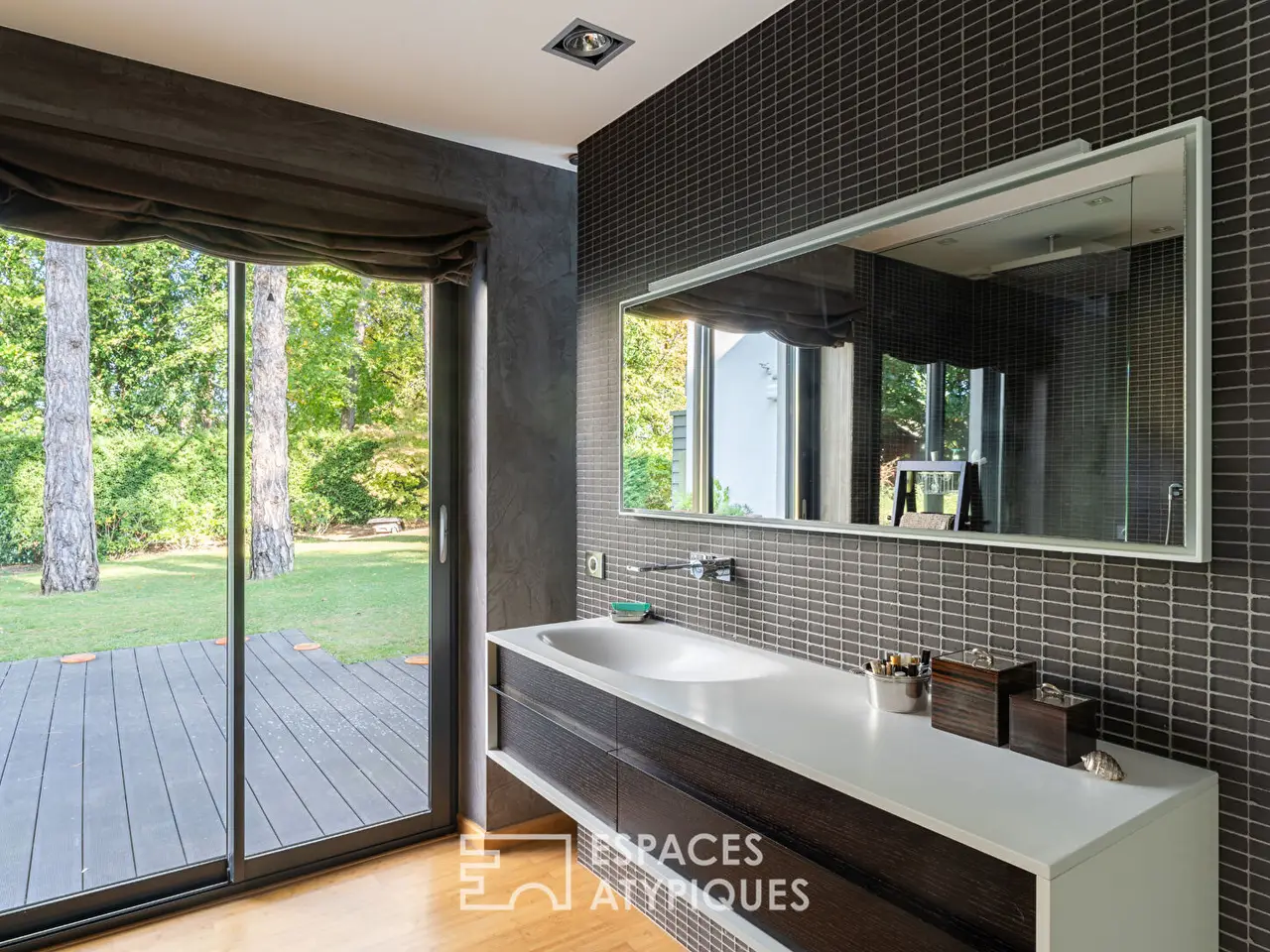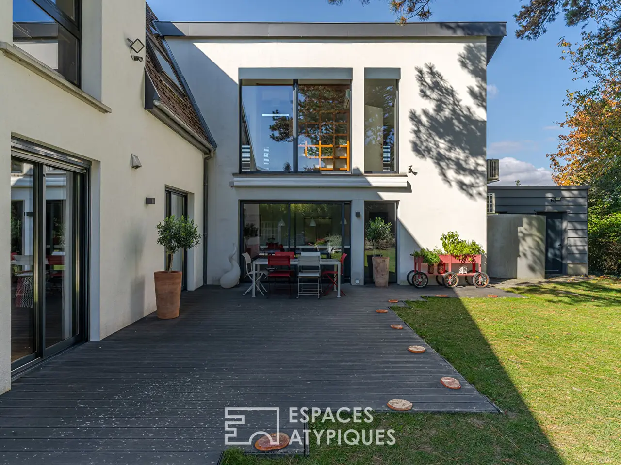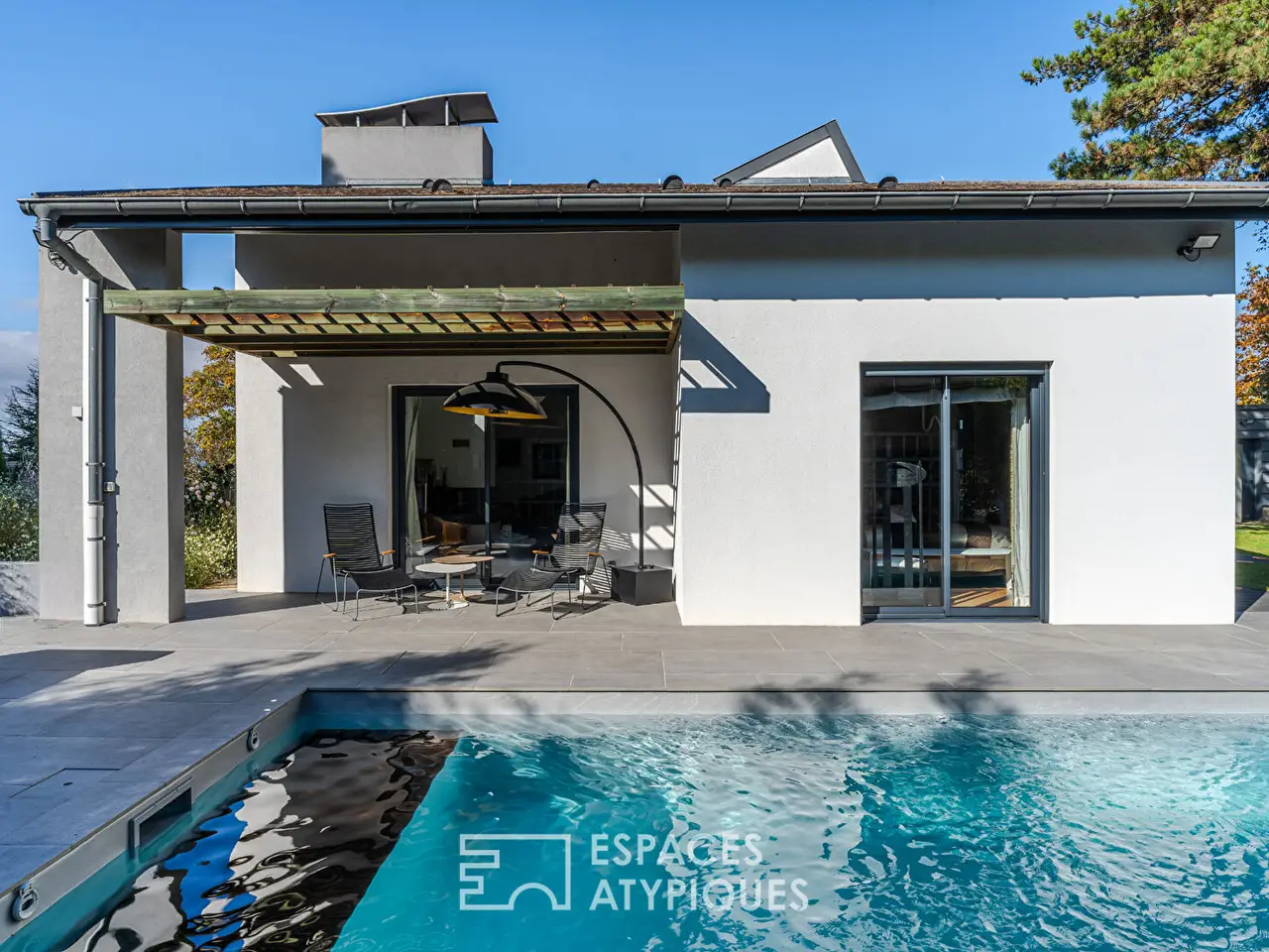 The outdoor spaces have been designed as an extension of the house. A beautiful terrace borders the 9×3 m swimming pool, set in a perfectly landscaped garden with two outbuildings. This privileged environment, promising absolute calm, benefits from quick access to all amenities. Shops, schools, and transportation are only a five-minute drive away.
