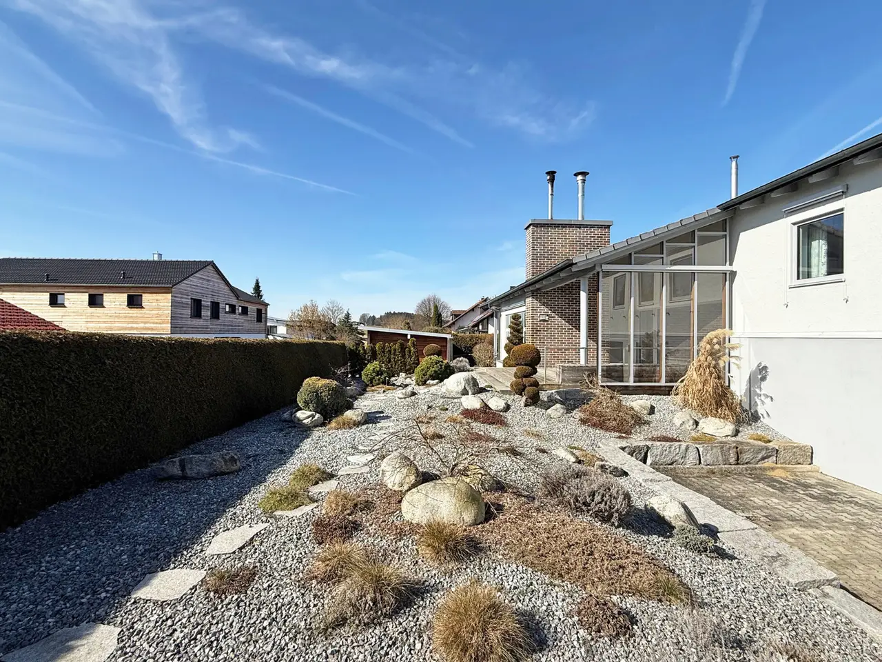 This impressive, extremely spacious detached house with separate granny apartment offers a wide range of possible uses - whether as a multi-generational home, for combining living and working or simply for spacious living with plenty of room for individual design. With a living space of approx. 368 m² on a plot of 1,408 m², nothing is left to be desired here. The house was built in 1978 in solid solid construction and was renovated and modernized to a high standard in 2013. The well thought-out architecture with up to three possible residential units creates maximum flexibility. Spacious living areas, light-flooded rooms and a converted attic ensure a pleasant living atmosphere with modern comfort. The tasteful combination of high-quality materials, the modern furnishings and the stylish design of the outdoor areas are particularly noteworthy. The lovingly landscaped rock garden gives the property an exclusive touch. Several terrace areas invite you to linger, while the modern carport with adjoining garden area offers ample parking space. This house combines luxurious living with well thought-out functionality and offers a rare opportunity for anyone looking for a spacious, comfortable home with versatile usage options. Come and view this property and be inspired by its many highlights.