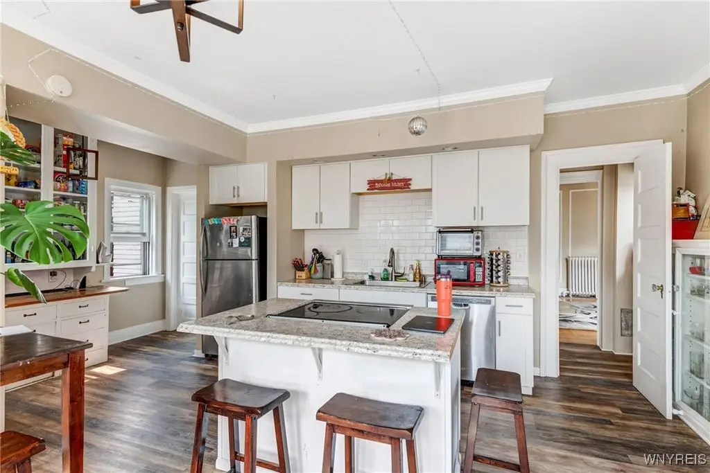 Opportunities galore with this stunning three-unit property which offers an exceptional opportunity for investors looking to acquire a tenant-occupied multi-family building with steady rental income or an owner user looking to offset their mortgage payments with rents. The property has been meticulously maintained and can easily be transformed back into a spectacular, show-stopping, single family home of the highest caliber. Situated in the highly desirable Historic Preservation District, the second and third floor units are fully leased with reliable tenants, ensuring immediate cash flow from day one. The building consists of three spacious floors, featuring original woodwork, ornate handles, and historic details that simply cannot be replicated. The impressive first floor is currently being used by the owner as an office. It has a front reception area with fireplace, conference room, formal office with fireplace, bathroom, kitchen, central AC and more. The rental units have updated well-equipped kitchens, in-unit laundry, comfortable living spaces, and ample natural light. The second-floor unit has high ceilings, two large bedrooms, two full baths, and a spacious family room with beautiful fireplace. The third-floor unit has two large bedrooms, an eat-in kitchen, and rear porch. Upgrades to the electric, circuit breakers, generator, AC and more. Roof(2015). Full basement houses all the mechanics and currently being used for storage. Full concrete driveway, ample parking spaces, and a two-car garage! Located within close proximity to local amenities such as shops, restaurants, parks, and public transportation. This property provides both convenience for tenants and strong potential for long-term value growth. Whether you're looking to expand your real estate portfolio or seeking a chance to live in one of Buffalo's most premier residences, this property offers a fantastic opportunity for investors and homeowners alike. Sqft is 5,272 professionally measured with floorplans provided.