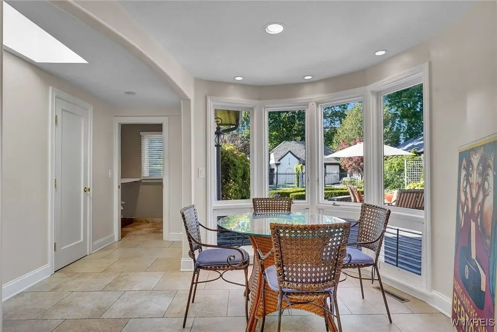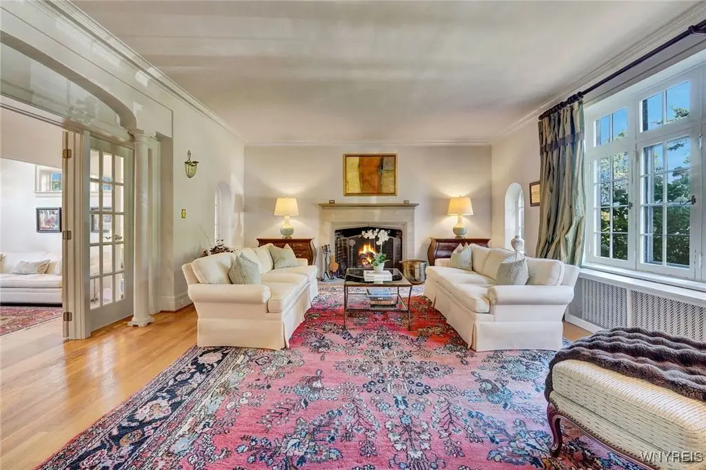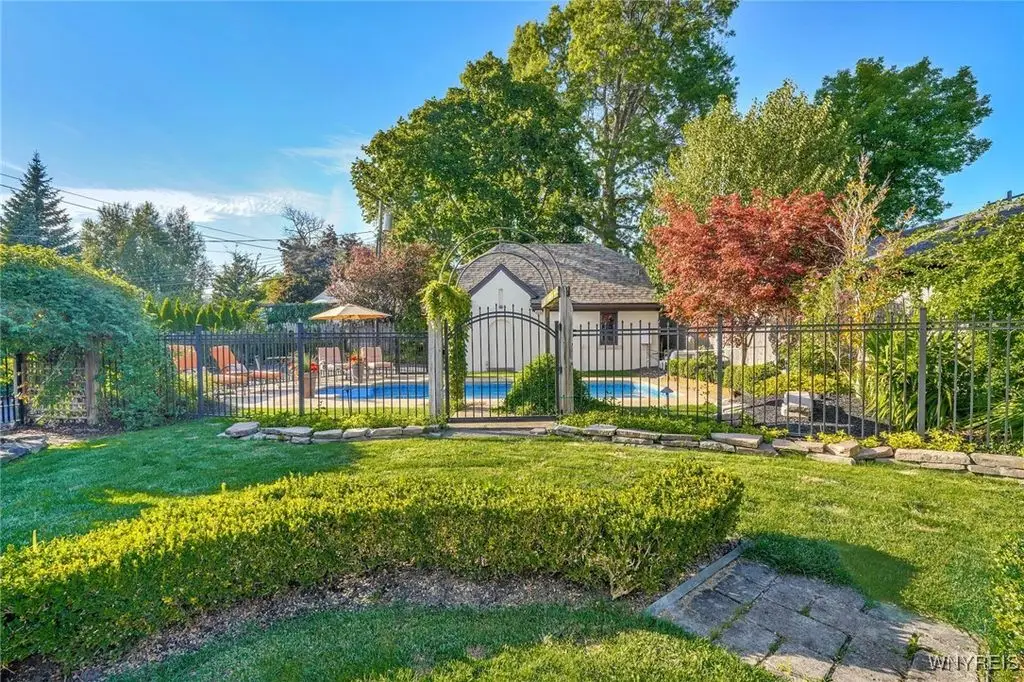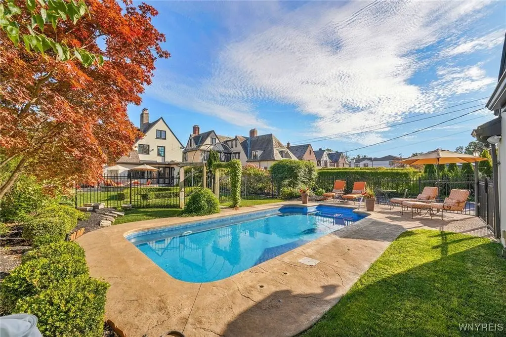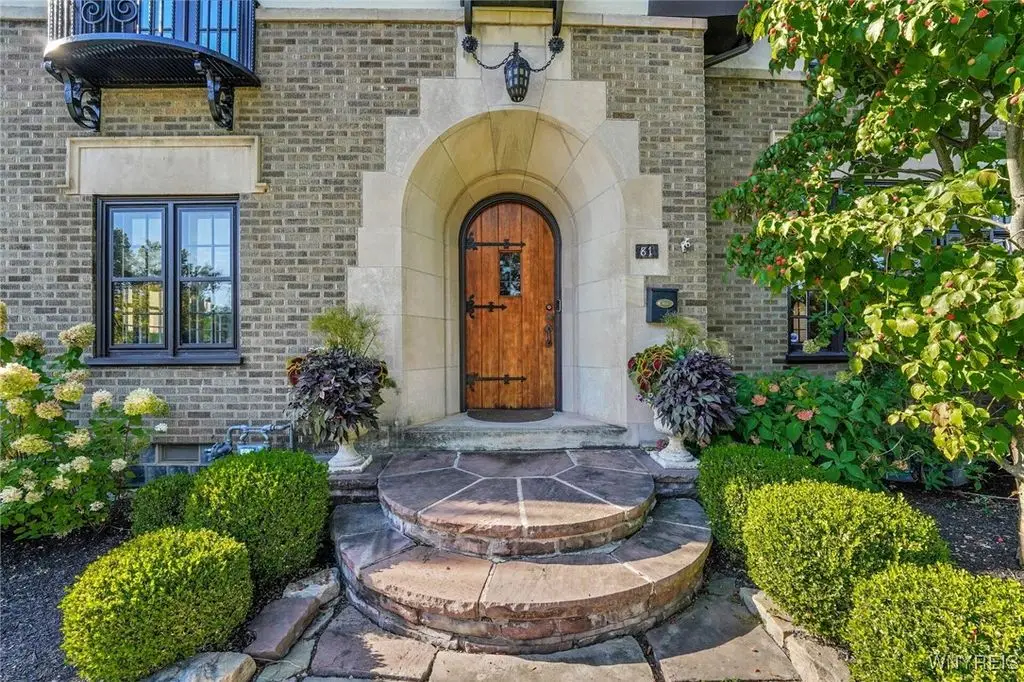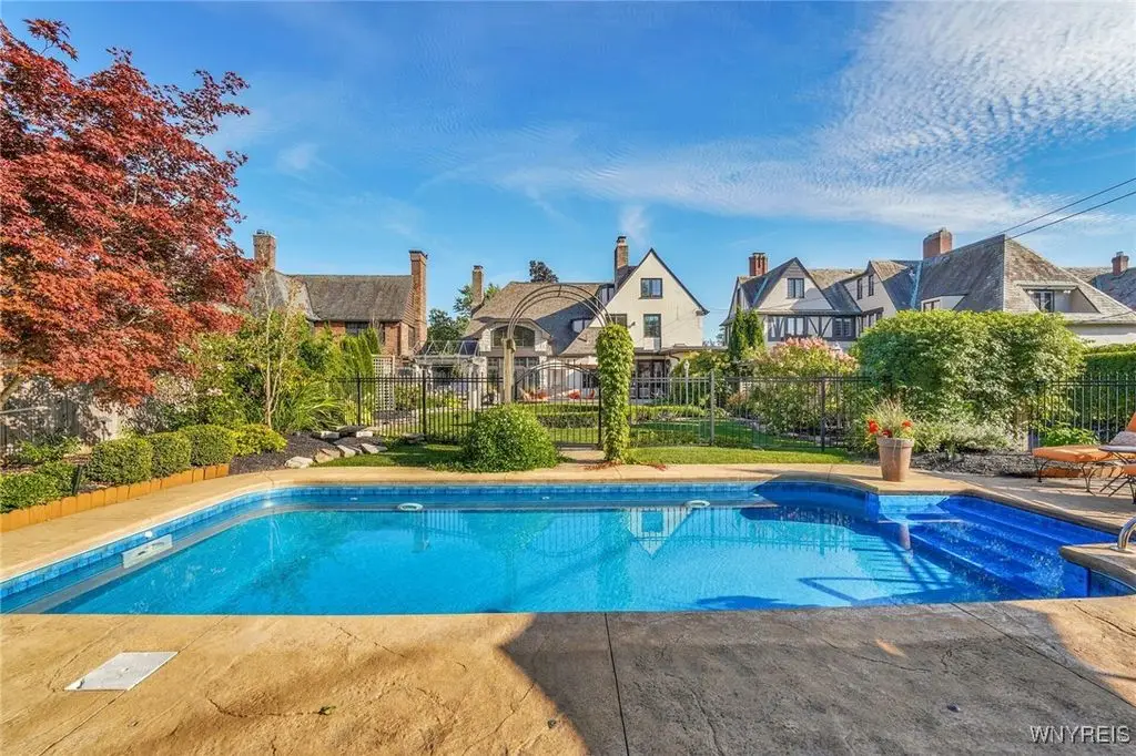 Timeless Elegance Meets Modern Luxury Across from Delaware Park at 81 Nottingham Terrace. Discover refined living in this stunning 4 bedroom, 3.5 bath Tudor estate, perfectly positioned across from Olmsted's historic Delaware Park. A seamless blend of classic architecture and contemporary upgrades, this home offers exceptional comfort and elegant style. The fully remodeled chef's kitchen is a showpiece, featuring premium appliances including a Sub-Zero refrigerator, Wolf range, Cove dishwasher, and a built-in coffee bar. Elegant Carrara marble countertops and a spacious island make it ideal for both cooking and entertaining. The kitchen opens to a bright breakfast room and offers a unique view into the climate-controlled wine cellar, which holds up to 1,000 bottles of wine. The formal dining room, adorned with its original chandelier, flows into a grand foyer. A spacious living room centers around a striking woodburning limestone fireplace, while the large modern family room features radiant heated floors and a loft above. French doors lead to a private courtyard patio, perfect for relaxing or hosting guests. The distinguished library/study offers warmth and character with a wood-burning fireplace and custom built-in bookshelves. Original hardwood floors and incredible woodwork throughout. Gorgeous staircases show the charm and character of this exquisite home. Upstairs, the luxurious primary suite includes three closets and a spa-inspired ensuite bath. The second bedroom opens to a Juliet balcony, and the third bedroom features a generous walk-in closet. The third-floor bedroom includes an additional full bathroom, ideal for guests or a private retreat. Outdoor living is equally impressive - enjoy a saltwater inground pool, a stone fire pit for cozy evenings, grilling area designed for effortless entertaining. Fully fenced electronic gated yard with sprinkler system. Updates include roof, boiler system ($30,000), Generac generator, and much more. This exceptional home combines historic charm, modern amenities, and resort-style outdoor living in one of Buffalo's most coveted neighborhoods.