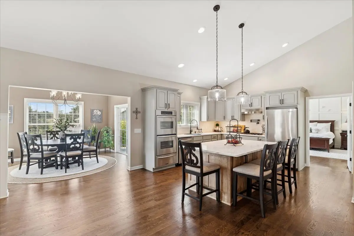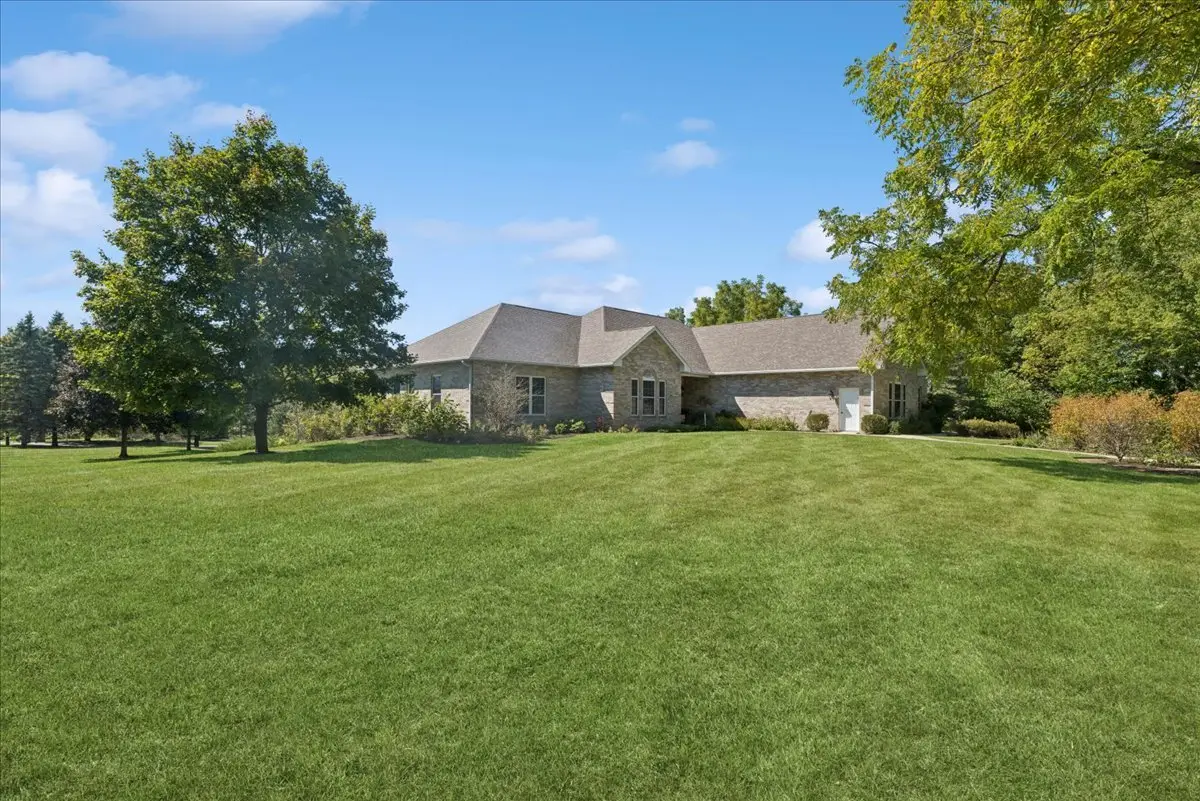 Absolutely stunning custom all brick ranch home with finished walk-out basement on 3.06 lush professionally landscaped grounds with native plantings. Home was completely remodeled in 2021 and initially inhabited 12/2021. An amazing 42x60 heated pole barn with concrete floor, 14' overhead door, mezzanine, and bath. 10 zone irrigation system, new composite deck 2022, new roof 2022, 4 season room, and stamped concrete screened in patio. Enter into the spacious foyer with custom cabinetry and porcelain flooring, professionally refinished chefs kitchen cabinets with custom maple island w/seating and quartz countertops. Shared floor 2 ceiling stone 2 sided gas fireplace between living room and kitchen. Vaulted or 9' ceilings thru out, custom mill work in family room, office, and primary bedroom, all new refinished or new hardwood flooring thru out. Open concept living with an abundance of natural light. Finished walkout basement offers a gaming area with wet bar, family room, exercise area, full bath and 3-4 person sauna, along with 2 additional bedrooms and 4 season sunroom with access to the screen patio. in 2022 a whole house back-up generator was added. A total of 5 bedrooms, 3 1/2 baths and 5744 finished sq ft of living space. 4 brick solar lighted pillars guide you through the 2 entrances and circular driveway. A truly amazing, move in ready home.