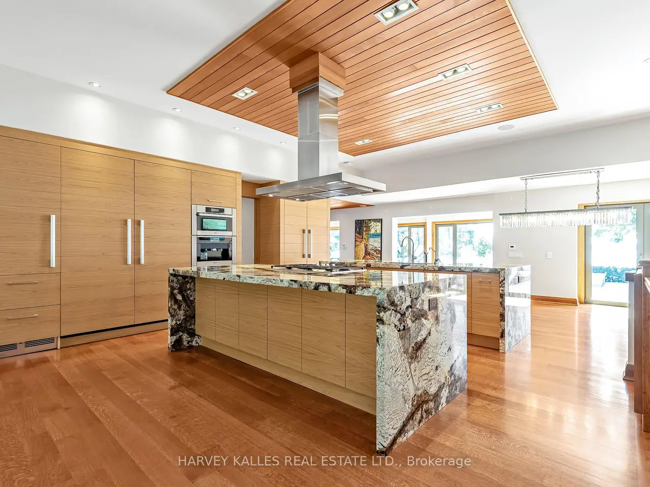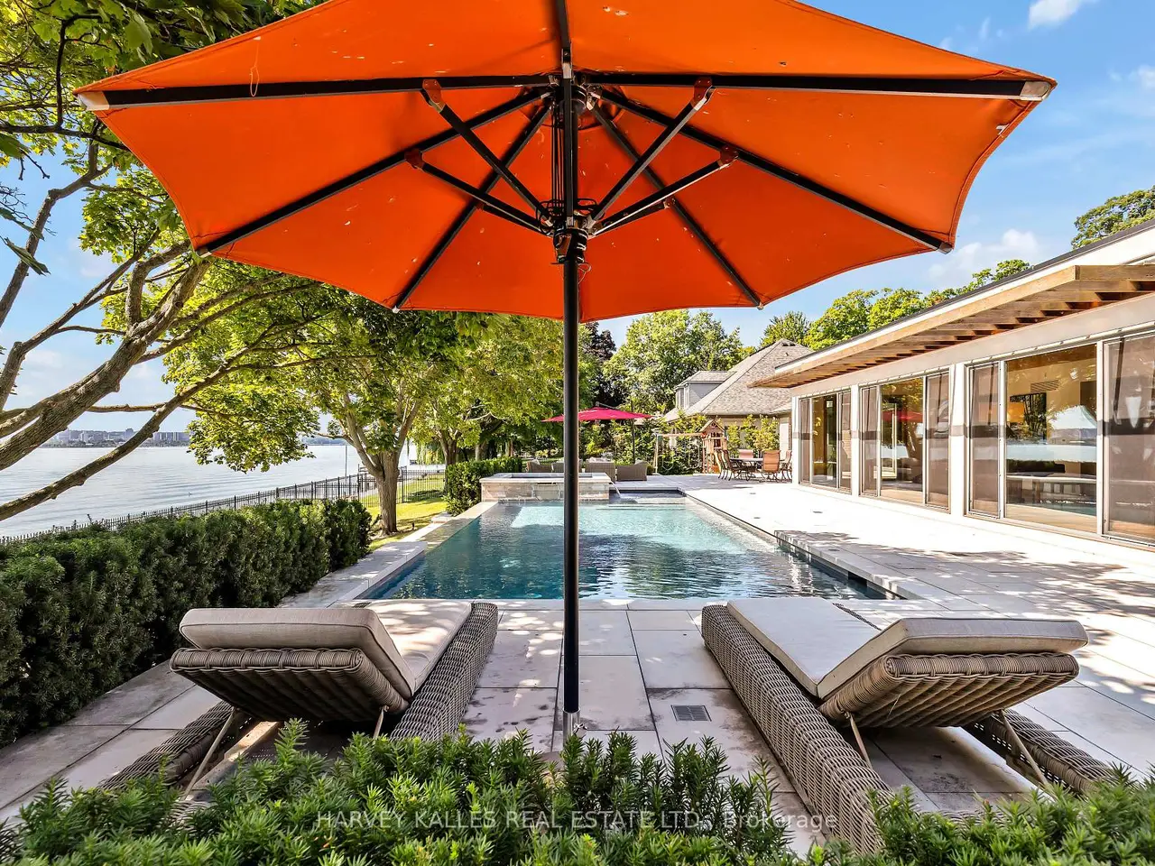 Exclusive and ultra-private, this street is home to many of Canada's most prominent families. Located on the shores of Lake Ontario, it has almost an acre, with Burlington and Oakville minutes away. The multi-million renovation on this bungalow has transformed it into an open concept West Coast modern aesthetic using natural materials of wood, marble, stone and granite. The architecture embraces the natural setting, offering multiple glass walk-outs to the water and views from all the principal rooms. The hot tub, pool with infinity edge overlooking the Bay is irresistible! One a few properties that are allows for a dock. Imagine this: after work, you pop into your boat or kayak for a quick workout before slipping into the hot tub. The Great Room has a book-matched marble floor-to-ceiling marble fireplace that is calling for a roaring fire on a winter’s night. The Observatory Room is special place, whether it is evening drinks or morning cappuccino you will find yourself drawn to sit and watch the lake. EXTRAS: Air exchanger, alarm system. Separate heating controls, hot water tank and irrigation system.