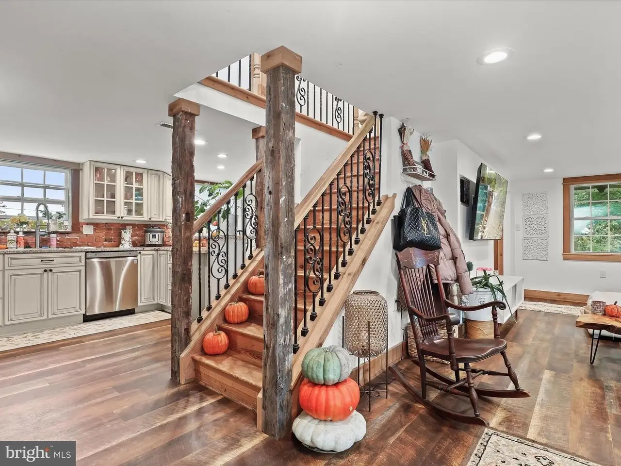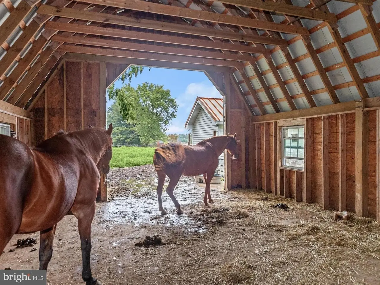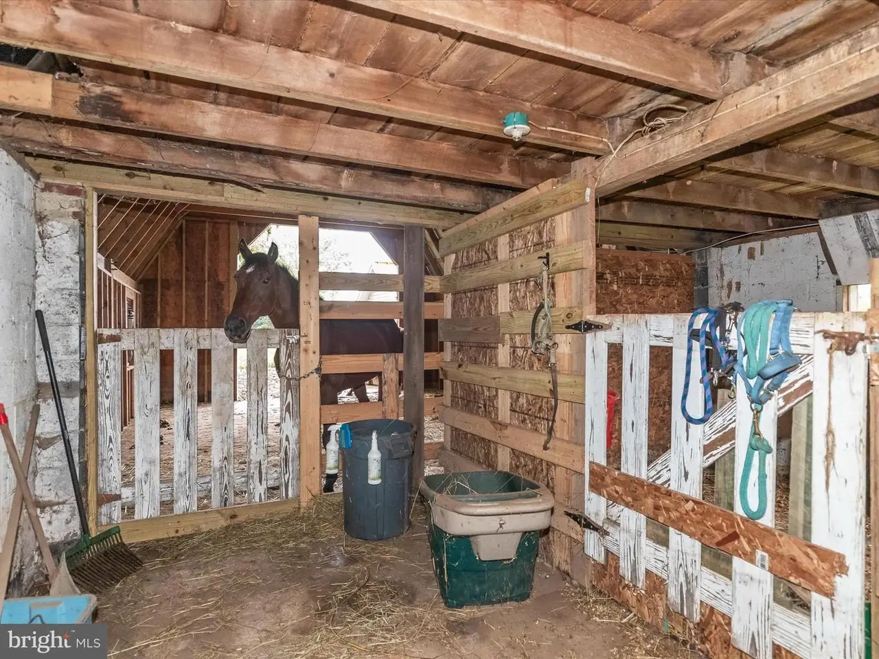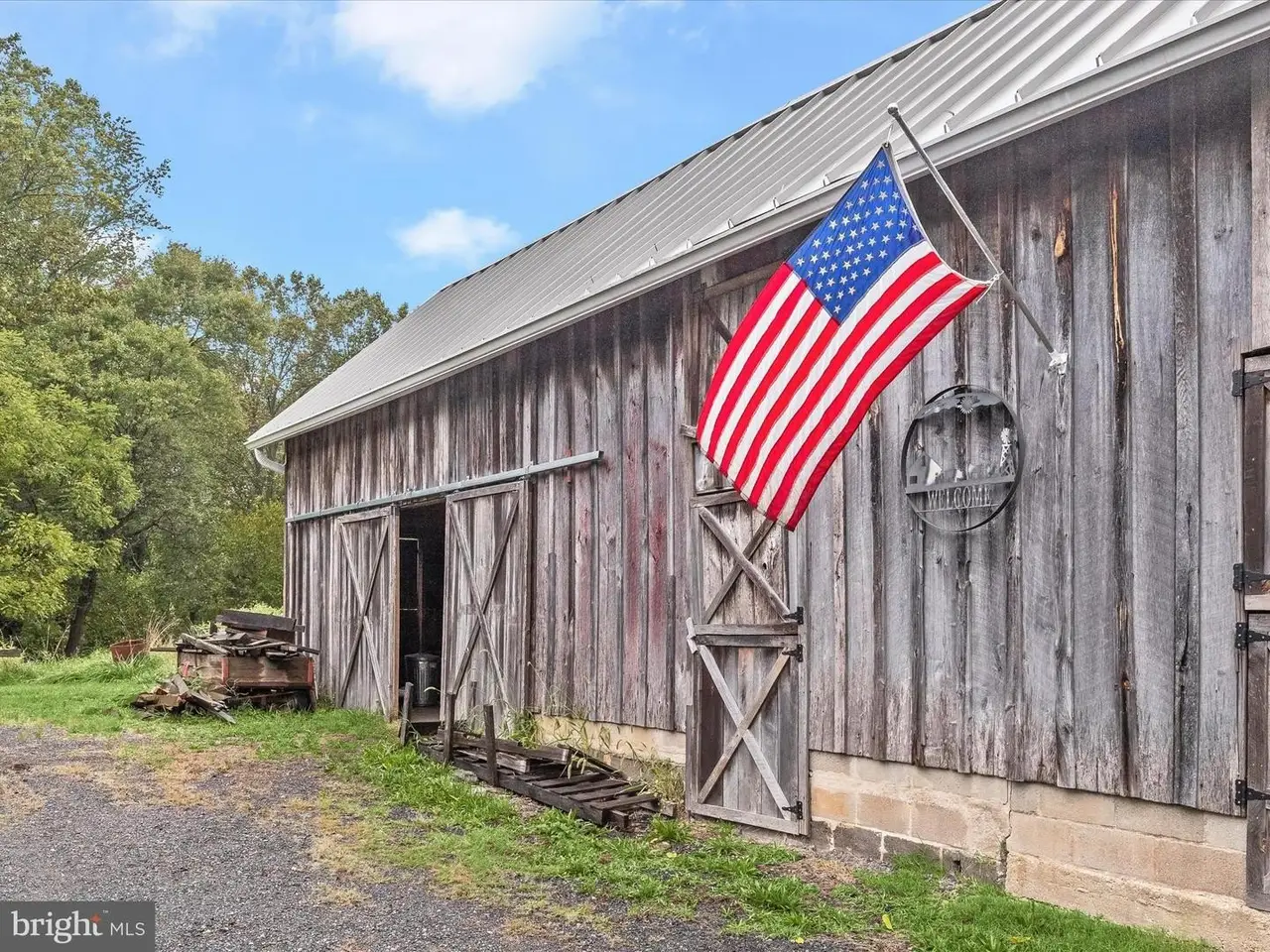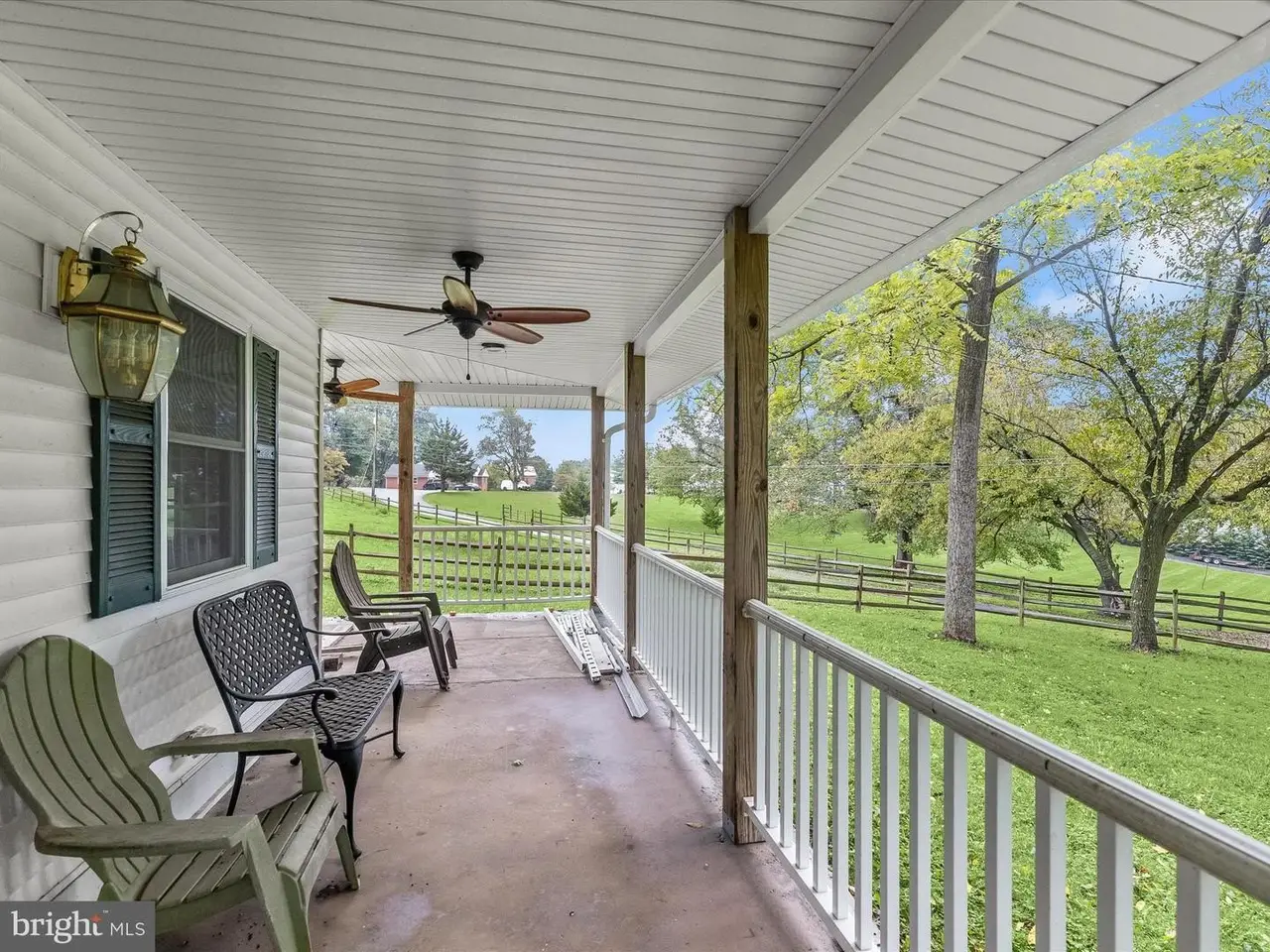 Nestled on a picturesque 10.86-acre pastoral lot, this charming farmhouse offers the perfect blend of rustic charm and modern amenities, featuring two bedrooms and a full bathroom. A welcoming covered wraparound front porch greets you, leading into a bright interior adorned with a neutral color palette, recessed lighting, and sun-filled windows complemented by luxury vinyl plank flooring. The open-concept main level showcases a relaxing living area and a dining space that boasts a brick fireplace with a wood-burning stove, perfect for cozy gatherings. The well-equipped kitchen impresses with stainless steel appliances, granite counters, a brick backsplash, soft-close cabinets, a breakfast bar, and a pantry. This level also includes a convenient laundry room, along with versatile unfinished storage and bonus rooms. Upstairs, you will find the two bedrooms and the full bathroom with a tub shower. A nook at the end of the hallway could easily function as an office or workout space with French doors that lead to the rear balcony. A utility room for additional storage completes the upper level. Outside, the expansive barn is equipped with electricity and two stalls that open into one of the fenced pastures. A separate shed provides even more storage. This retreat is ideal for those seeking tranquility and space to roam.