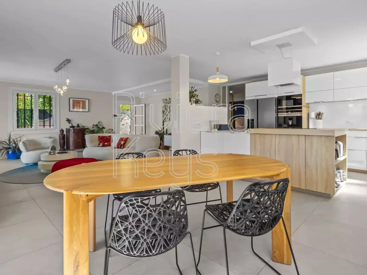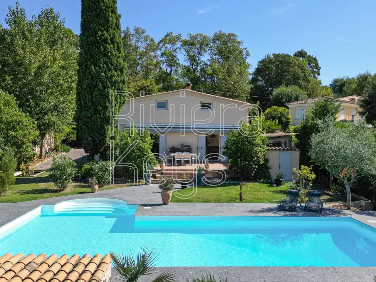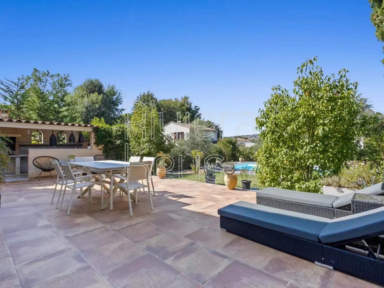 In a sought-after residential area, only 10 minutes from the Mediterranean, this 229 m² villa gracefully combines Provençal charm with contemporary features. Fully renovated with refined taste and high-end finishes, it impresses with its generous spaces and seamless flow between indoors and outdoors, enhanced by large bay windows opening onto a vast terrace. Its beautifully landscaped 2,000 m² garden, fully enclosed, peaceful, and completely private, offers an idyllic setting. A saltwater swimming pool (12 x 5 m) with shower and facilities, a summer kitchen, and a pétanque court invite both relaxation and conviviality. The ground floor features a spacious living room with insert fireplace and an elegant open-plan kitchen with central island. The night area offers 5 bedrooms, including two master suites on the ground floor, as well as three large bedrooms upstairs, accompanied by a bathroom with shower and toilet. An independent two-room apartment with terrace completes the property—ideal for hosting guests, extended family, or generating rental income. A double garage and ample outdoor parking spaces add further convenience to this exceptional villa.