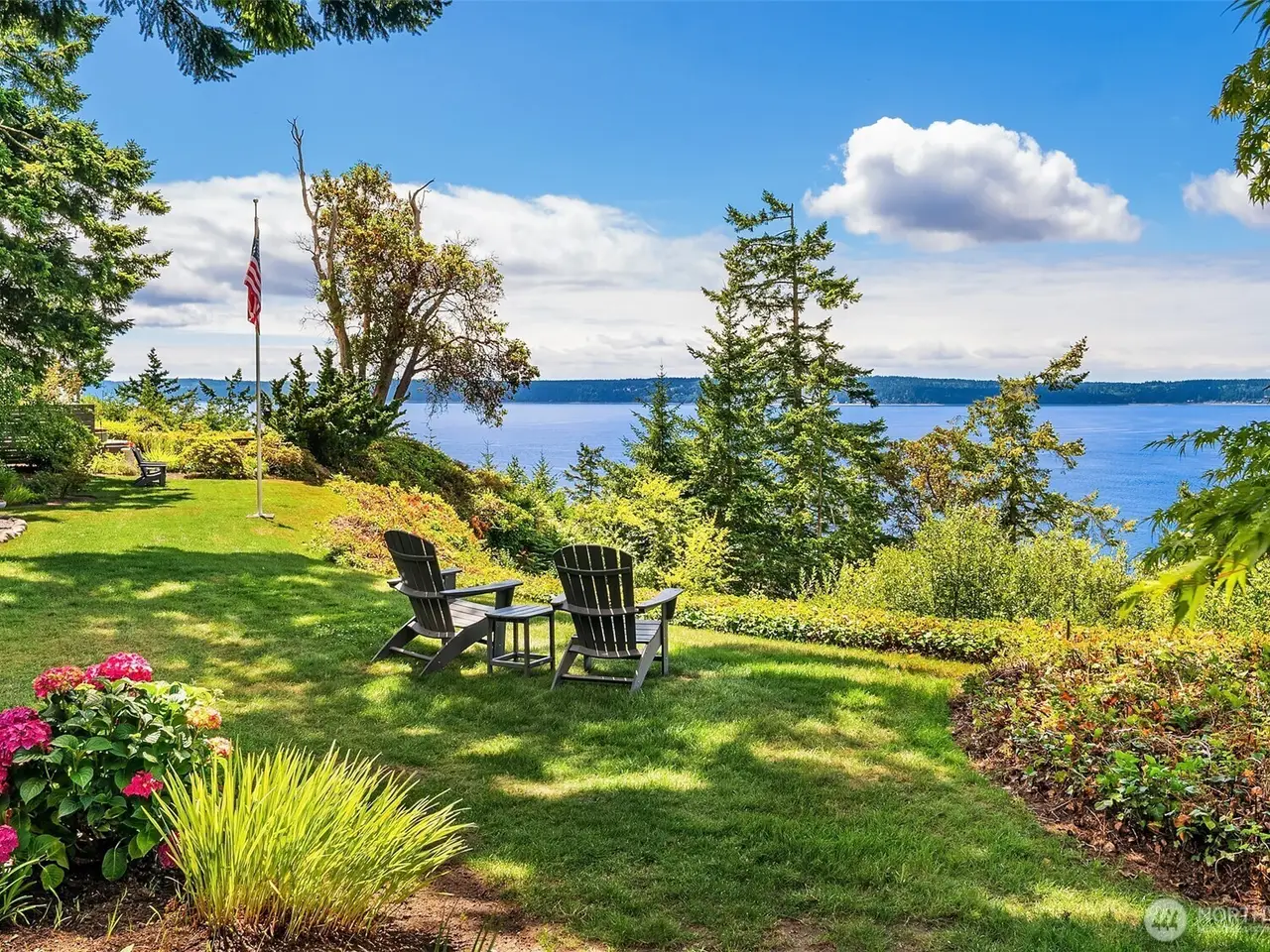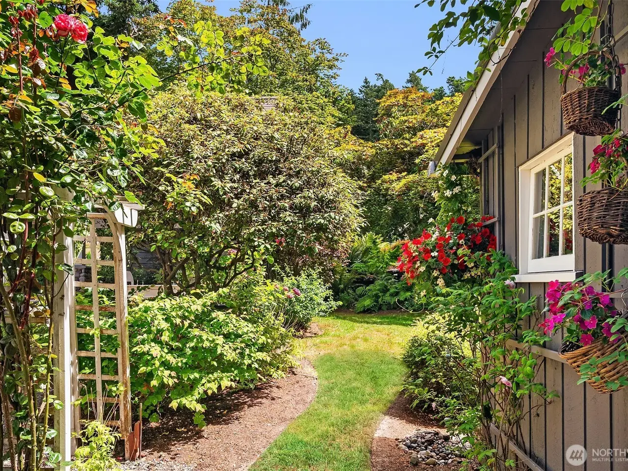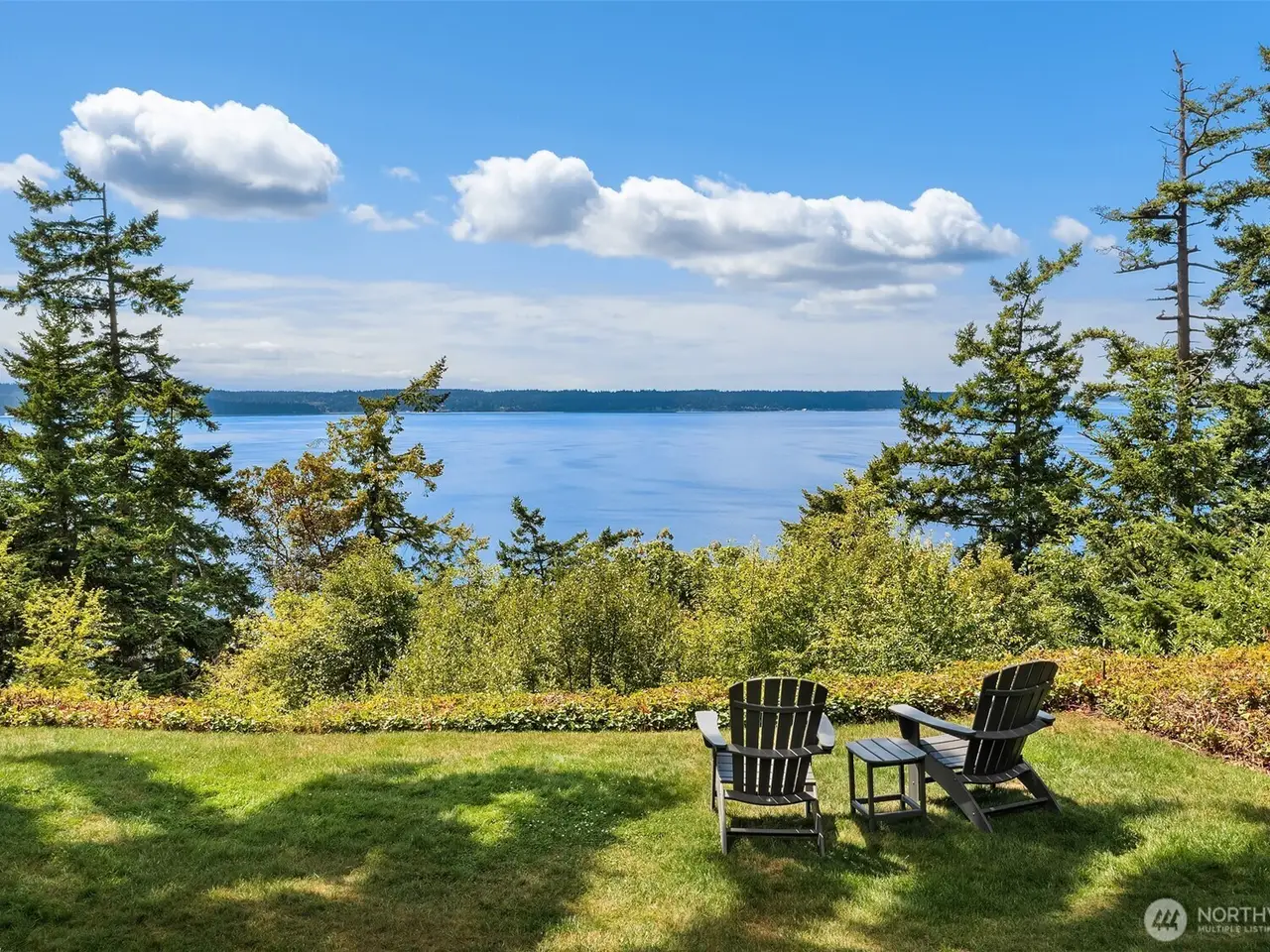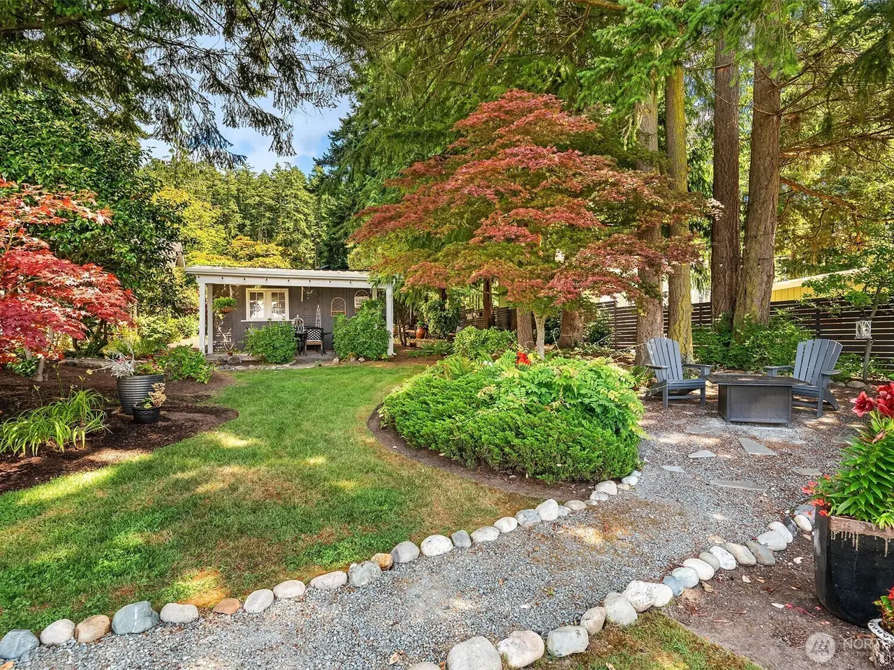 Set among lush gardens and framed by evergreens for privacy, this special home has desirable features around every corner. Understated luxury combined with privacy and unobstructed western views of Saratoga Pass, Olympics, and marine traffic. Designed for single-level living, the interior showcases thoughtfully designed spaces, new Wolf appliances (including micro), panel ready fridge, wine fridge, new roof, detached office, cottage shed, and huge deck together with multiple areas to relax and enjoy the yard. Enjoy the beach access footsteps away. 2 bedrooms + additional guest room. Carport and detached shop complete with a media lounge! Cross the bridge to Camano and feel the retreat vibe of the island-full time or part time. .