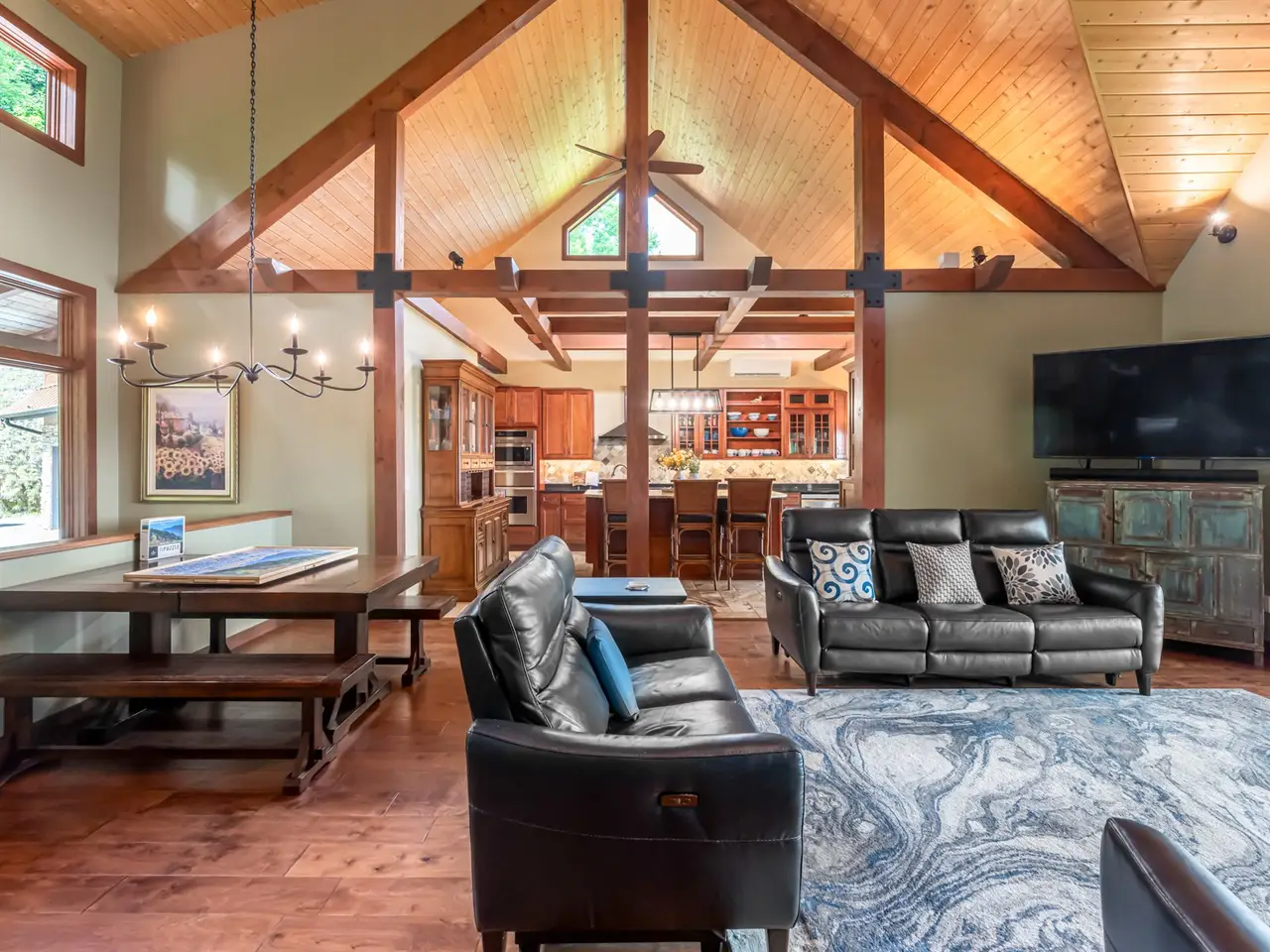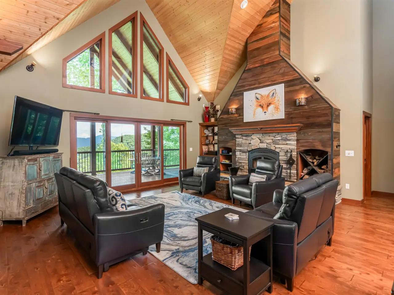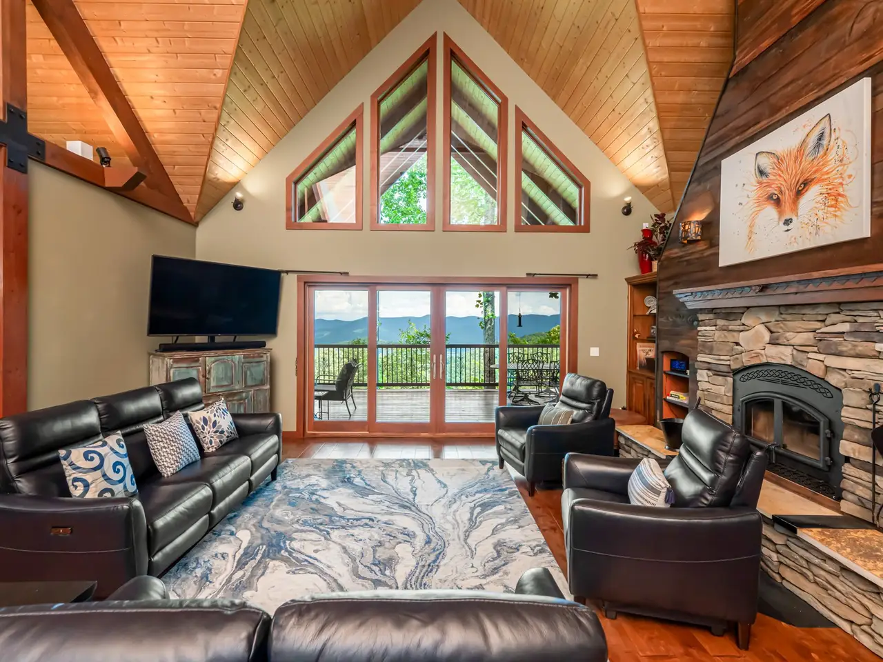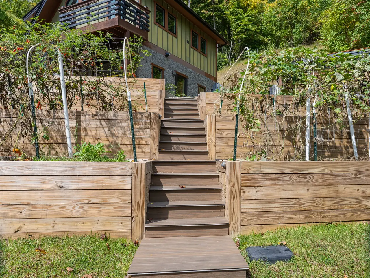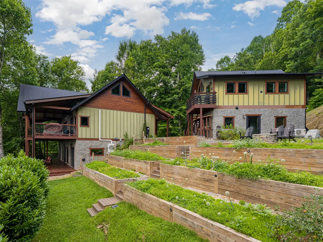 Year round views are stunning from this elevation of over 3500 feet. Main house has upper and lower primary en suites, a lower level entertainment room, additional bedroom/office with views and over 1500 feet of covered decks. The detached garage apartment and additional 2.24 buildable lot with views, makes this property impressive for large family or 3 rental income potentials. The outdoor enthusiast will enjoy the tiered garden area, small orchard, bees, fruit trees, and cutting your own wood for the stone fireplace in great room. Located inside the small, gated community of: The Bluffs at Curtis Creek and within a few miles to dining, shopping, new State Park, Blue Ridge Parkway and Asheville you can enjoy privacy with convenience.