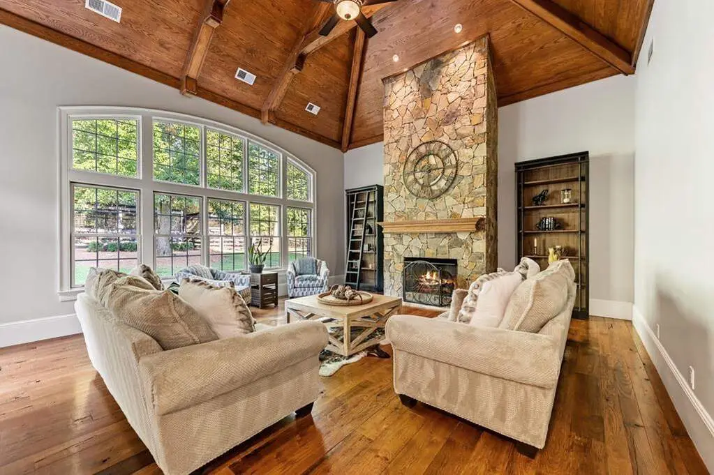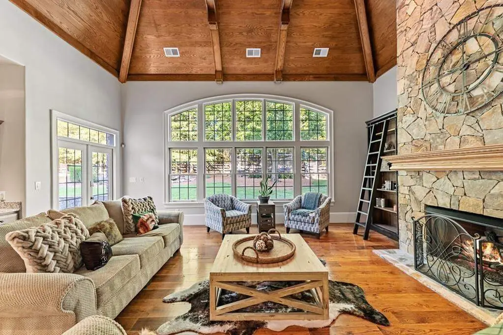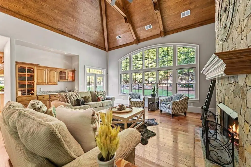 Expansive main living room with custom wood ceilings