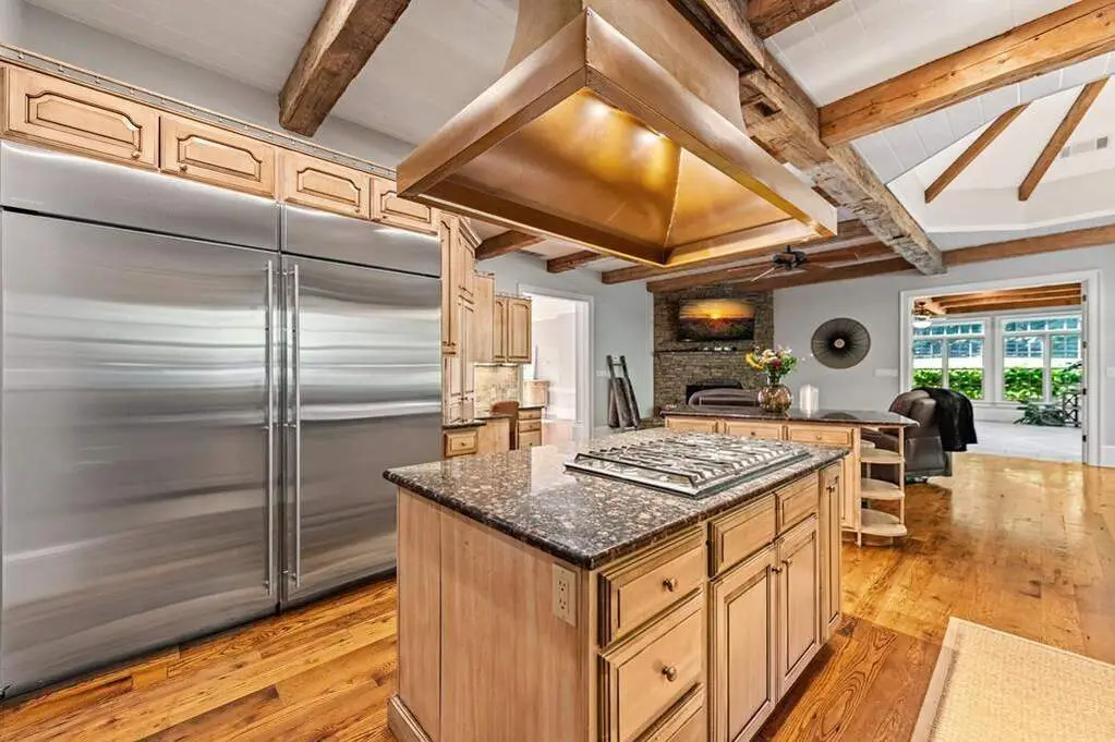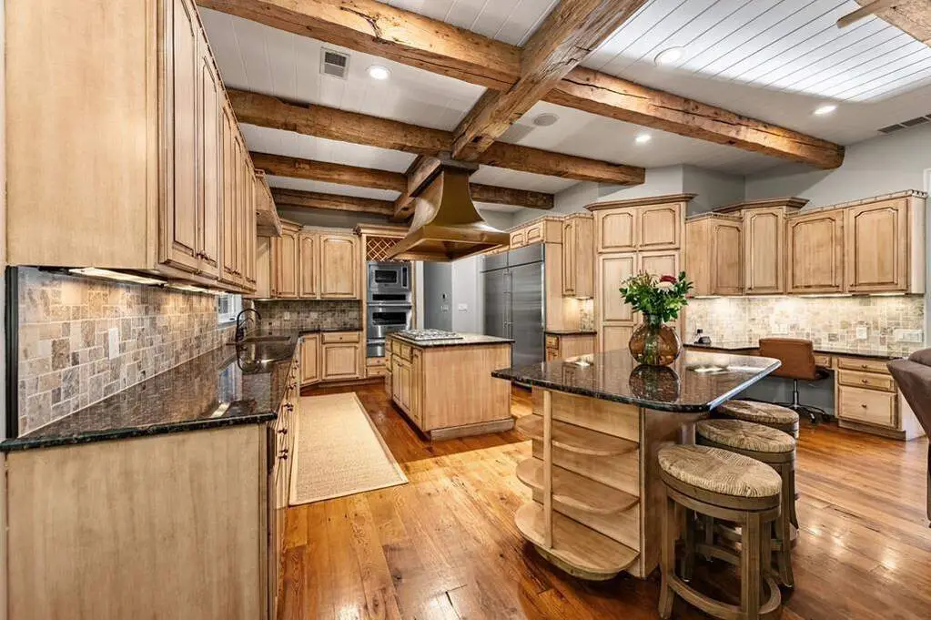 Chef's kitchen with wooden beams