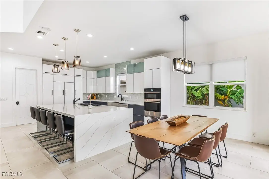 Step into timeless sophistication with this breathtaking riverfront estate, a residence that seamlessly blends modern luxury with effortless coastal living. Meticulously remodeled in 2022 and offered furnished, this home invites you to begin living the signature Florida lifestyle from the moment you arrive. Boasting 5 spacious bedrooms plus a den, 5 and a half luxurious baths, and a 4-car garage complete with an air-conditioned workshop, every inch of this property has been thoughtfully crafted to deliver elegance, comfort, and functionality. A new tile roof, impact-resistant windows and doors, and a chef's kitchen showcasing exquisite quartz surfaces, a waterfall-edge island, and curated cabinetry elevate this home into a class of its own. The expansive great room is drenched in natural light, showcasing panoramic views of the River through walls of glass. A double-sided fireplace anchors the space, creating a warm ambiance ideal for intimate evenings or elegant gatherings. Two grand master suites offer the ultimate in privacy and indulgence-each with a screened in private balcony, spa-inspired baths, freestanding soaking tubs, and custom walk-in closets. Floor-to-ceiling windows frame uninterrupted river views, evoking the serenity of a private resort. An elevator ensures ease of access to every level, while a state-of-the-art media suite-complete with a full bar-provides the perfect venue for entertaining, movie nights, or can serve as a private guest or in-law suite. The outdoor living space redefines relaxation and recreation with a heated infinity-edge pool, spa, and multiple areas for open-air lounging and dining. For the boating enthusiast, this property is a dream come true-featuring a new 20,000 lb. boat lift and a Trex captain's walk dock that accommodates large vessels with ease. Beyond its architectural beauty, this home also presents a remarkable investment opportunity. Operating as a high-end, income-producing Airbnb, it has hosted full weddings and exclusive events, consistently attracting luxury clientele drawn to its blend of elegance, privacy, and waterfront allure. With its captivating riverfront setting, masterful design, and unrivaled amenities, this residence embodies the pinnacle of Southwest Florida luxury living-an exquisite sanctuary offering both an extraordinary lifestyle and exceptional income potential.