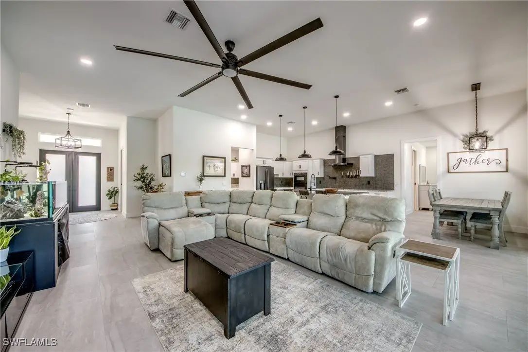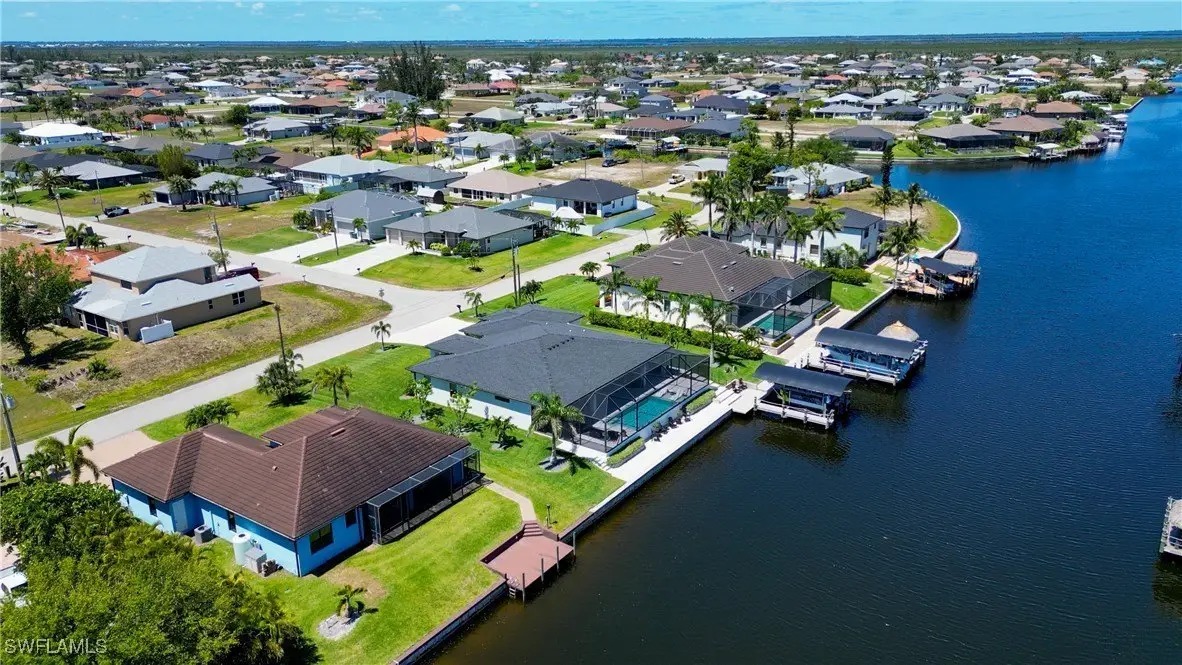 Stunning, 3-lot site custom pool home with over 2600 sq ft and exceptional water views in NW Cape Coral! Built in 2022, this 5 bed/2.5 bath, 1000 sq ft 3-car garage home was built to the highest standards, exceeding Miami/Dade County regulatory codes. LOMR-F has been applied for and will be approved within 60 days. The property will then be labeled "NOT in a Flood Zone". The home is further secured with hurricane impact glass doors and windows and prewired for a whole-house generator. From extra tie trusses to the concrete-filled pool cage uprights reinforced with 5/8 " rebar, the builder spared no expense in safeguarding your future investment! Custom designed from top to bottom and with gorgeous wall to wall windows and sliders, this home offers the very best in luxury waterfront living. From the open-concept chef's kitchen, spacious great room and spa-like primary bath to the backyard oasis, there's something for everyone. Gourmet kitchen features include: a whole home R/O system, an expansive full slab granite island with high top breakfast bar, a black composite double sink and designer backsplash, a convenient pot filler and magnetic knife holder, soft shut cabinetry with wide, pot-holding drawers and a corner Lazy Susan. Additionally, the home uses cable fiber and has a whole house integrated WIFI system and is even wired for network drops. Directly off the kitchen is a delightful butler's pantry and coffee bar with a separate walk-in pantry for food storage. The laundry extends into a multi-use area with a W/D, a 2nd refrigerator, a half bath and sink and a laundry folding and storage station. The primary bedroom is open and airy with lanai access and an ensuite bath that boasts a double vanity and makeup table, a large walk-in closet and a free-standing soaking tub and oversized granite surround shower. The secondary bedroom also enjoys lanai access, a walk-in closet and an ensuite bath that has a pool entrance as well. There are 3 more ample sized guestrooms with one located at the front of the house - perfect for a home office or den. Outdoors is a true boater's paradise! Enjoy the breathtaking, extra-wide and intersecting canal views from the pristine deck, the Captain's Walk and boat dock along with its new canopy cover and 10,000 lb lift. Or enjoy lounging on the expansive lanai and covered patio or taking a dip in the sparkling, heated 12x31 pool with its sun shelf entry, bubblers and swim up granite barstools. Surrounded by lush, mature landscaping in a private and quiet setting. Electrical has been added for an outdoor kitchen and plumbed for an outdoor shower as well as wired for outside security cameras. Endless possibilities to make this home your own. Schedule a private showing today!