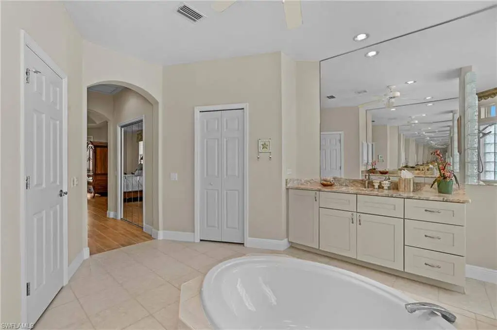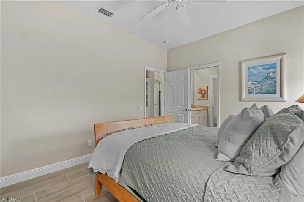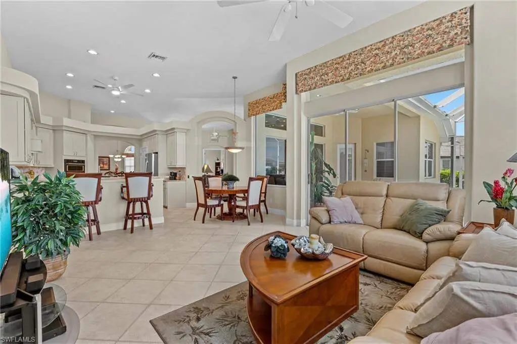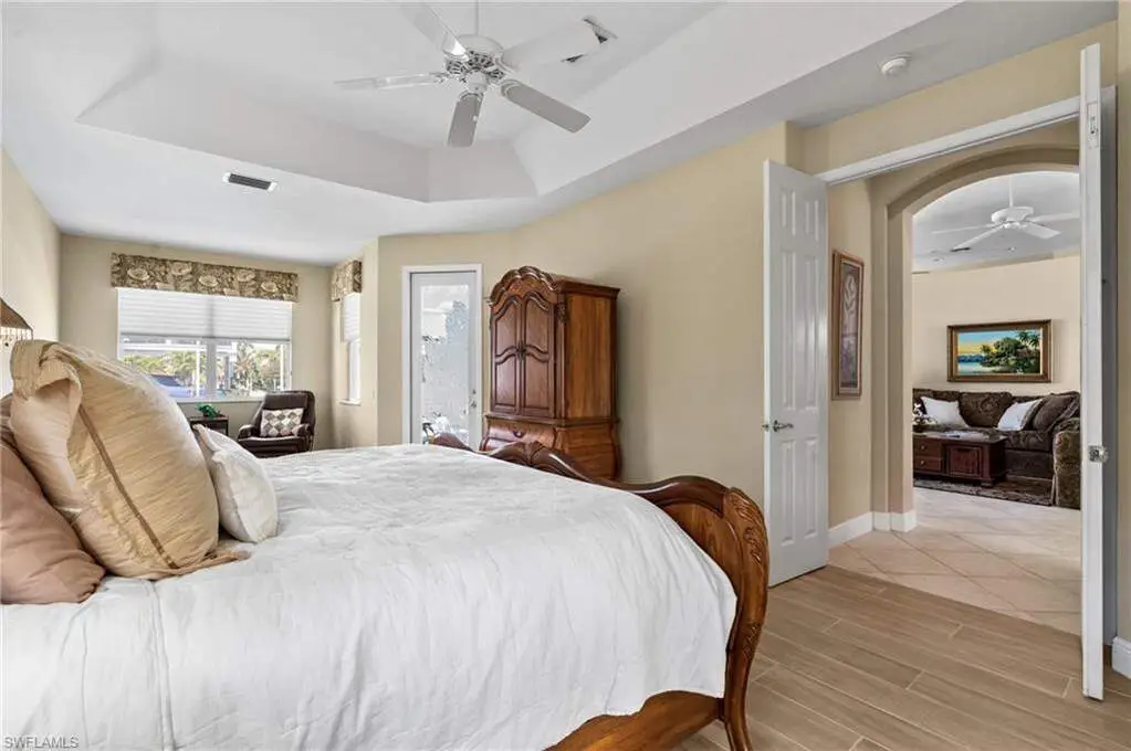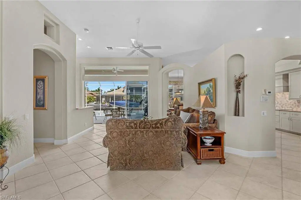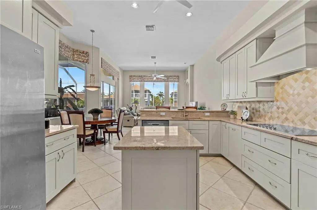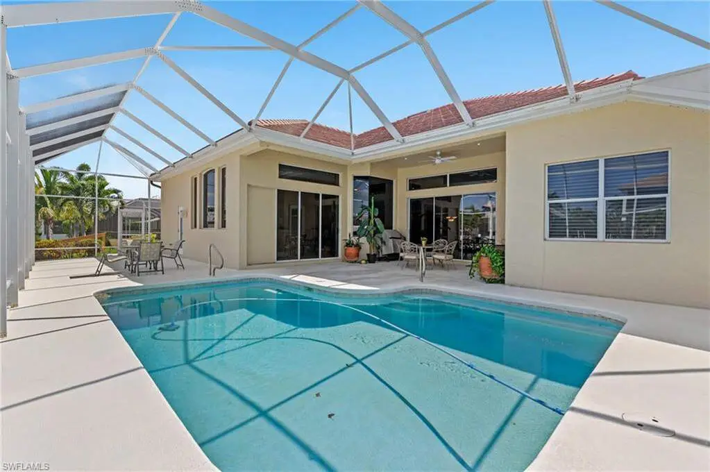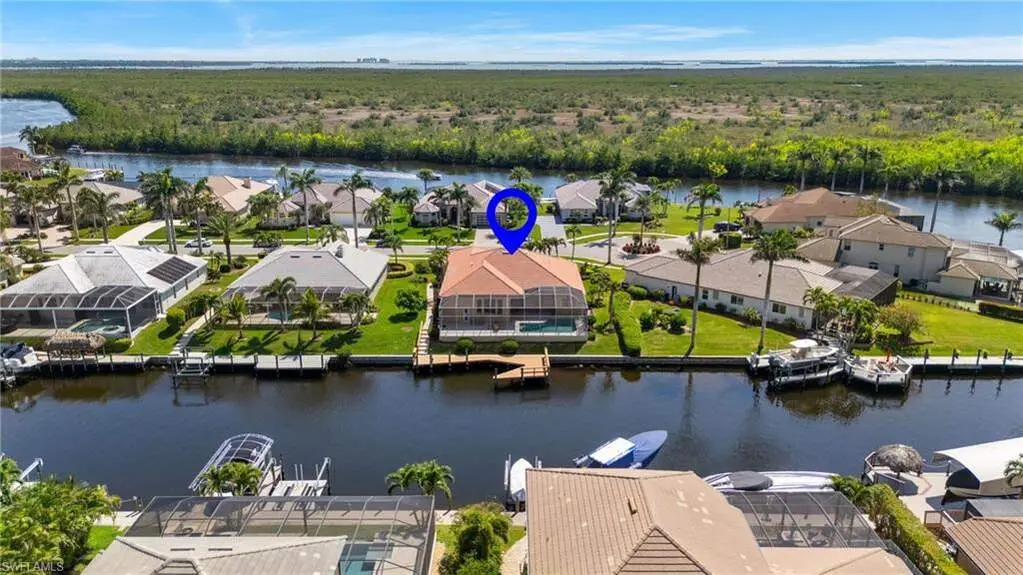 Welcome to your dream home in Cape Harbour, where luxury, comfort, and coastal living come together in perfect harmony. Nestled within one of Southwest Florida's most prestigious waterfront communities, this stunning pool home offers the ideal blend of elegance and ease. Known for its scenic canals and direct Gulf of Mexico access, Cape Harbour is a paradise for boaters and water enthusiasts alike. As you arrive, you'll be captivated by the curb appeal of this expansive 4-bedroom + den, 3.5-bath, 3-car garage residence, offering over 5,000 square feet of indoor and outdoor living space. Step through custom etched glass French doors into a grand formal living area where soaring ceilings and sliding glass doors frame views of the pool and canal. A built-in wet bar with a beverage refrigerator makes entertaining effortless. The updated kitchen is a chef's delight, featuring shaker-style cabinetry, a custom range hood, tile backsplash, granite countertops, stainless steel appliances, a pantry, and a large center island perfect for gatherings. The kitchen opens seamlessly to a bright eat-in area and spacious family room, where disappearing sliding glass doors invite the outdoors in and fill the space with light and tranquil waterfront views. The home also features a formal dining room, a versatile den or home office, and a stylish half bath for guests. The primary suite is a private retreat, featuring new plank tile flooring, a tray ceiling, a generous sitting area, and private pool access through an etched glass door. Wake each morning to water views and unwind in the spa-inspired bath, complete with two walk-in closets, an oversized soaking tub, dual vanities with new sinks, and a walk-through shower with a teak seat. The guest bedrooms are equally inviting, with two sharing a Jack-and-Jill bath and the third enjoying a private ensuite that also serves as the pool bath. All guest rooms feature wide plank tile flooring, and two have walk-in closets. Step outside to the oversized screened lanai, which spans the full length of the home and offers ample space for lounging, dining, and entertaining under the Florida sun. A short stroll takes you to your private composite boat dock, where you're just minutes from open water-perfect for boating and fishing. Recent updates include a new roof ('23) and new AC system '(24), providing peace of mind and long-term value. Located on a quiet cul-de-sac, this home also offers access to Cape Harbour's resort-style amenities, including a marina, pools, fitness center, and a vibrant social scene. Stroll through the walkable waterfront village, featuring boutique shopping, waterfront dining, live music, and spectacular sunsets-all just steps away. This home is being sold turnkey and includes a transferable flood policy, so you can move right in and start enjoying the Florida sunshine. More than just a residence, this is a lifestyle-where every day feels like a vacation!