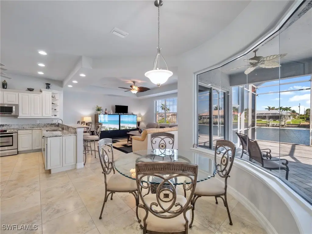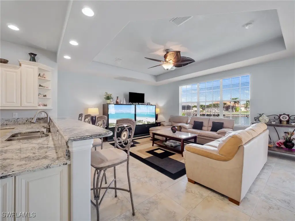 Minutes to Open Water! Beaches Close By! This unique, custom built healthy home features 5 bedrooms plus an office and is a rare gem offering Gulf access via a 210 ft wide canal. It includes a 116 ft concrete seawall and a private dock, is a true haven for boaters and water lovers. Imagine waking up to serene water views and enjoying breakfast by the waterfront. Relax in your private jacuzzi, go kayaking or fishing right from your backyard or take a peaceful boat ride to stunning beaches where you might spot dolphins and manatees! This home offers endless outdoor fun and is conveniently located near A rated schools. Located in one of the most desirable and private neighborhoods in SW Cape Coral, Florida, this safe and friendly community is perfect for walking, biking and enjoying a lifestyle like no other in the world! Designed for elevated waterfront living with peace of mind, this well maintained, solidly built home has never flooded, even during storms or hurricanes. It is designed for both beauty and resilience, with hurricane impact windows on the second floor and shutters on the first. Inside, the home welcomes you with a grand entryway with 17 ft ceilings, ample living space, including a formal living room with 24 ft ceilings and dining room 13 ft ceilings. It offers 5 bedrooms, a large office (or gym) 13 ft tray ceilings, 3.5 bathrooms, a beautiful kitchen with granite countertops and newer appliances, a generous breakfast coffee bar, a water view breakfast nook, a spacious pantry and an area designed for a future elevator, laundry room with cabinets and sink and a 2.5 car garage with 12 ft ceilings. A beautiful staircase connects two loft areas, one on the main level and another upstairs, offering flexible spaces for lounging. The upstairs loft leads to the private, water view primary suite (16x16 ft), which features 10 ft tray ceilings and a screened balcony overlooking the canal. The suite includes his and her walk in closets and a spacious master bath with a large double sink vanity, a third separate vanity with a single sink, a central soaking tub, a large shower with built in seating and a linen closet. Oversized custom pool with a 6 jetted spa and a newer, expansive tall screened lanai, perfect for enjoying serene waterfront views in comfort and style. Inside this lovely home you will have abundant light, storage and generous ceiling heights throughout. Additional spacious driveway that can accommodate up to 7 cars. This waterfront home is a perfect blend of durability, expansive living spaces and waterfront appeal. Just minutes from Cape Harbor, Rumrunners, shops, Tarpon Point Marina, waterfront restaurants, supermarkets, ice cream shops, coffee shops, the post office, pharmacy, medical offices and more. All located in one of the most desirable areas of SW Cape Coral! This is your chance, take it! Schedule your private tour today and experience everything this home has to offer.