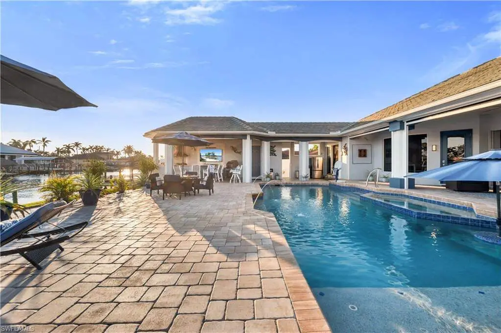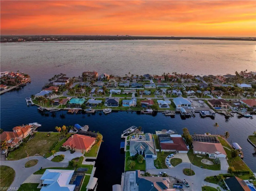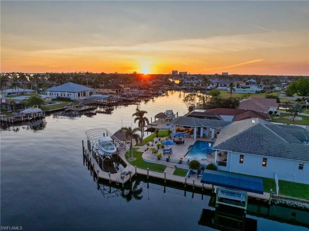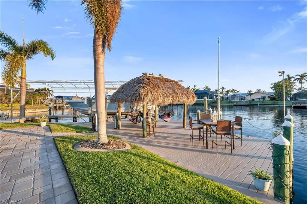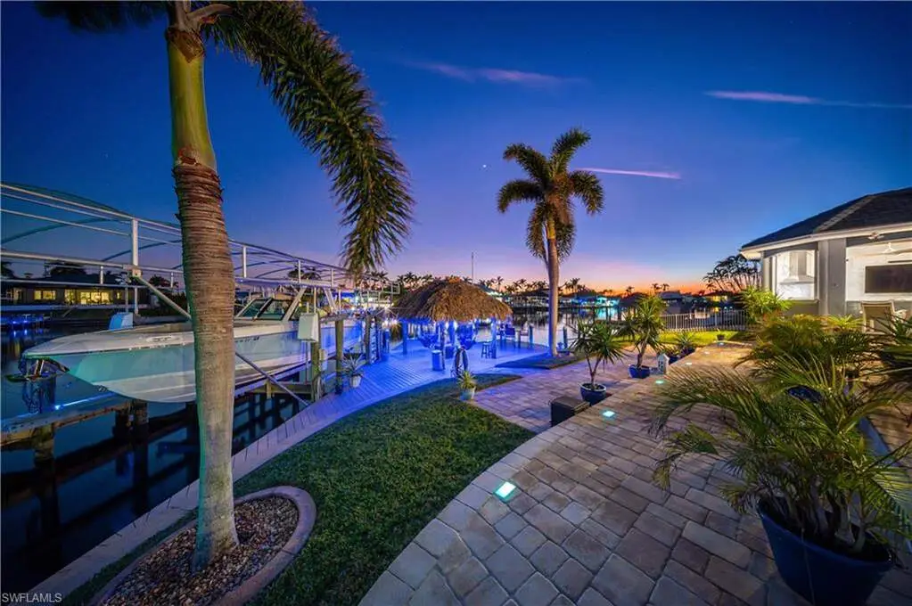Welcome to 5374 Congo Court, a rare waterfront gem tucked away on a coveted corner lot in Cape Coral's desirable Yacht Club neighborhood. With 235 feet of intersecting canal frontage just steps from the river, this home is a boater's dream. A full wrap-around dock accommodates multiple vessels up to 55 feet and includes jet ski lifts for effortless access to the water. Designed for indoor-outdoor living, the expansive lanai showcases a massive 45-foot pool, outdoor kitchen, and bar - the perfect backdrop for entertaining or quiet relaxation. Inside, soaring 15-foot ceilings and walls of glass flood the great room with natural light and frame panoramic water views from every angle. The 3-bedroom, 3-bath residence is equipped with thoughtful upgrades including a whole-home generator powered by a 500-gallon propane tank. Mature tropical landscaping and swaying coconut palms complete the sense of privacy and paradise. Opportunities like this don't come along often. With motivated sellers and one of the best water lots in the Yacht Club, this home delivers an unbeatable blend of lifestyle, location, and value.