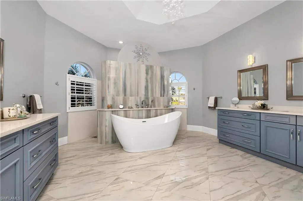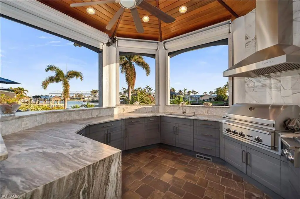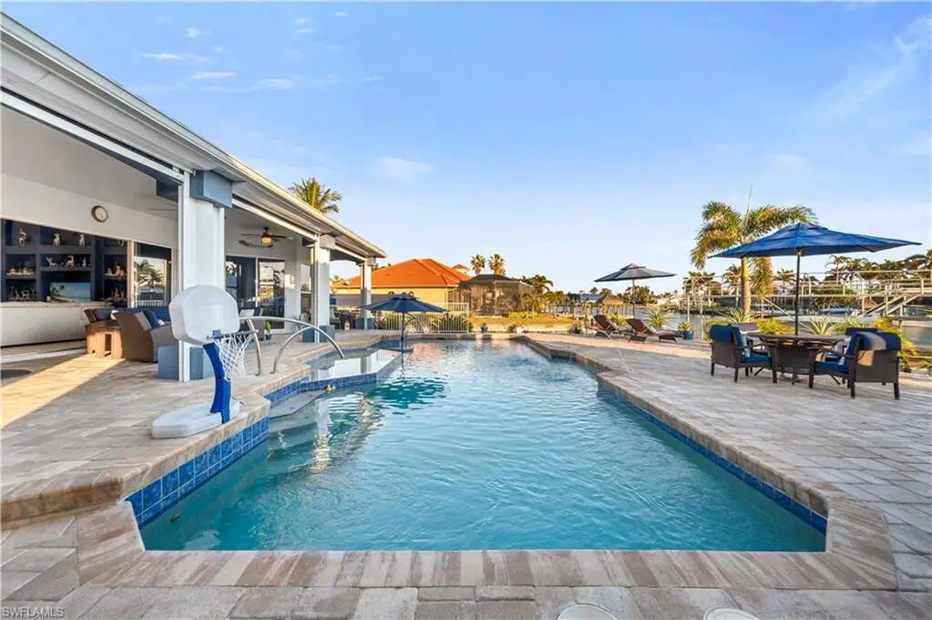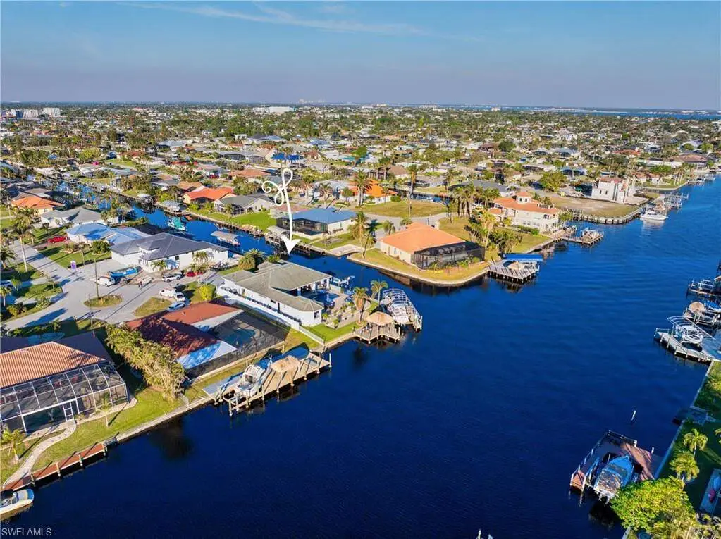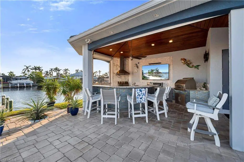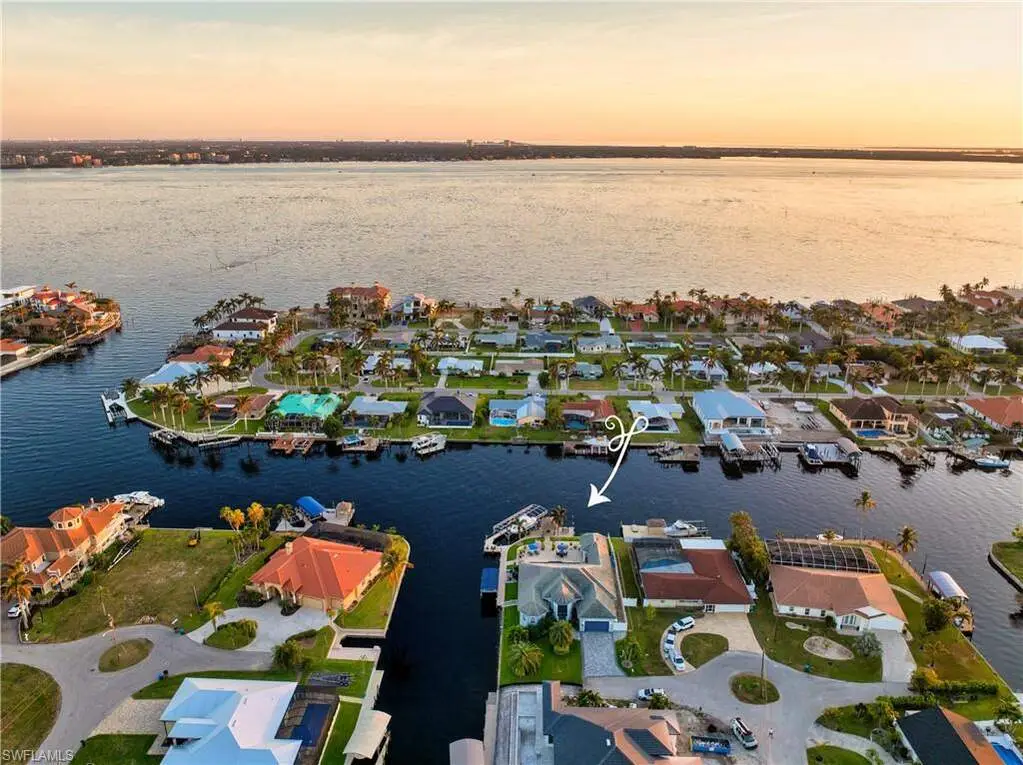 Welcome to 5374 Congo Court, a rare waterfront gem tucked away on a coveted corner lot in Cape Coral's desirable Yacht Club neighborhood. With 235 feet of intersecting canal frontage just steps from the river, this home is a boater's dream. A full wrap-around dock accommodates multiple vessels up to 55 feet and includes jet ski lifts for effortless access to the water. Designed for indoor-outdoor living, the expansive lanai showcases a massive 45-foot pool, outdoor kitchen, and bar - the perfect backdrop for entertaining or quiet relaxation. Inside, soaring 15-foot ceilings and walls of glass flood the great room with natural light and frame panoramic water views from every angle. The 3-bedroom, 3-bath residence is equipped with thoughtful upgrades including a whole-home generator powered by a 500-gallon propane tank. Mature tropical landscaping and swaying coconut palms complete the sense of privacy and paradise. Opportunities like this don't come along often. With motivated sellers and one of the best water lots in the Yacht Club, this home delivers an unbeatable blend of lifestyle, location, and value.