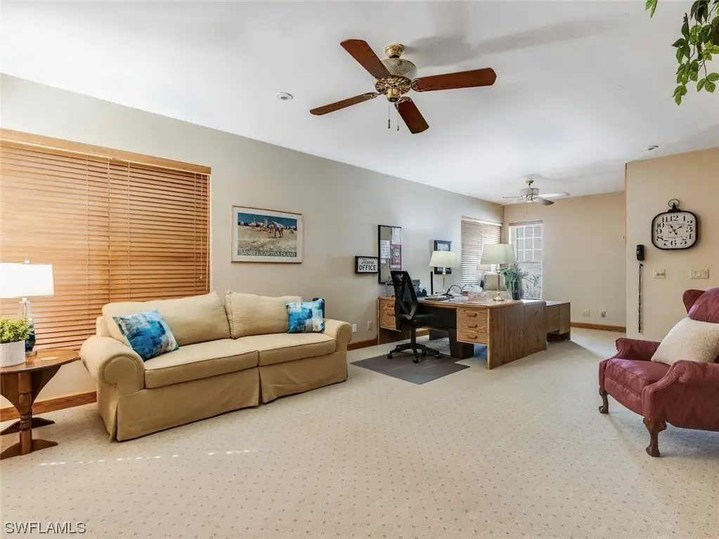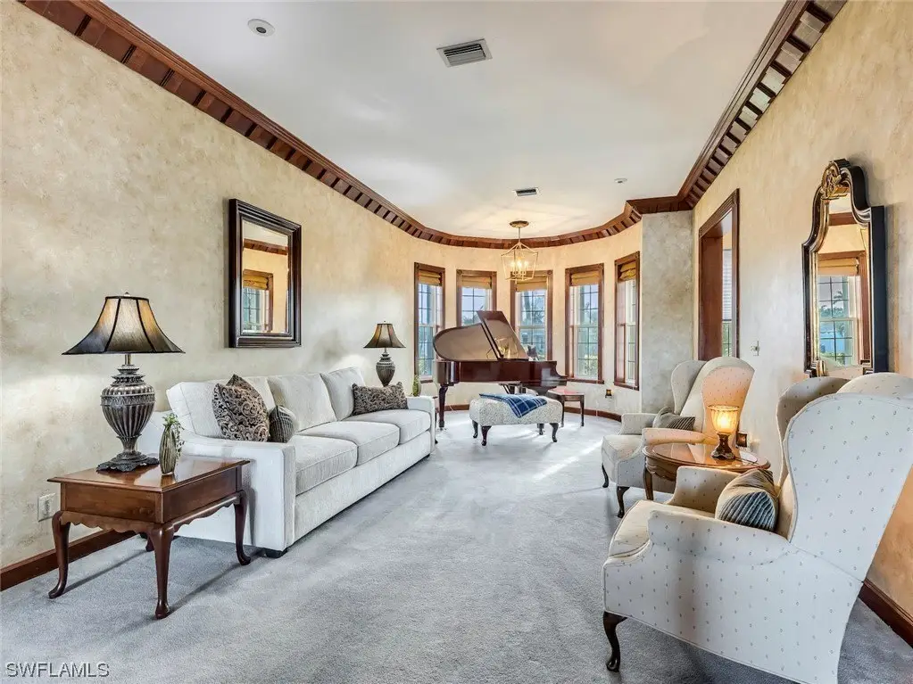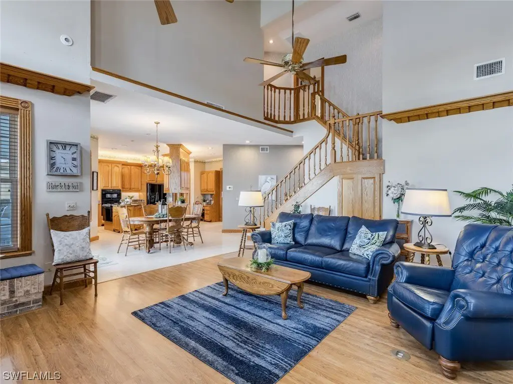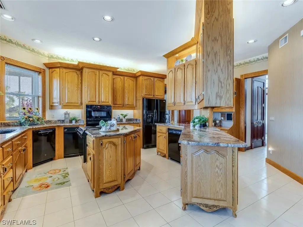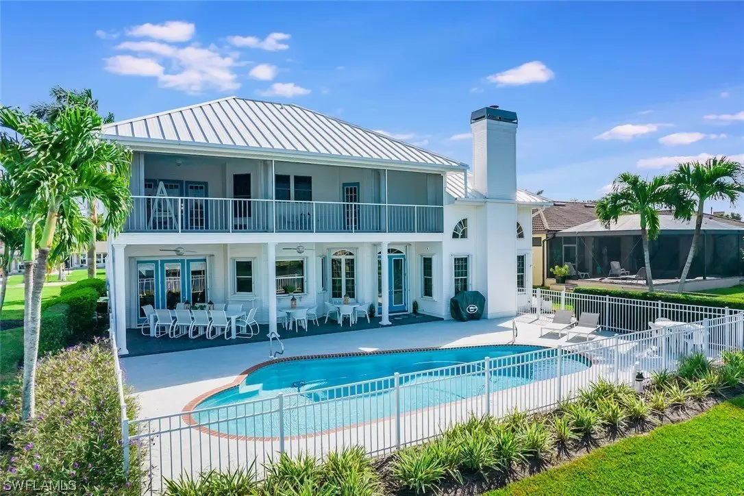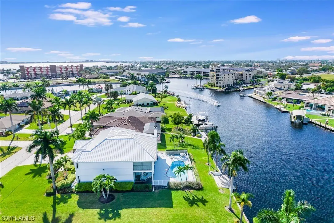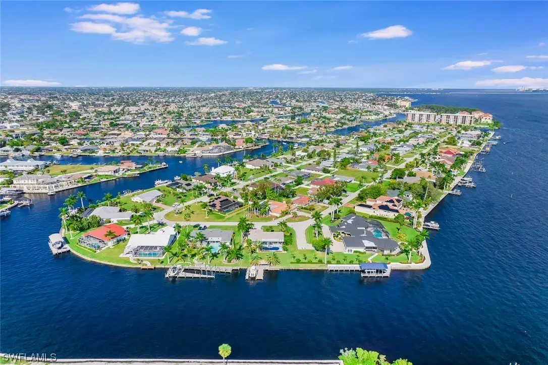 Absolutely one of the best locations in Cape Coral with incredible boating access, big water views and fully furnished for your convenience. This beautiful home has been meticulously cared for and boasts a brand-new metal roof in 2023. The interior showcases exquisite craftsmanship, highlighted by custom solid wood cabinetry throughout. The gourmet kitchen is a chef's dream, featuring dual dishwashers, two ovens, marble countertops, and not one but two islands, all complemented by a breathtaking view out to the intersecting canal view. The family room impresses with a vaulted ceiling adorned with beautiful tongue and groove wood. On the second floor, a vast screened porch, offering panoramic views of the water and stunning sunsets. Upgrades abound, including dual staircases, a three-car tandem garage, a convenient laundry chute leading to a spacious laundry room, and a generously-sized multipurpose game room on the second floor that could easily be converted into an additional bedroom or used as an office. Further enhancing this residence are a wood-burning fireplace, and custom millwork throughout. This level of detail must be seen to be truly appreciated.