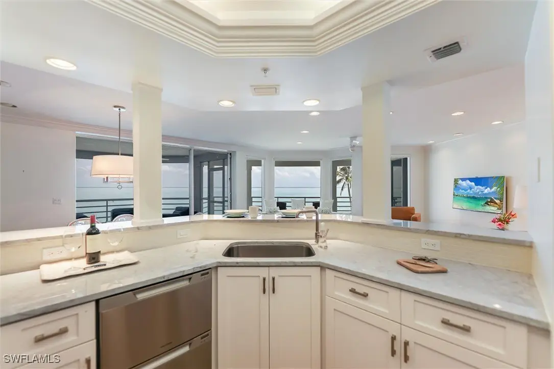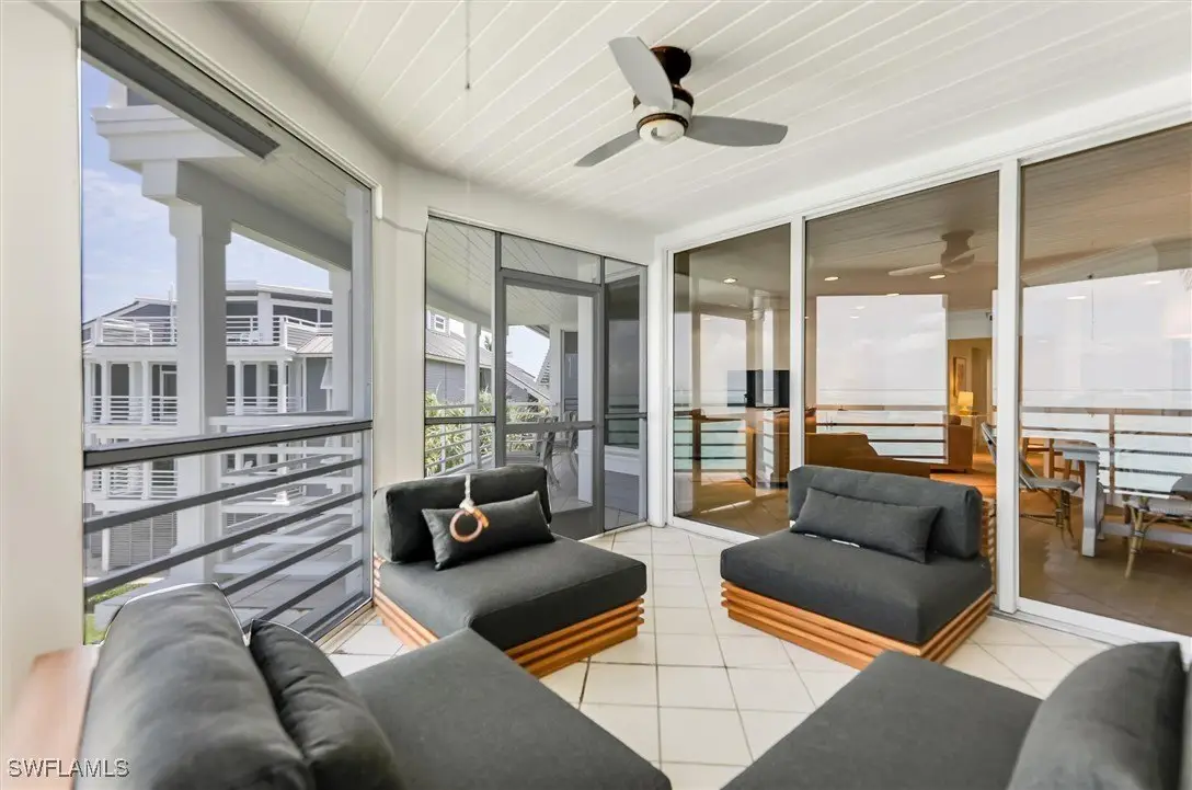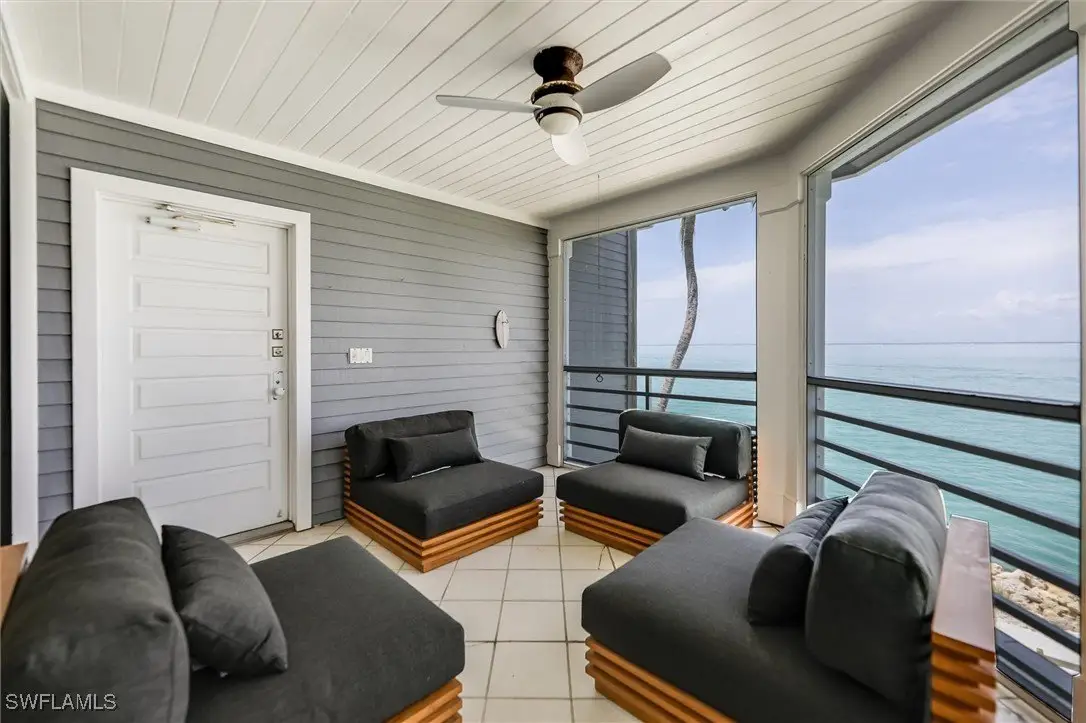 Welcome to Land's End Village, a tropical oasis, located inside the gated resort of South Seas on the very tip of Captiva Island where the Bay & Gulf adjoin. This exceptional penthouse boasts an open floorplan, allowing for breathtaking views of Red Fish Pass, Pine Island Sound Estuary and Gulf waters. Three bedrooms / three baths with large bonus room that is now used as a 4th sleeping area or could be a nice office area. The unit in completely turnkey and renovated with modern finishes and a relaxed coastal feel. Improvements include a gorgeous engineered hardwood flooring, custom cabinetry and Carrera marble counters, high end kitchen appliances, beautiful furnishings, stylish bathrooms, impact rated windows and sliding glass doors, and an open style floor plan. The penthouse master suite offers magnificent views from the large open air terrace overlooking the sparkling Gulf waters. The master bath boasts modern finishes as well, including a comfy soaking bathtub and a spacious walk-in shower. En-suite 2nd master is located on the main floor with two queen sized beds, the bathroom has a double vanity with a bathtub/shower combo. The 3rd bedroom has a comfortable queen bedroom and private terrace overlooking the courtyard. The hall bathroom has a modern feel with unique style sink and inviting shower. The main floor has as screened lanai for lounging and an open air terrace which is perfect for dolphin watching. Lands End amenities include a resort-style pool, hot tub, fitness room (owners only), tennis / pickleball, grills, butterfly garden, outdoor seating, tropical and lush landscaping. The complex is comprised of 17 buildings with fresh paint, new roofs, new AC condensing units, new irrigation, new landscape lighting, refreshed gravel in parking areas. Each owner has a dedicated parking space and storage closet in the garage area. Please call for an appointment!