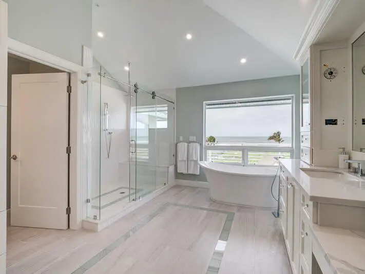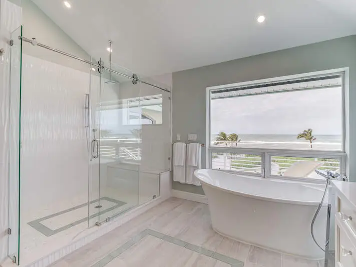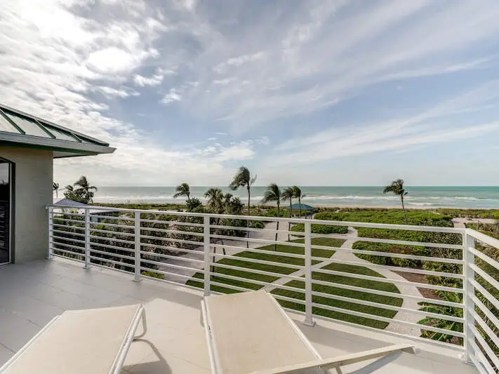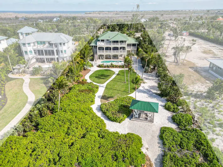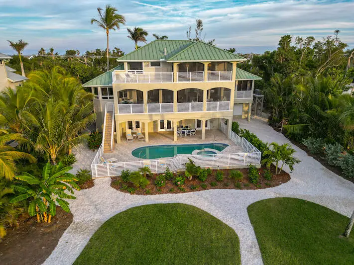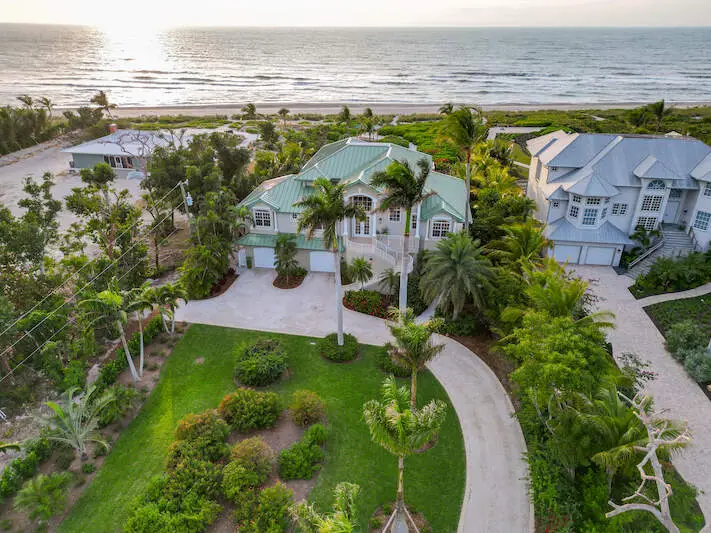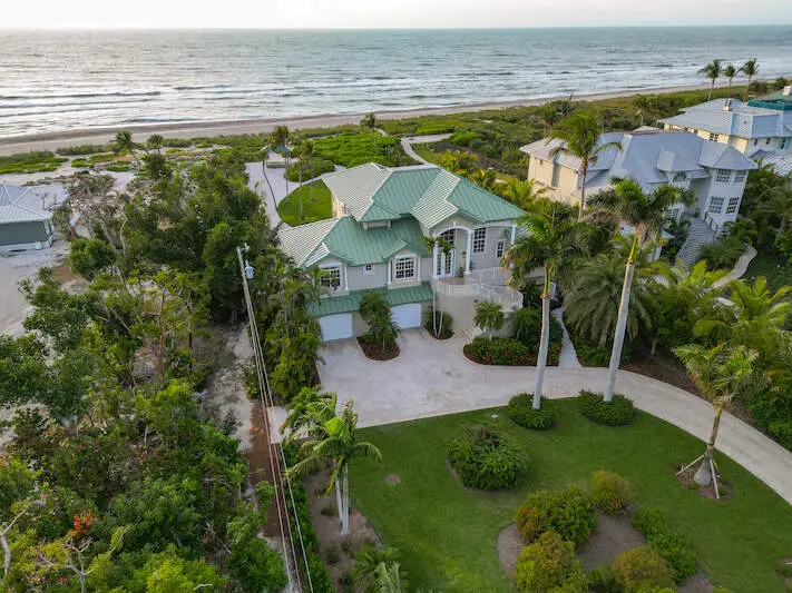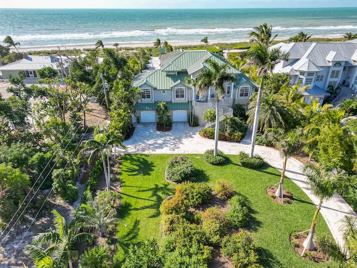 SOUTH HAVEN - Experience unparalleled tropical luxury at South Haven, a meticulously designed concrete piling home that seamlessly blends elegance and functionality. Recent enhancements include a fully remodeled kitchen, dining room, and primary bath, along with a 2023 roof replacement and premium finishes throughout. The main level features a sunlit foyer, guest accommodations, and dual guest retreats in a private wing. The redesigned kitchen boasts modern amenities and a bright dining nook, while the living room offers sweeping coastal views. Upstairs, the owner's suite captivates with Gulf of Mexico vistas, a stone-clad electric fireplace, and sophisticated woven flooring. The ground level includes a spacious garage and versatile spaces, all accessible via an elevator serving every level. Outside, Royal Palms frame the exquisitely designed pool area, complete with a sunbathing platform, covered dining, and lounging spaces. A beachside yard features a private cabana, landscaped greens, and a serene walkway to the shore. South Haven is the ultimate coastal retreat, offering exceptional craftsmanship, lush surroundings, and unforgettable sunsets.
