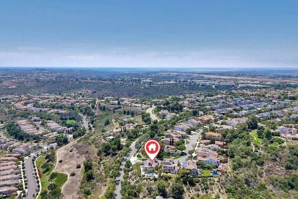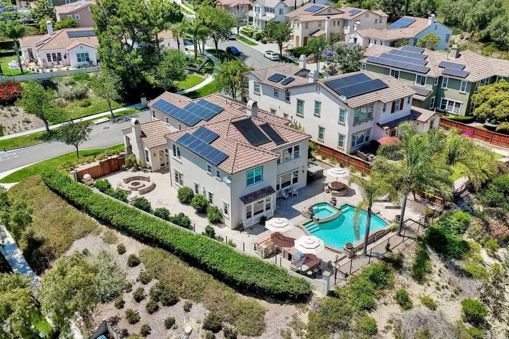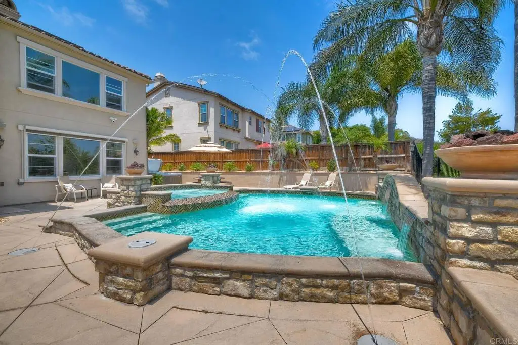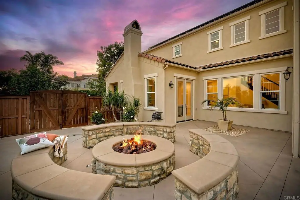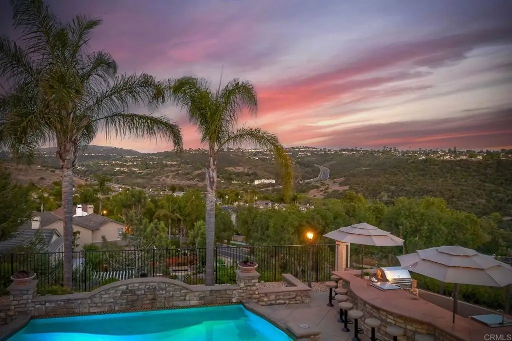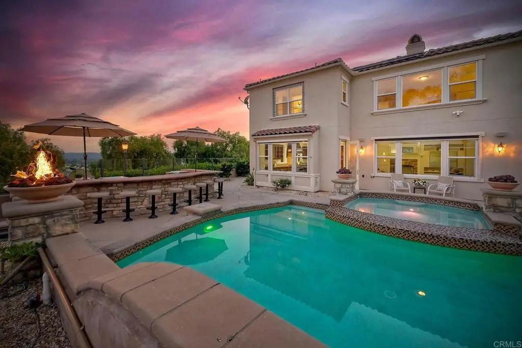 Don't Miss This Breathtaking Bressi Ranch Corner Lot Home with Views, Luxury Features, an Entertainer's Dream Backyard & PAID Solar! Inside, this stunning five-bedroom, 4.5-bath home offers soaring ceilings & expansive windows bathing the home in natural light. Step into your personal resort-style backyard, complete w/ an oversized pool & spa featuring shooting fountains, waterfalls & dramatic lava pits. The expansive outdoor kitchen seats 15--perfect for entertaining. For quieter moments, unwind in the serene courtyard around a fire w/ tranquil water features. A welcoming living room greets you upon entry w/ a cozy fireplace & French doors that open to the peaceful courtyard. Along the entry hall, you'll find the DOWNSTAIRS en-suite bedroom before arriving at the elegant dining room, which boasts a butler's pantry & a built-in wine rack. The heart of the home is the chef's kitchen, beautifully appointed w/ an oversized island & high-end appliances. It includes a Fisher & Paykel 6-burner range w/ double ovens & Sub-Zero refrigerator/freezer & rich cherry wood cabinetry w/ granite countertops. The kitchen flows seamlessly into the spacious family room w/ a raised-hearth fireplace & stunning views of the rolling hills & the resort-like backyard. Upstairs, discover a versatile built-in office nook & a generous loft--ideal for teens or tots. The oversized luxurious primary suite is a true retreat, featuring panoramic views & an absolutely dream-worthy walk-in closet. The en-suite bath includes his-&-hers vanities & a soaking tub w/ scenic views. Also upstairs are three additional bedrooms--one w/ its own en-suite & two others, generously sized. Located just minutes from Bressi Village's shops & restaurants & only a short drive to Carlsbad's beaches, this exceptional home offers a vacation lifestyle.