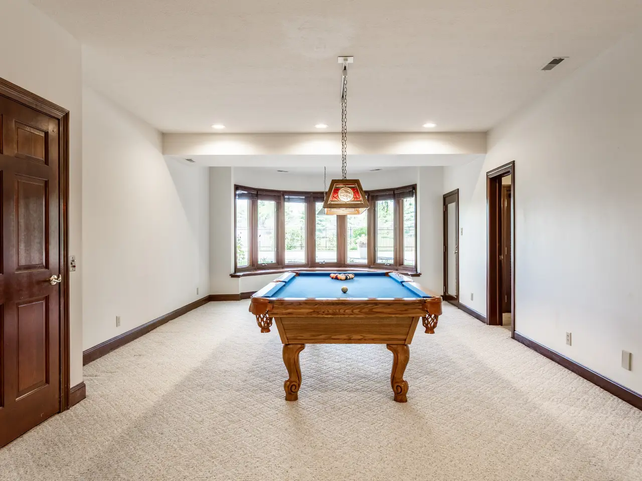 Situated on a premier water-view lot overlooking the pond and fountain inside the gates of prestigious Windermere in Carmel, this expansive custom home offers both luxury and versatility. From the moment you enter, you'll notice the attention to detail and fine finishes, from gleaming hardwood floors to beautiful crown moldings. The two-story great room is filled with natural light from a wall of windows and warmed by a two-sided gas fireplace, shared with the cozy hearth room. The kitchen is well equipped for any chef, featuring a center island, ample counter and cabinet space, and a breakfast room overlooking the pond and fountain, with access to the deck and screened porch. A formal dining room provides additional entertaining space. The main-floor primary suite is a serene retreat with vaulted ceilings, a relaxing ensuite bath, and a custom walk-in closet. Upstairs, three spacious bedrooms each include an ensuite bath and a walk-in closet. The walk-out lower level is designed for both fun and function, featuring a large family room with a wood-burning fireplace, a rec room equipped with a billiards table and a wet bar, guest quarters, an exercise room, a bonus/storage room, and an additional full bath that serves the pool. Accessibility is a highlight. The home offers elevator access and handicap-friendly features, including garage and pool area ramps. Outside, the fully fenced rear yard is complete with green space and a pool featuring a new liner and cover. This one-of-a-kind home blends timeless craftsmanship with thoughtful updates, all in an exclusive gated community on one of Windermere's most desirable water-view lots overlooking the pond and fountain.