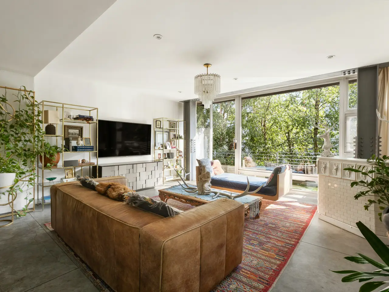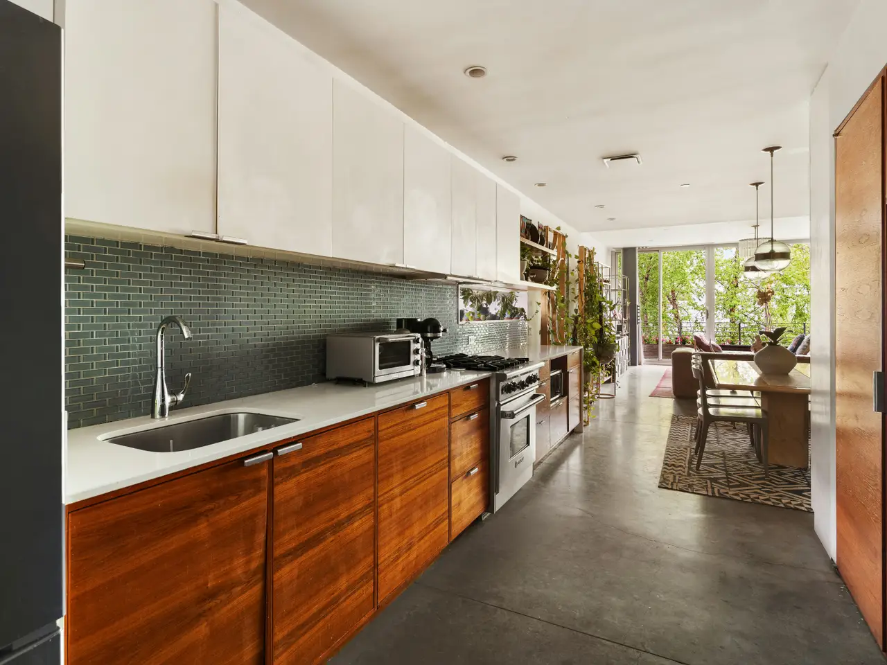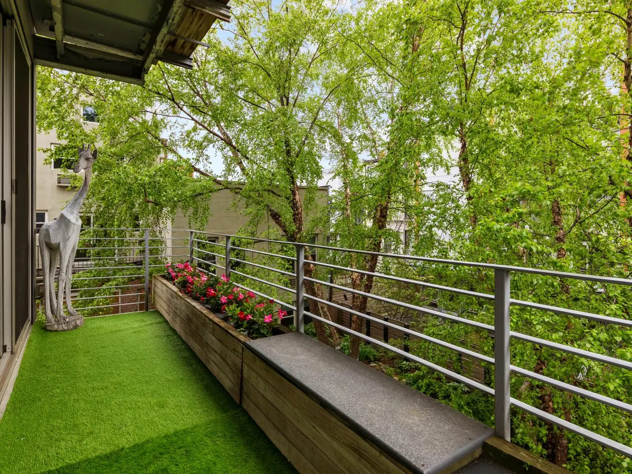 Welcome to 114 4th Place, Unit 2 - a serene and sophisticated two-bedroom, one-bath home located on one of Carroll Gardens' most picturesque, tree-lined blocks. This floor-through residence sits in an intimate four-unit boutique condominium and seamlessly blends modern design with warm, natural finishes. Step into the expansive living room and immediately be captivated by the wall of soaring floor-to-ceiling windows that flood the space with natural light. A private balcony offers the perfect perch for morning coffee, evening wine, or simply enjoying the feeling of being in nature with the trees and gardens below. The open-concept living space flows beautifully into the dining area, ideal for dinner parties or casual meals alike. Beneath your feet, poured concrete radiant heat flooring adds a touch of industrial chic while keeping the home cozy year-round. Central air ensures effortless comfort no matter the season. At the heart of the home, the thoughtfully designed kitchen is a masterclass in form and function. Custom teak cabinetry provides ample storage, while Caesarstone countertops and a full suite of high-end stainless steel appliances-including a Wolfe gas range and integrated dishwasher-make for an elevated cooking experience. At the opposite end of the apartment are two generous bedrooms, each offering Northeastern exposures, oversized windows, and tranquil privacy-perfect for restful nights or light-filled mornings. Located in the vibrant heart of Carroll Gardens, 114 4th Place is surrounded by a wealth of local favorites. Just around the corner, savor the beloved pastries at Court Street Grocers or the authentic Italian charm of Frankies 457. Carroll Park is only a short stroll away, offering green space, a playground, and a community hub that's long been a neighborhood staple. Please note: the 421a 15-year tax abatement expires in 2027.
