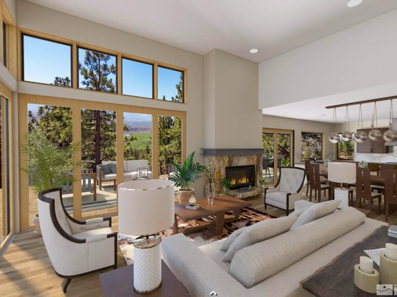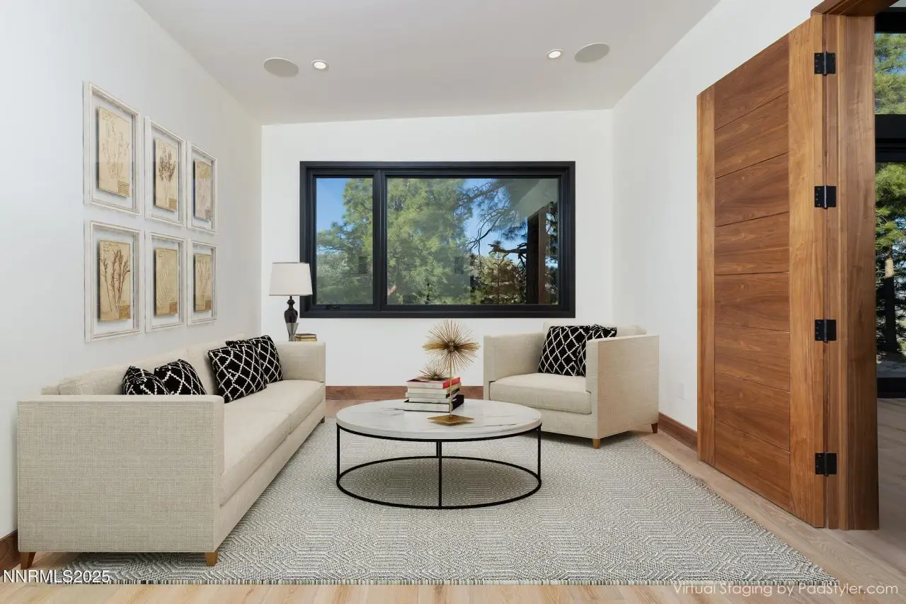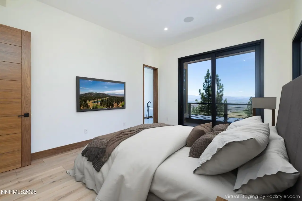 This exceptional property is truly one of a kind. Perched on a knoll high above Carson Valley, it offers breathtaking panoramic views in nearly every direction. Situated on one of Clear Creek Tahoe's premier view lots, the unique shape and topography of the land ensure unparalleled privacy. From the moment you drive along the winding driveway, a profound sense of serenity and seclusion envelops you. The main residence is gracefully positioned at the rear of the property, commanding a dramatic vantage point., The 3,587 square foot mountain contemporary home features an open floor plan and expansive walls of windows that frame the majestic scenery. Designed with feng shui principles in mind, the home showcases clean lines, spacious interiors, and abundant natural light to highlight the beauty of its surroundings. An oversized garage provides ample space for recreational vehicles, boats, or tandem parking. Additionally, the property includes a generous 1,800 square foot guest house, complete with a one-car garage, two bedrooms, a large living area, and a deck. Perfect for long-term guests, caretakers, or a tranquil workspace away from the main residence. At Clear Creek Tahoe, their vision is bringing together physical amenities creating a stage for a magnificent life experience. The nationally acclaimed golf course is fully mature and ranked number one residential course in Nevada. The Lake and Ski House allow members to enjoy 180' of sandy beach, water sports and shuttle service to Heavenly Ski Resort, and our newly completed Summit Camp offers swimming tennis, hot tub, water slide, bocce and more. Additional amenities include a spacious Clubhouse with workout/wellness facility open year-round.