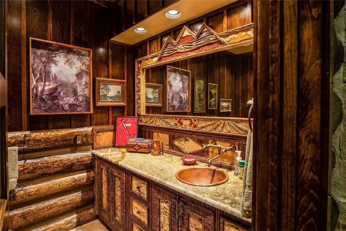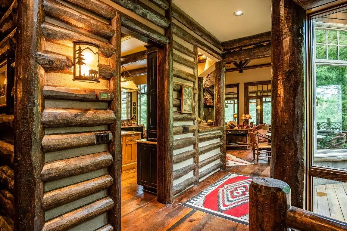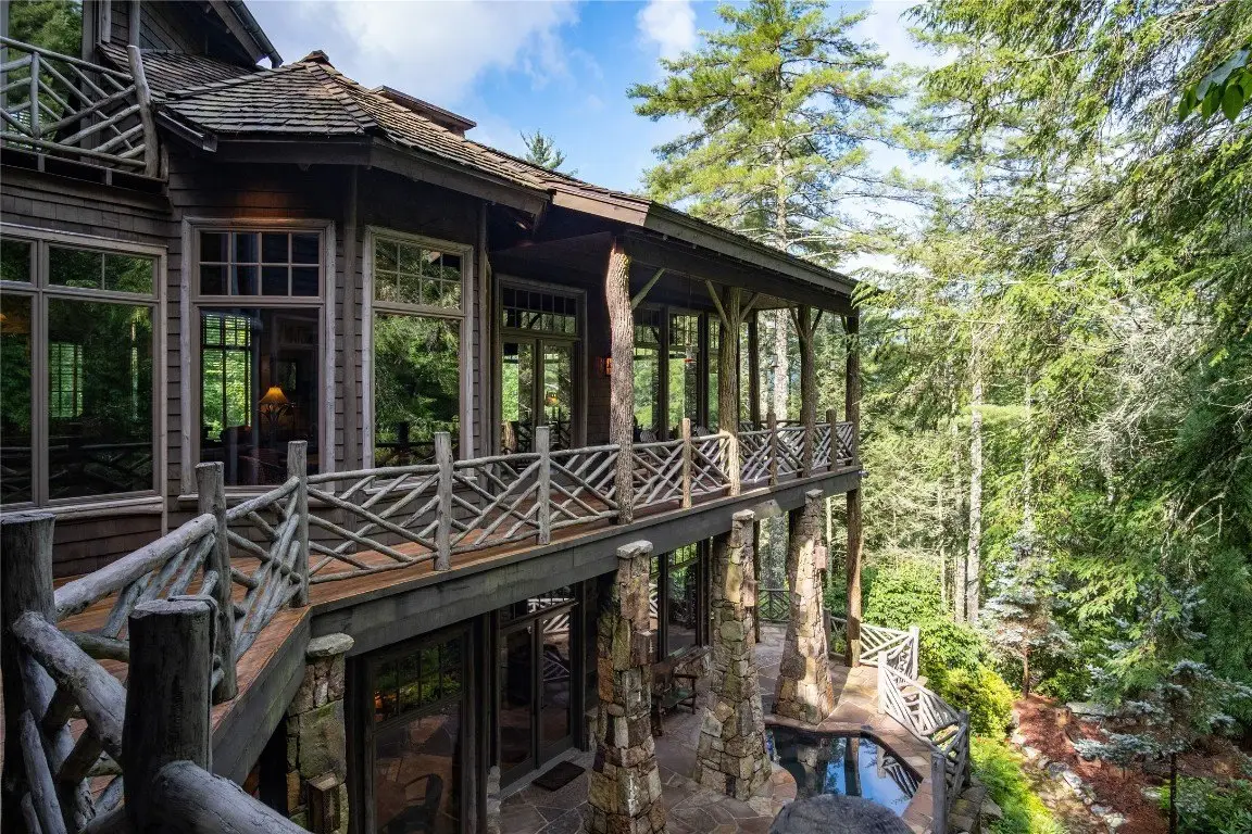Just minutes from the shopping and fine dining of downtown Cashiers, Blue Bear Camp is the ultimate Adirondack-style mountain lodge. This prime property borders the Nantahala National Forest, ensuring privacy and abundant wildlife. Another world awaits in the dream-like setting amid the wild Chattooga River, flowering landscaping, a sparkling waterfall, and lush forest, all against the stunning backdrop of Whiteside Mountain and Devil's Courthouse. Reminiscent of the great camps in the early 1900s, the rustic decor is warm and welcoming with natural wood details such as pine logs with golden chinking, wax-rubbed reclaimed heart pine floors, and a grandiose circular log staircase surrounding a seven-foot antler chandelier. The staircase is a masterpiece of engineering, constructed from Colorado Ponderosa pine over three months. Much of the custom furniture and details were built by local craftsmen on site. Other unique finishes were created by artisans from across the country, using natural materials such as mica, aged copper, shed elk antlers from Wyoming, Canadian birch bark, wormy chestnut, and turquoise. The stunning stonework and multiple fireplaces throughout the home were built from Tennessee fieldstones, many of which reveal 300,000-year-old fossils. In addition to the private guest quarters with a kitchenette and laundry room, the sprawling three-story home with an elevator offers an abundance of space for family and guests to explore, including a sunroom, library, an artist studio, game room, wine cellar, a resplendent home theater, and a fitness room with a sauna and steam room. Nature lovers will revel in the magical surroundings and fresh mountain air on the covered porch amid sights and sounds of the rushing waterfall. There's something for everyone to enjoy in an area offering residents access to the countless natural resources and opportunities for outdoor recreation such as hiking, fly fishing, biking, skiing, and golf.