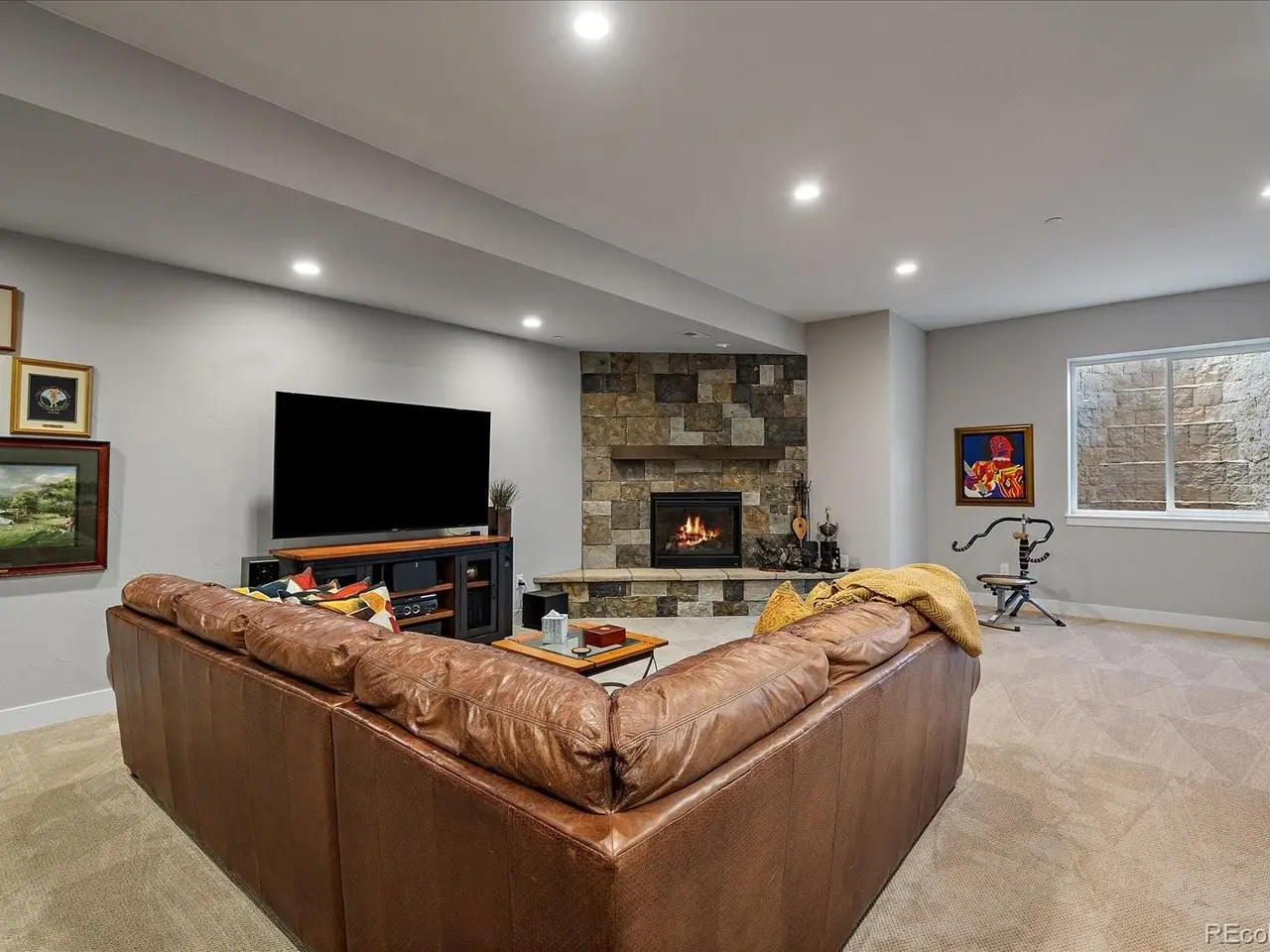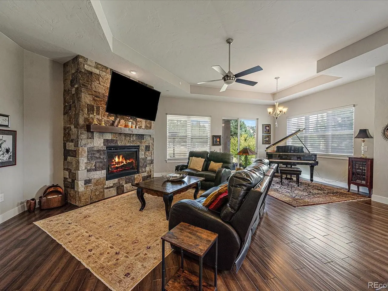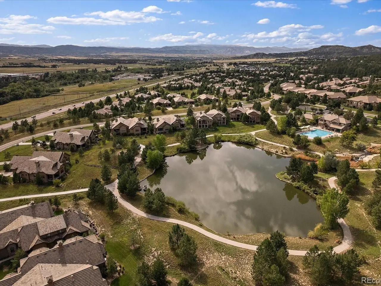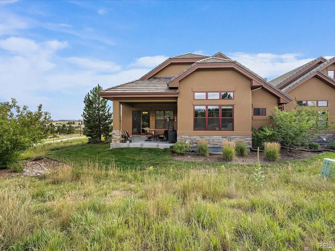 Discover the ultimate in luxurious, low-maintenance living with this exquisite ranch-style patio home within coveted gated community!! Nestled on a prime lot surrounded by open space, trails and unique water views, this home boasts a modern, open floor plan offering a feeling of grandeur with soaring 11-foot ceilings, elegant 8-foot doors, extensive hardwood-type floors, large windows, and tasteful décor that exude quality and sophistication!! The inviting 20x7 covered front porch leads to a grand foyer and an executive study, overlooking the centerpiece gourmet-kitchen - perfect for entertaining - featuring a huge 8x5 slab-quartz island with eating bar, stainless appliances, gas range, rollouts, lots of counterspace and an unheard-of 13x5 walk-in pantry!! Enjoy meals in the formal dining area, or relax on the adjacent private 15x11 covered patio overlooking serene natural spaces and a lake!! Unwind in the spacious great room by the stone fireplace!! Retreat to the luxurious primary suite with its own seating area, expansive windows with views, and spa-like 5-piece bath, including a free-standing tub and massive 8x6 walk-in shower - also featuring an incredible 160 square foot walk-through closet and custom built-ins!! Convenient spacious laundry/mudroom is directly connected to the primary suite closet and the oversized finished garage, with nearby main-level powder room!! The wide staircase leads to a versatile multi-purpose 2,100 square foot finished basement with 10-foot ceilings featuring family/media/recreation/exercise/game room spaces and another stone fireplace, two additional bedrooms with huge finished egress window wells and full bath!! Big 24x20 unfinished storage room and high-efficiency HVAC appliances!! Experience unparalleled Colorado-style living with golf courses, country club, social events, fitness center, tennis, pickleball, swimming pools, parks and trails, playgrounds, emergency services and more!! Enjoy visiting this fine home and first-class community!!