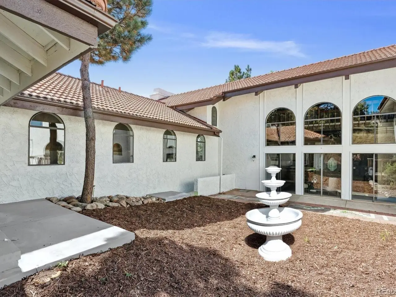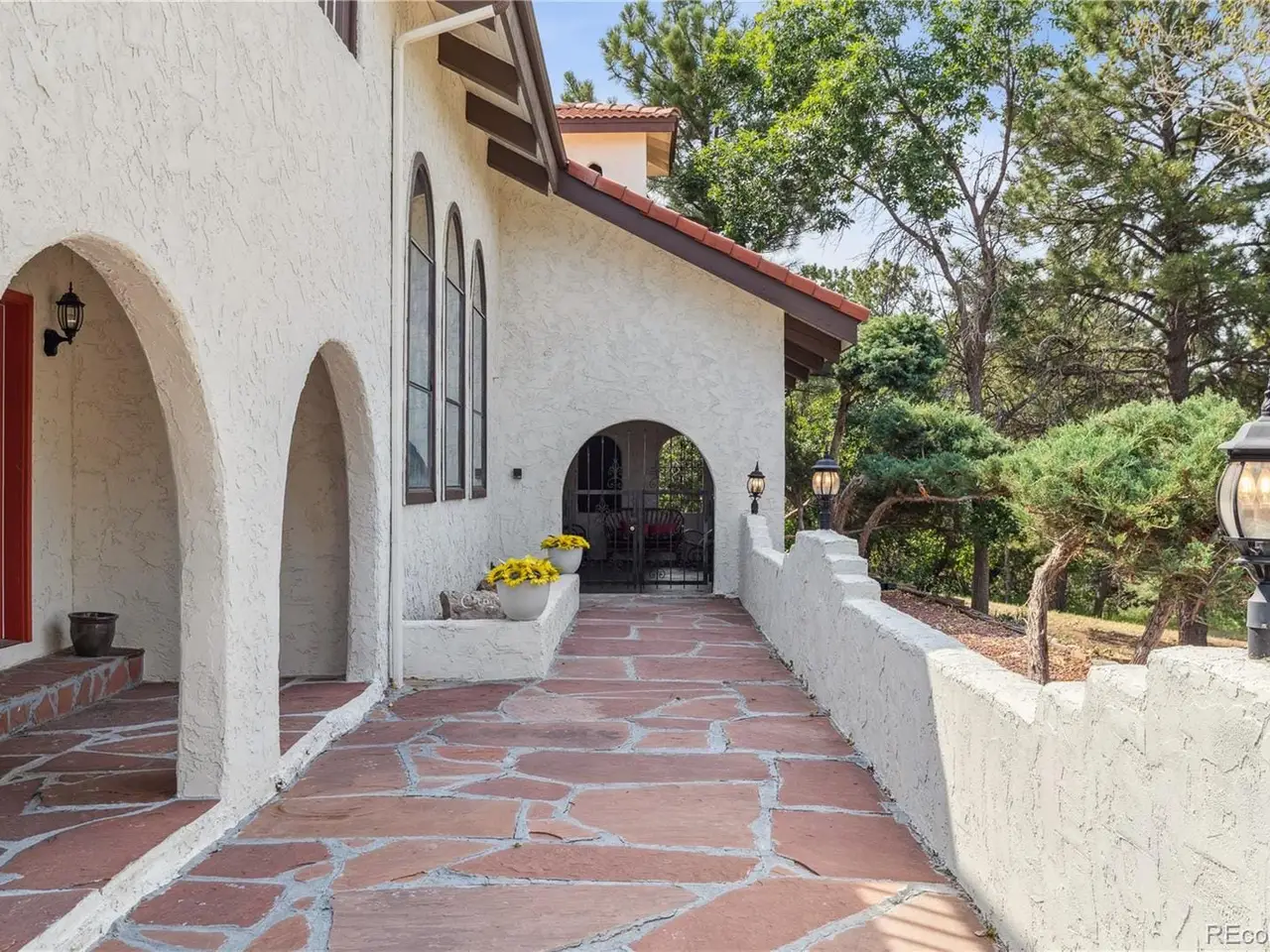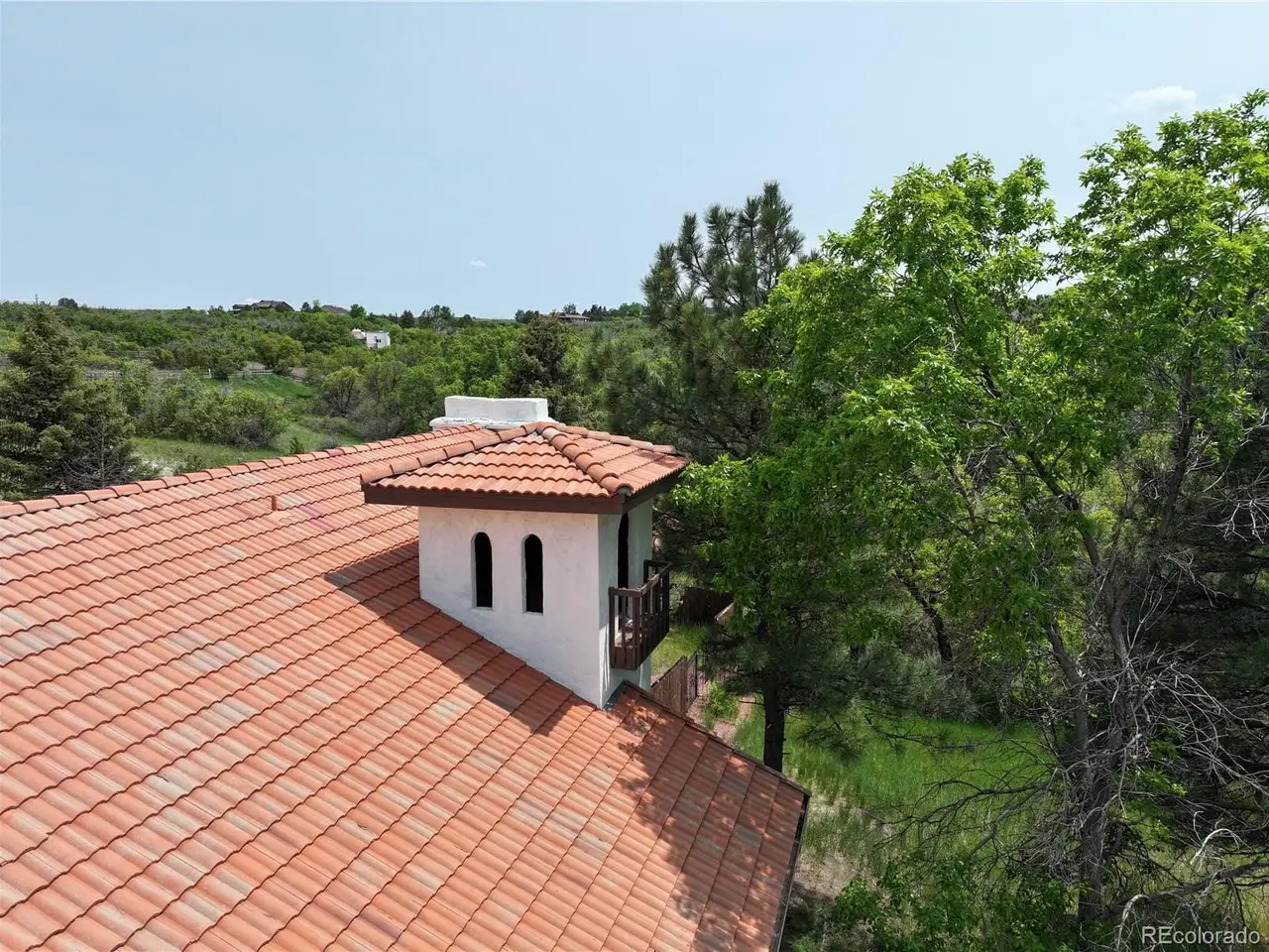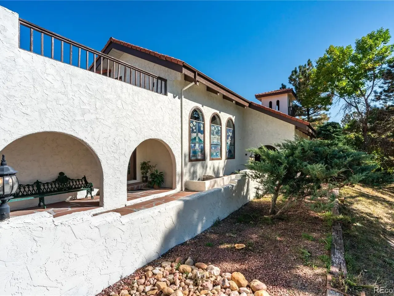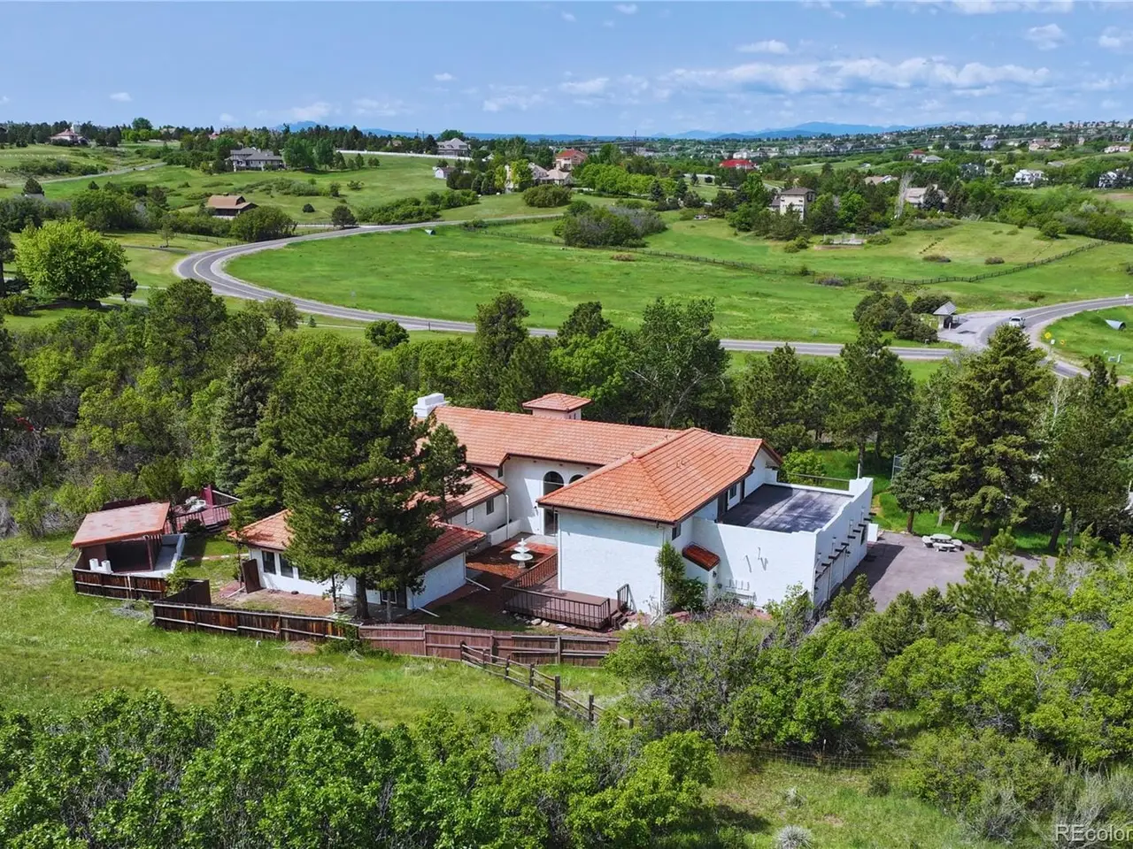Mediterranean Masterpiece on 5 Acres of Forested Beauty in Castle Rock's Premier Oak Hills Neighborhood. Spanish Revival architecture; stucco walls, Spanish tiles, wood beams, wrought iron, arches & bell tower. Private lot, stable, sports court, sun deck, BBQ pavilion & center courtyard. Gated entry, dramatic circular drive, attached & detached garage or workshop. Grand 2 story foyer; arched windows frame the inner garden, tiled floor, floating staircase & old world chandelier. Thoughtful updates w/ over $250,000 in enhancements are blended w/ classic design features. New Spanish Modern inspired kitchen; arched hall entry, island w/ eating space for 6, luxury LG appliance package, farm sink, quartz counters, brushed gold hardware, walk-in pantry, eating space & deck. Spectacular formal dining room; soaring two-story ceiling & hand-painted Tiffany-style windows. New carpet or new floors throughout. Above; 2 Private upstairs bedrooms each w/ new luxurious en-suite baths w/ marble floors. Access to balcony overlooking the property, surrounding hills & open skies. Great Room; 2 story stacked stone fireplace, stone hearth, wood clad ceiling, arched windows, tiki bar & projection tv wall. Ground floor primary suite; fireplace, coffee bar, sliding doors w/ private patios. Spa like 6 piece en-suite bath; steam shower, soaking tub, heat lamps, large walk-in closet. Finished walkout basement w/ tiled bar, brick clad fireplace. Walkout to the central courtyard or backyard outdoor living room. Al fresco dining overlooking your private resort; covered pavilion w/ wood grill-fireplace for. Set in northern Castle Rock next to Lone Tree. Privacy; 50 mature Ponderosa Pines & native Oak. Step out of the city and into a world of timeless elegance through this enchanting Mediterranean estate. Located only 5 minuets from the Ridgegate Light Rail Station, easy access to I-25, nearby Park Meadows, DTC, Centennial Airport, Skyridge Hospital, Open Space, entertainment and restaurants.