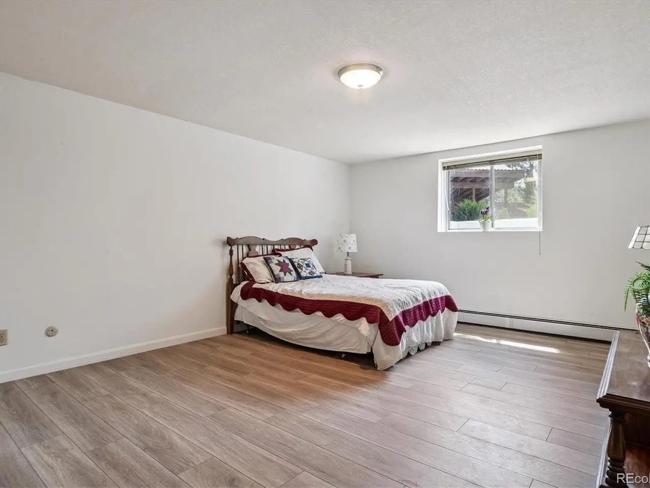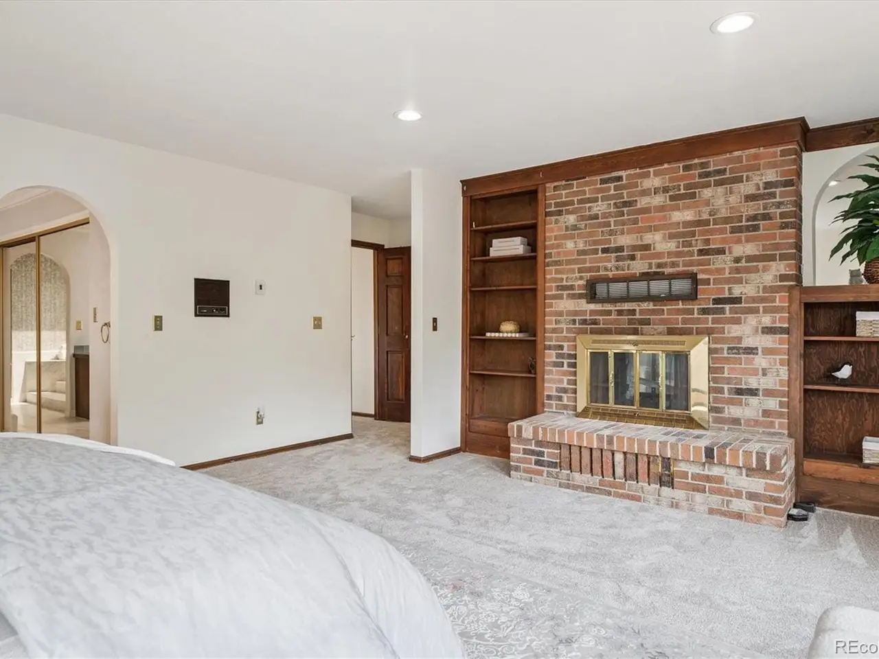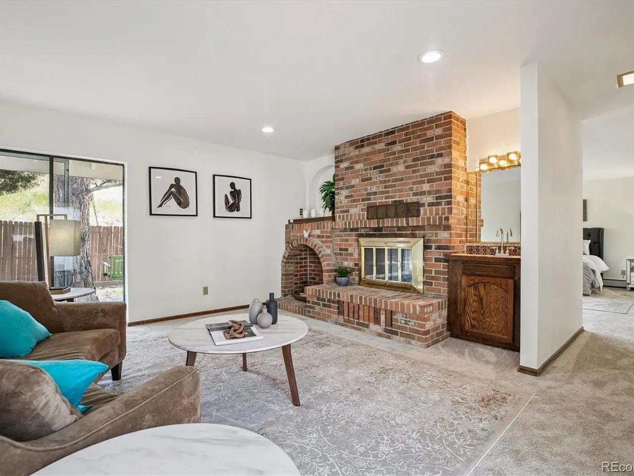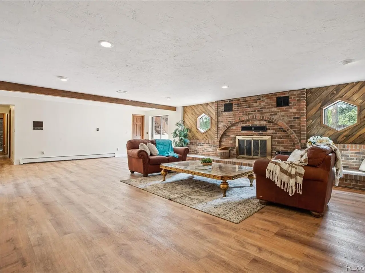 Walkout basement with brick-clad fireplace