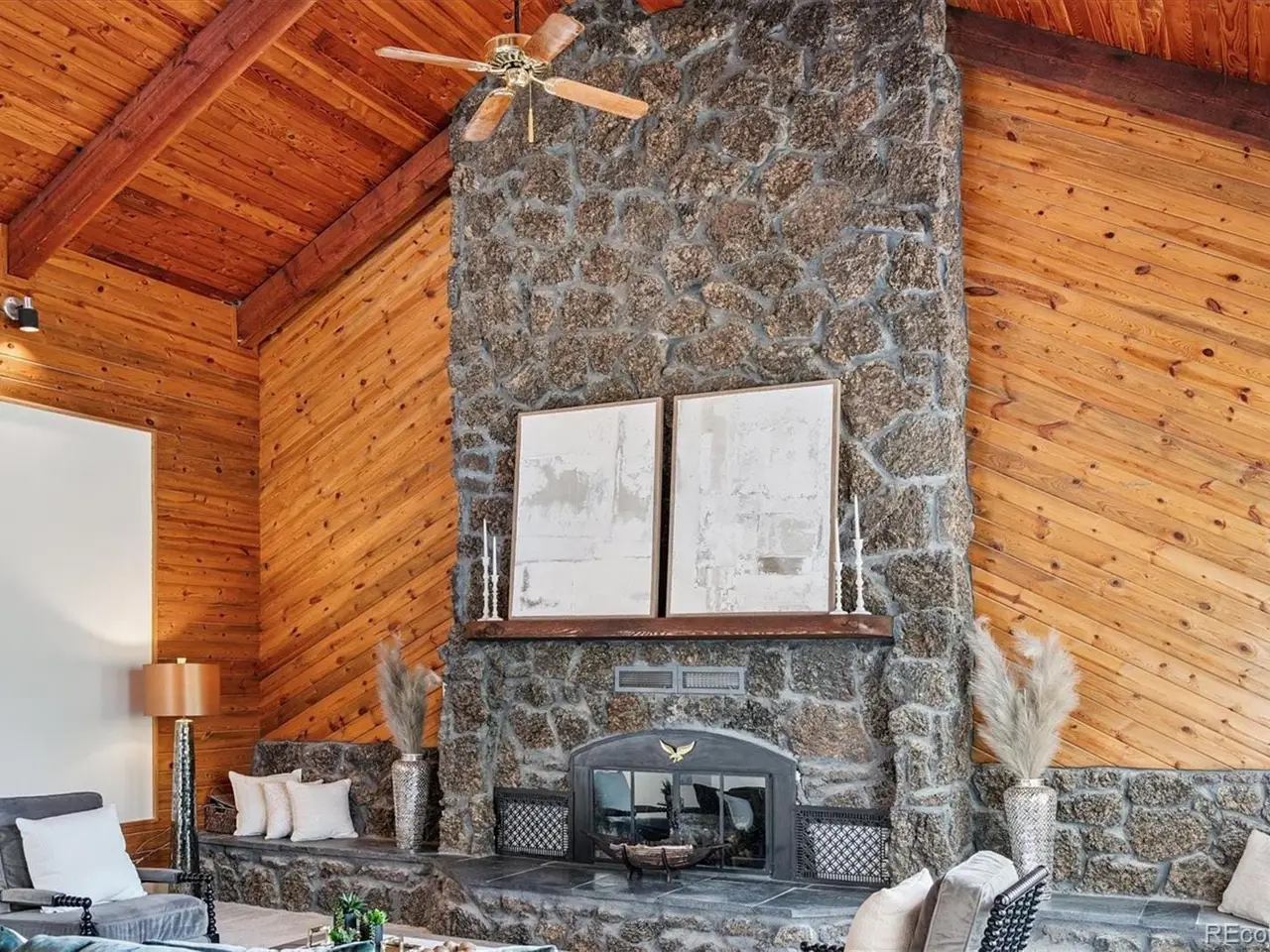Great Room with 2-story stone fireplace & tiki bar