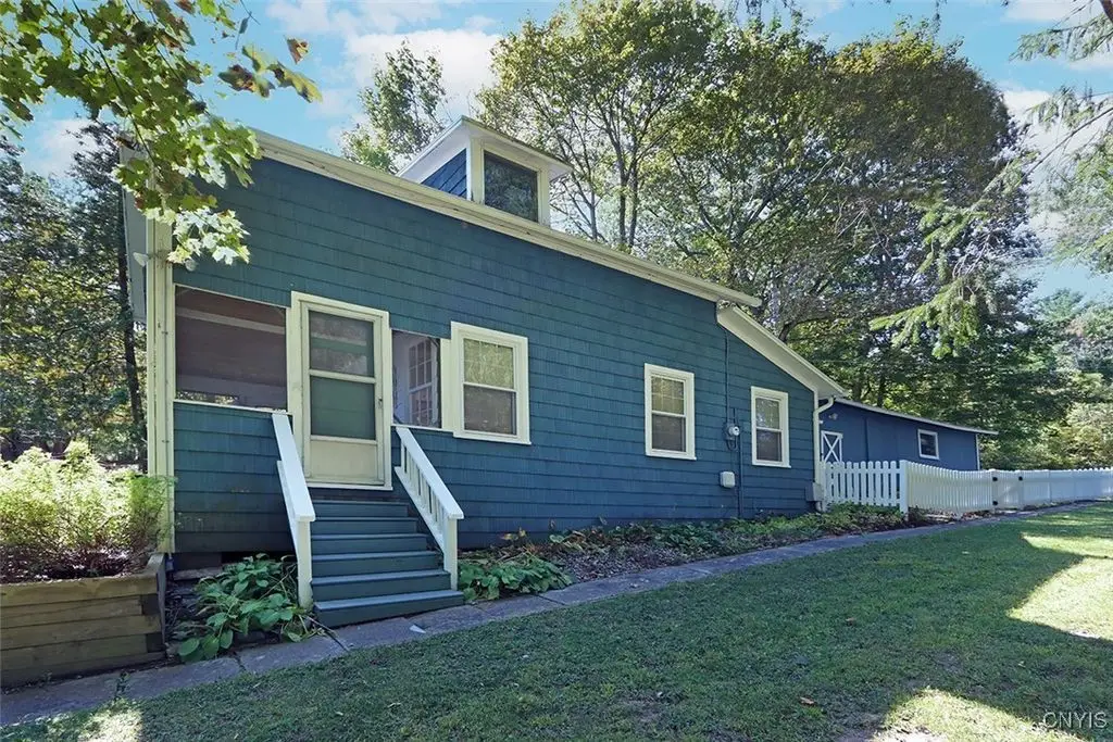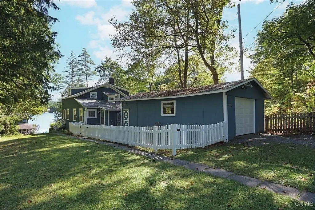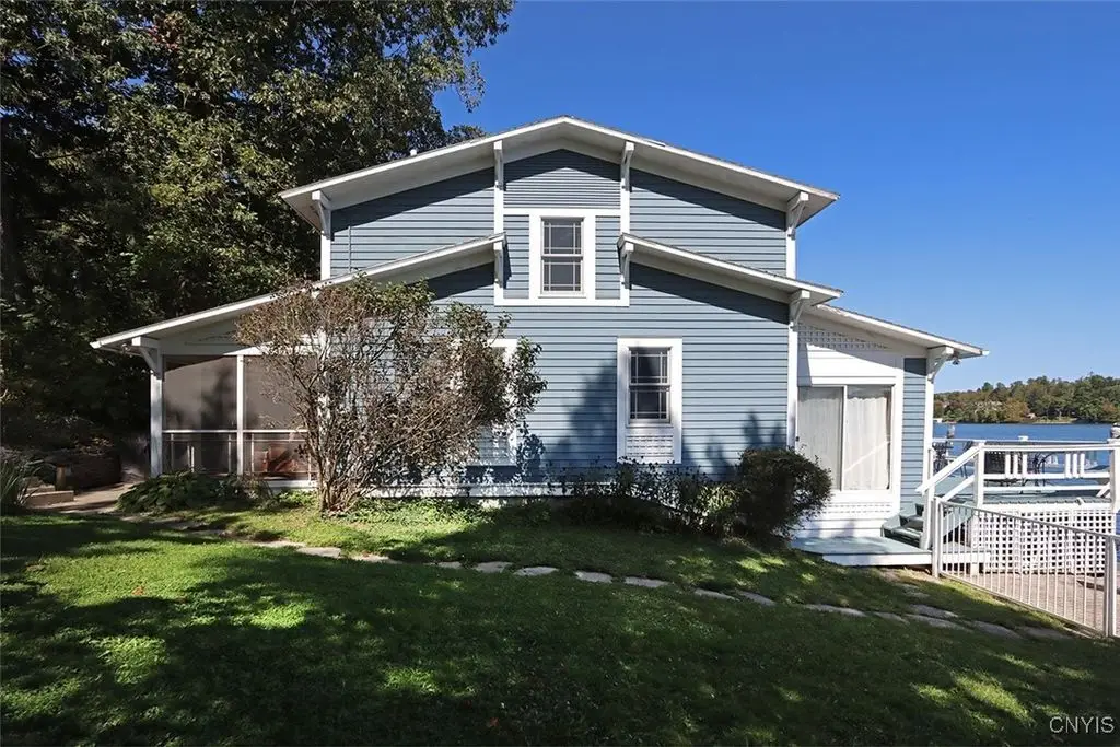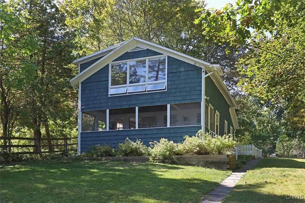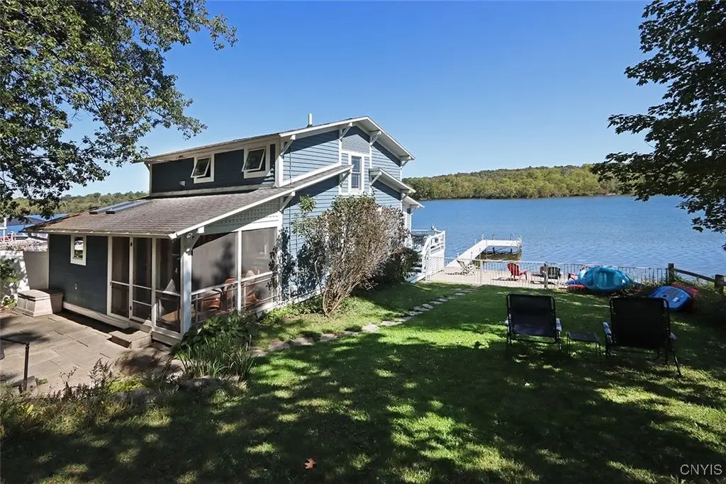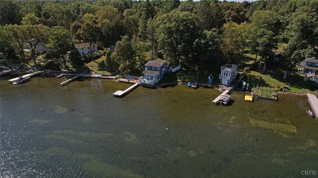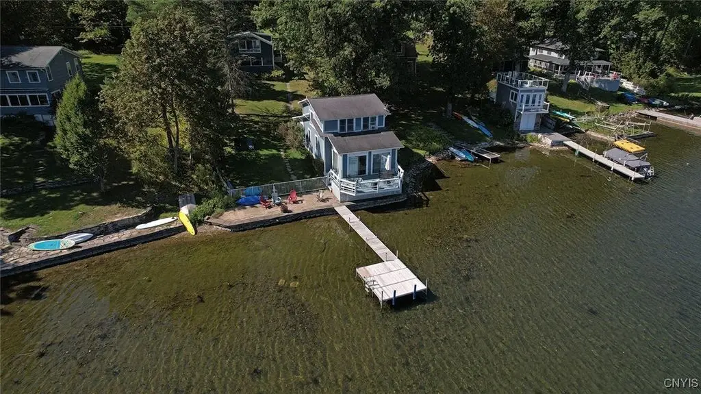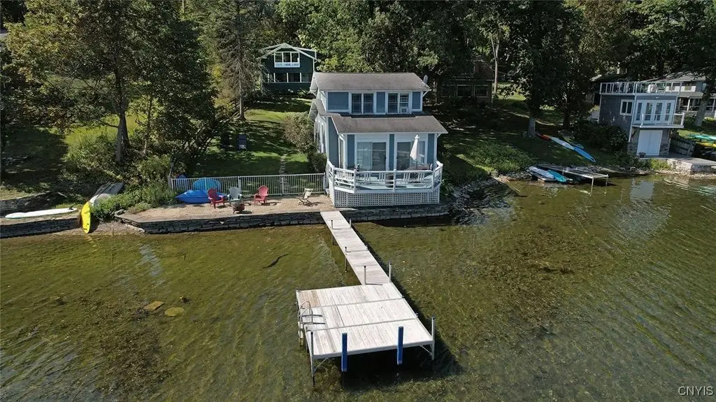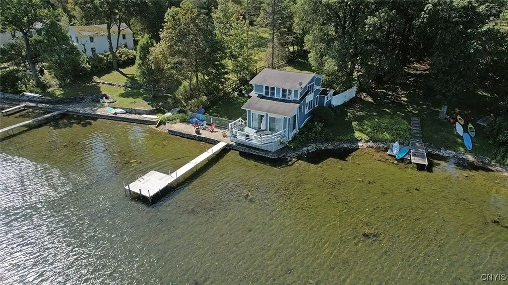 Two furnished waterfront cottages on Cazenovia Lake for the price of one, set directly across from the Forever Wild Nature Preserve. This unique offering provides an ideal setting for seasonal gatherings, overnight guests or simply enjoying lakeside living from two distinct yet complementary homes. With spacious interiors, outdoor areas and tranquil water views, it's designed for comfort and relaxation. The lower cottage is full of character, featuring knotty pine walls, hardwood floors and sweeping views. The eat-in kitchen, brightened by skylights, opens to the dining room, while a small alcove can serve as a reading nook, home office or guest space. The family room, accented by a wood ceiling and freestanding fireplace, includes walls of sliders that lead to a generous deck where you can watch the sunrise shimmer across the lake. Upstairs, the primary suite offers a vaulted beamed ceiling, walk-in closet, full bath and laundry center, all enhanced by peaceful lake scenery. The upper cottage, framed by a charming picket fence, presents its own welcoming presence. A foyer with sitting area and open staircase sets a warm tone. The kitchen offers generous cupboard and counter space, flowing seamlessly into a great room that opens to the dining area. A relaxing screened porch offers a wonderful spot to enjoy lake breezes. This home also features three bedrooms, two full baths and its own laundry center. Outside, a dock provides direct access to the water for swimming, boating or fishing. The garage has space for boat storage and seasonal equipment. Just a short drive from shopping, restaurants, schools and major roadways, these two cottages together create a waterfront retreat with comfortable, welcoming spaces indoors and out.