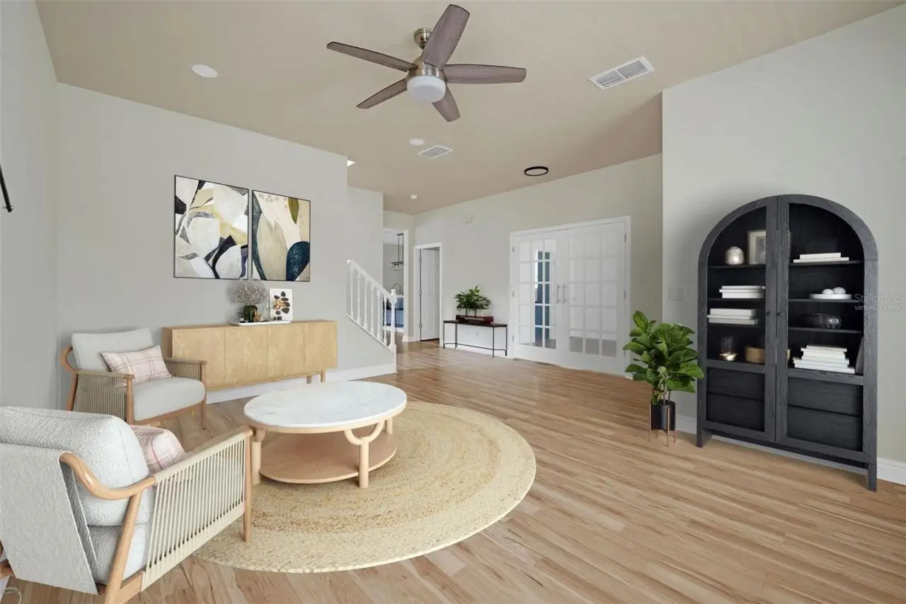 Welcome to 1115 Mosaic Drive in quiet and peaceful Artisan Park, in Celebration, Florida. First you will see the two front porches, ready for morning coffee. The note the NEW DUAL ZONE A/C (installed 3/2024). Inside, there is a flexible living space. Behind French doors, a private office with lots of natural light. Seamless laminate floors throughout. A spacious half bath. An updated kitchen with granite island and dining space. Updated butler's pantry and all stainless appliances. The laundry room is also located on the first floor, includes a front loading washer and dryer. Access to the screened-in porch and fully fenced backyard with paver patio. Upstairs is the primary bedroom with ensuite bathroom with garden tub and access to the second floor balcony. Along with three bedrooms and the second bathroom. Custom closets are throughout the entire house. Two car garage and driveway with space to park. Garage has hanging storage shelves. Fence installed 2024. Hot water heater installed 10/2021. Come see this gem today!