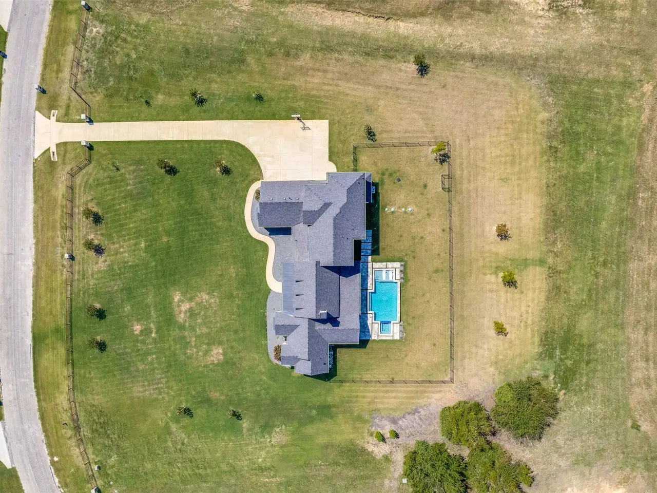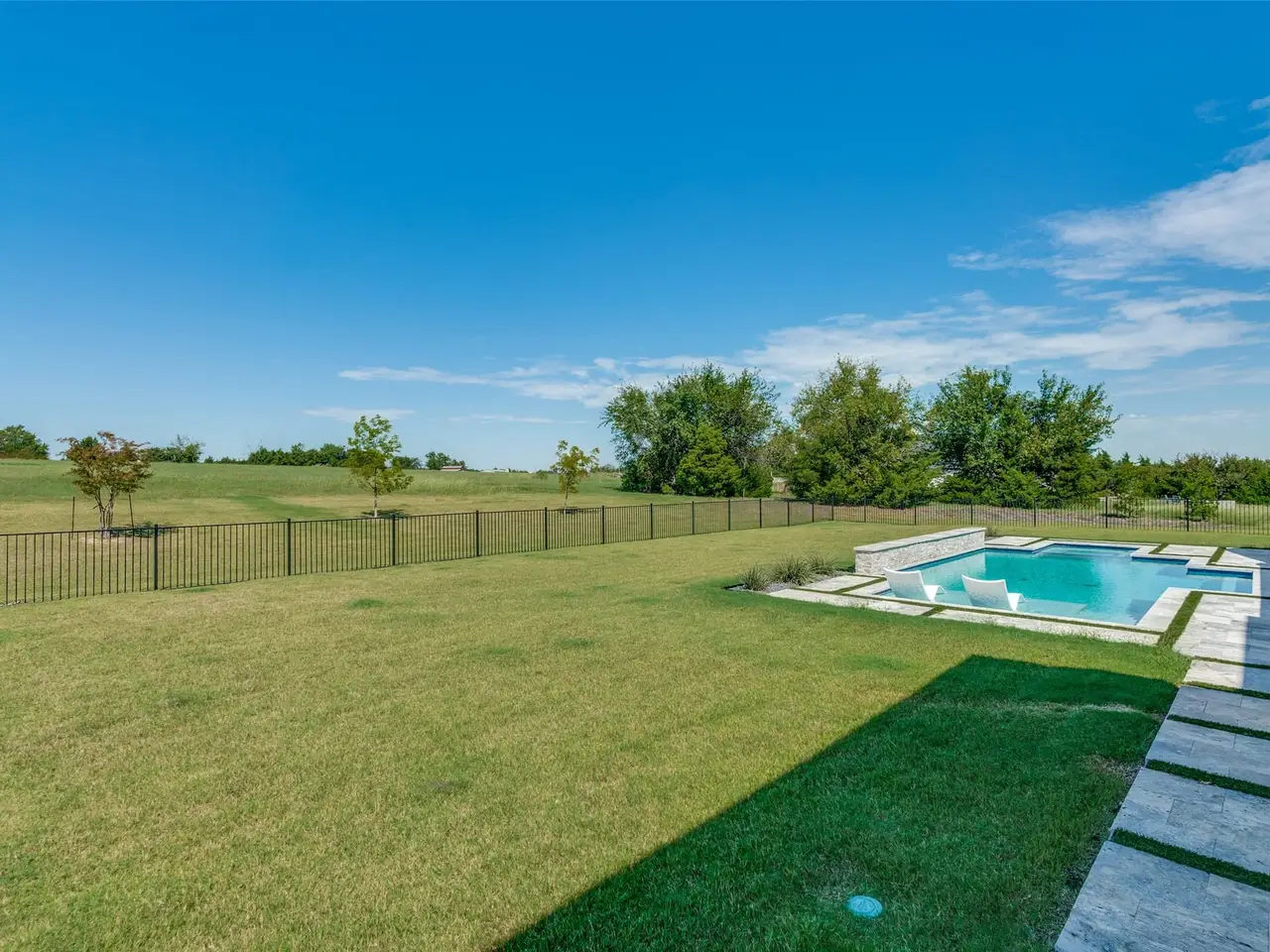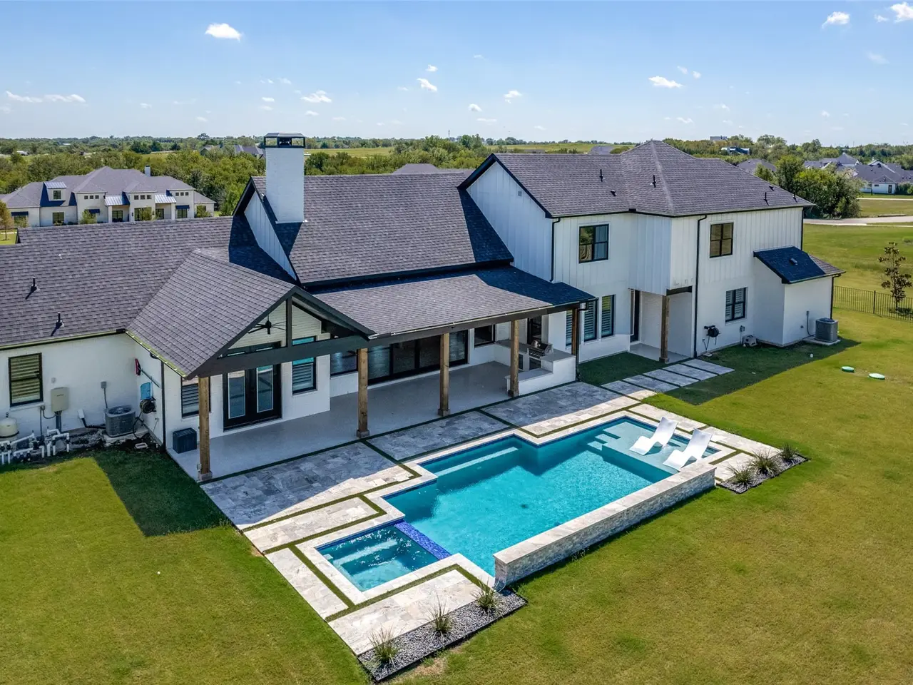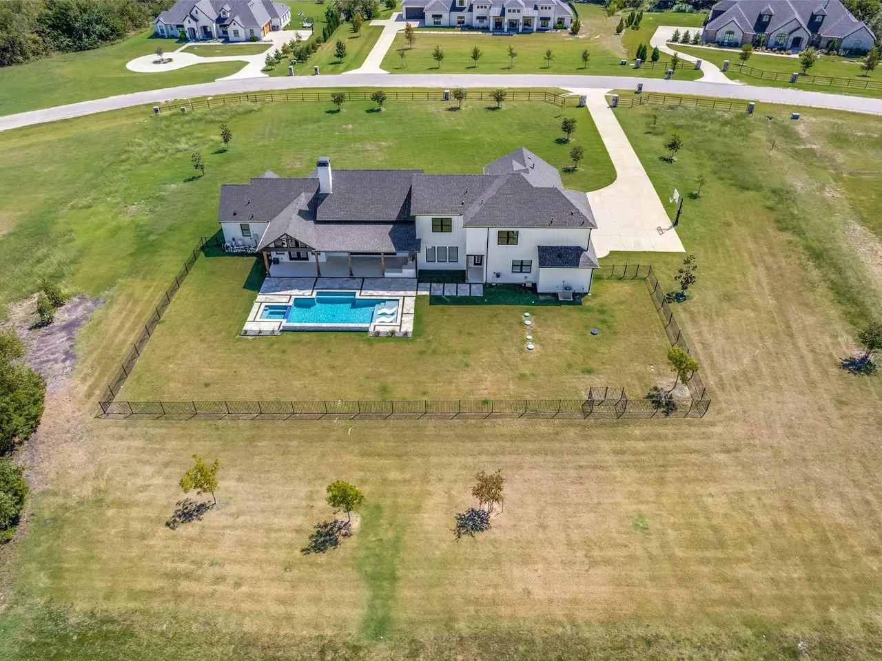 Enjoy the serenity and privacy of your own slice of a Texas ranch, all while maintaining a strong sense of community. This beautiful five-bedroom, four and a half-bath home is ideally situated on 2.2 acres. Upon entering through the double doors, you'll be greeted by a light-filled Great Room where attention to detail and design is immediately evident. The modern aesthetic of white counters and walls contrasts beautifully with black cupboards and woodwork, while warm wood floors and beams provide a traditional touch. This spacious room, large enough to accommodate additional dining, features a cozy fireplace and a wall of windows overlooking the tranquil, oasis-like backyard. The kitchen, open to the Great Room, is a chef's dream with a six-burner Wolf Range, double ovens, a built-in refrigerator and a farmhouse sink. Ample kitchen storage is further enhanced by an extra-large pantry. An attached Breakfast Room and Breakfast Bar offers plenty of space for casual dining. The first floor Primary Bedroom boasts panoramic views of and direct access to the pool area, complete with a convenient coffee bar and drink refrigerator. The Primary Bath is a luxurious retreat, featuring a free-standing tub and a double shower. Remarkably, a discreet safe room is tucked away within the Primary Suite. A dedicated study is located adjacent to the Primary Bedroom, and another first floor bedroom with an en-suite bath provides privacy for guests. The first floor is completed by a Media Room, a separate office space, and a utility room. Upstairs, you'll find a light and airy space offering three additional bedrooms, two baths, and a spacious Game Room. Step outside to discover an inviting outdoor living space with a covered patio & a built-in grill. Your private resort is complete with a tanning deck in the pool, a relaxing spa, & an elegant water feature. Finally, a three-car attached garage with additional storage provides easy access. This exceptional home is also zoned for award-winning Celina schools. Welcome to the Hills of Lone Star.