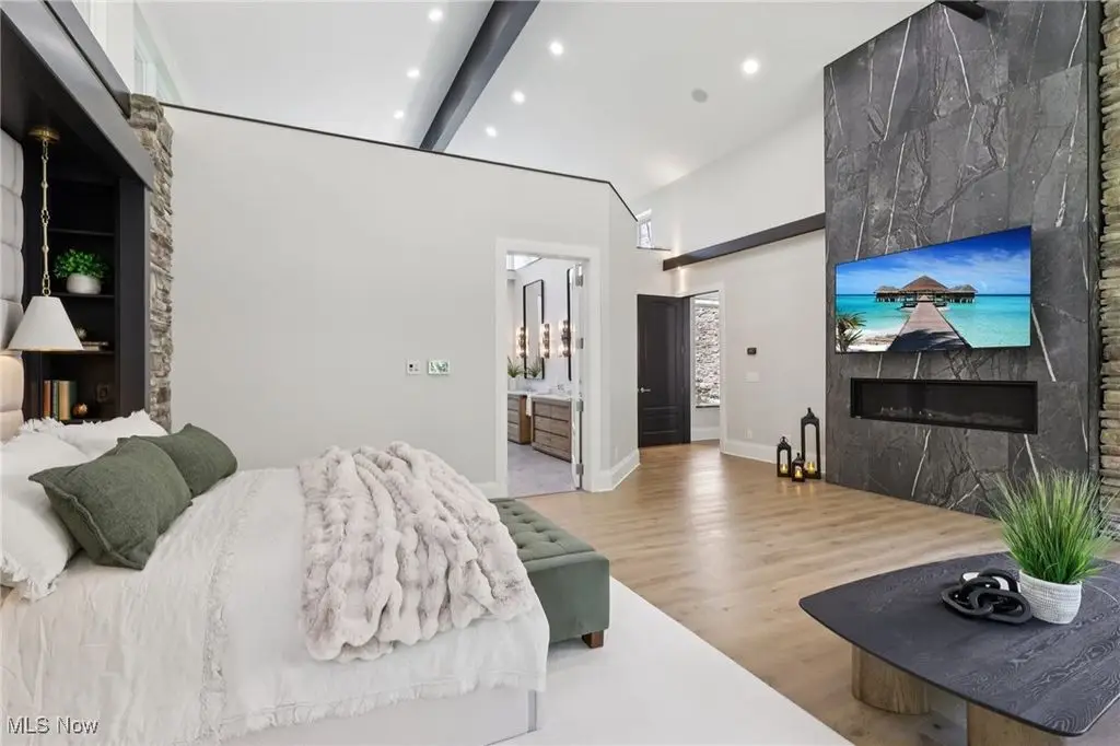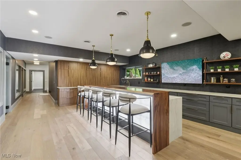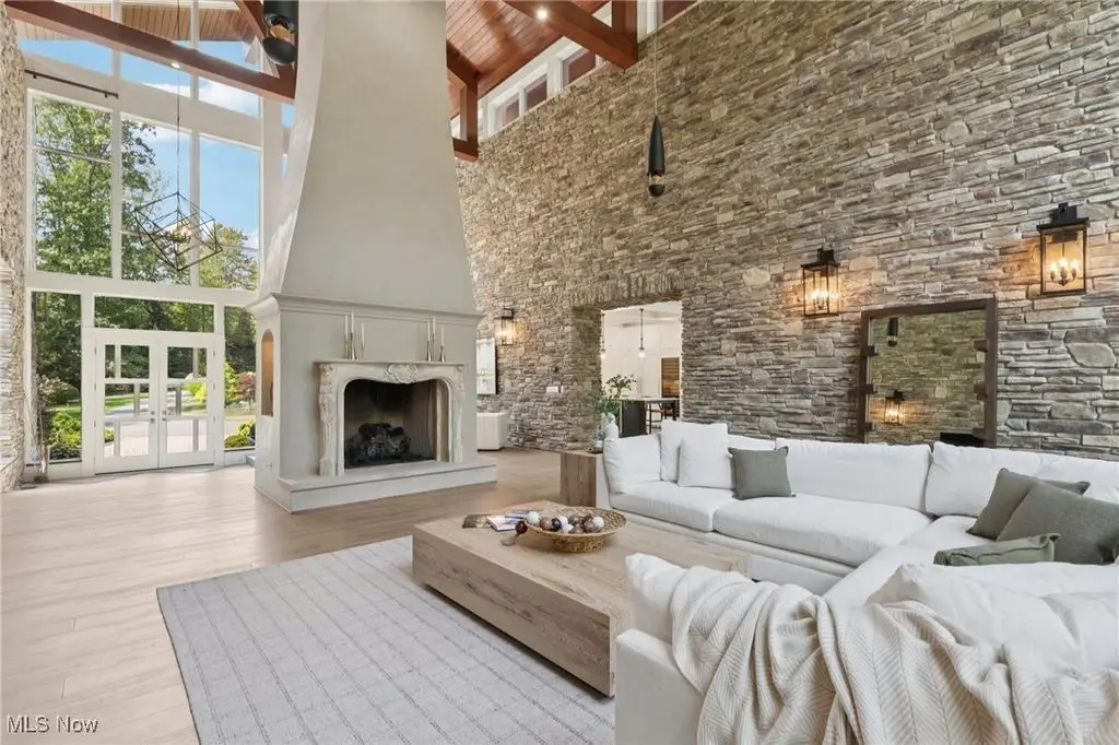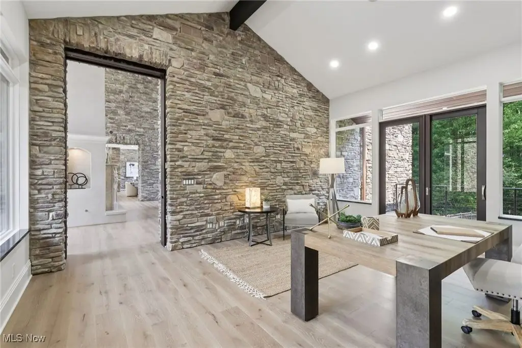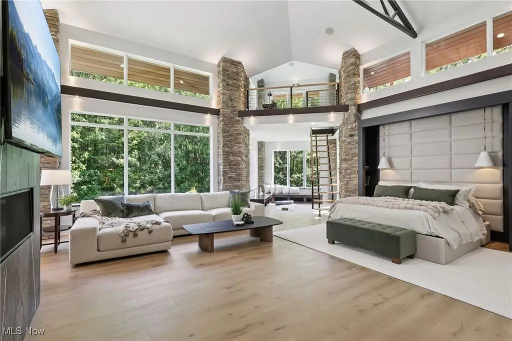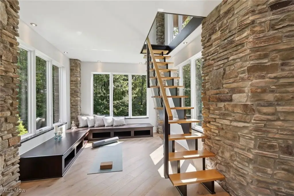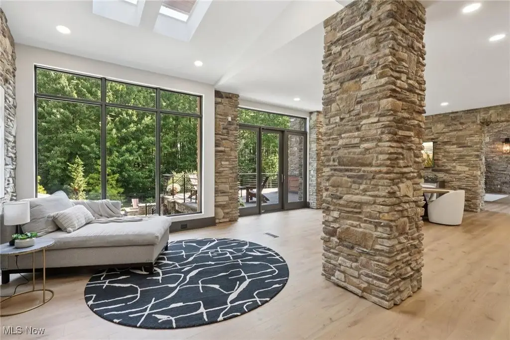 This extraordinary contemporary estate blends modern design with Rocky Mountain elegance to create a private sanctuary of unparalleled sophistication. Reimagined with uncompromising detail, the exterior flows seamlessly from the serene lily pond and waterfall entry to the resort-worthy patio, pool, firepit, and pergola. Walls of glass frame sweeping views of the manicured three-acre grounds, dissolving boundaries between indoors and out. Inside, soaring ceilings, wide-plank white oak floors, and designer lighting define modern refinement. The chef's kitchen is a true centerpiece with natural stone countertops, professional-grade appliances, wine cooler, beverage fridge, generous pantry, and walk-in prep kitchen. The main-level owner's wing offers a dramatic fireplace suite, lofted lounge with panoramic vistas, wellness area, and a spa-inspired bath with dual vanities, soaking tub, and oversized shower. Two large closets with custom cabinetry complete the space. A connected office/den overlooks a tranquil fountain and opens to a private deck. The lower level redefines entertaining with a 18-foot wine cellar, illuminated onyx bar clad in Calcutta Brazil marble and walnut, billiards, ping-pong, poker room, and fitness center with direct access to a spa bathroom complete with sauna and shower. The additional pool bath is conveniently located at the lower level entrance and features two showers and a dedicated water closet. Upstairs, four bedrooms and three baths provide space and privacy. An expansive first floor laundry with dual washers and dryers and a dedicated mudroom elevate both elegance and everyday ease. Set on three wooded acres backing to Ladue Reservoir, this estate delivers unrivaled privacy, resort-style amenities, and effortless luxury.