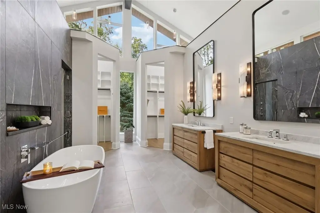 Spa-inspired bath with dual vanities