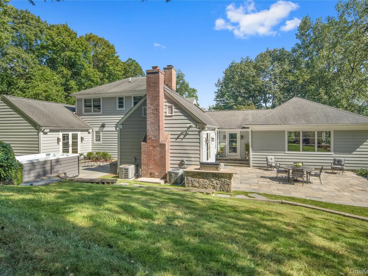 Welcome to 56 Annandale Drive, Chappaqua, a capacious and captivating Cape Cod commandingly set on 1.4 acres in sought-after Lawrence Farms East within walking distance to Mount Kisco Country Club, Kittle House, Chappaqua Crossing, Horace Greeley High School and the town of Mount Kisco. Built for entertaining, every day is a holiday to celebrate in the open, spacious interiors, starting with the inviting front-facing living room with wood-burning fireplace. The gourmet kitchen is equipped with solid wood cabinetry with pull-out shelving, tile backsplash, stone countertops, center island with prep sink, 5-burner cooktop, dual Thermador in-wall ovens, GE microwave, Sub-Zero refrigerator/freezer, and a Viking dishwasher. Host feasts or fests in the dramatic formal dining room with wood burning fireplace and opposing sets of French doors to opposing patios. BBQ on the built-in grill and dine alfresco on the patio. The party continues in the extra-spacious family room with large windows on three sides. Main-level private quarters include a front-facing in-law or guest suite with private, ensuite bath; and the king-sized primary suite endowed with its own sitting/dressing area, a sumptuous, private, resort-worthy ensuite bath, and French doors to the patio with swim spa for rejuvenation or relaxation. Completing the main-level are the entry foyer with two separate coat closets, broom closet and powder room; and a front-to-back mud room with front- and rear- facing French doors and garage access. Upstairs houses a wide, front-facing lounge or play space adjoining two rear-facing bedrooms with built-ins, outfitted, dormered closets with attic access, and sharing a "Jack-n-Jill" bath with double vanity, linen closet and tiled shower with in-wall jets and regular and handheld showerheads. Downstairs sit two generously sized recreation rooms; a full bath with shower; a laundry room equipped with Whirlpool front-loading washer and dryer, sink, ironing board and built-in cabinetry; storage; mechanicals; and access to the attached 3-car garage with electric car charger. An alarm system and a standby, backup, whole house generator help protect it all. A sweeping drive provides plenty of off-street parking. Lovely lawns and landscaping add colorful accents, and mature and established trees ring the perimeter of the property. A distinctive residence in a notable location.