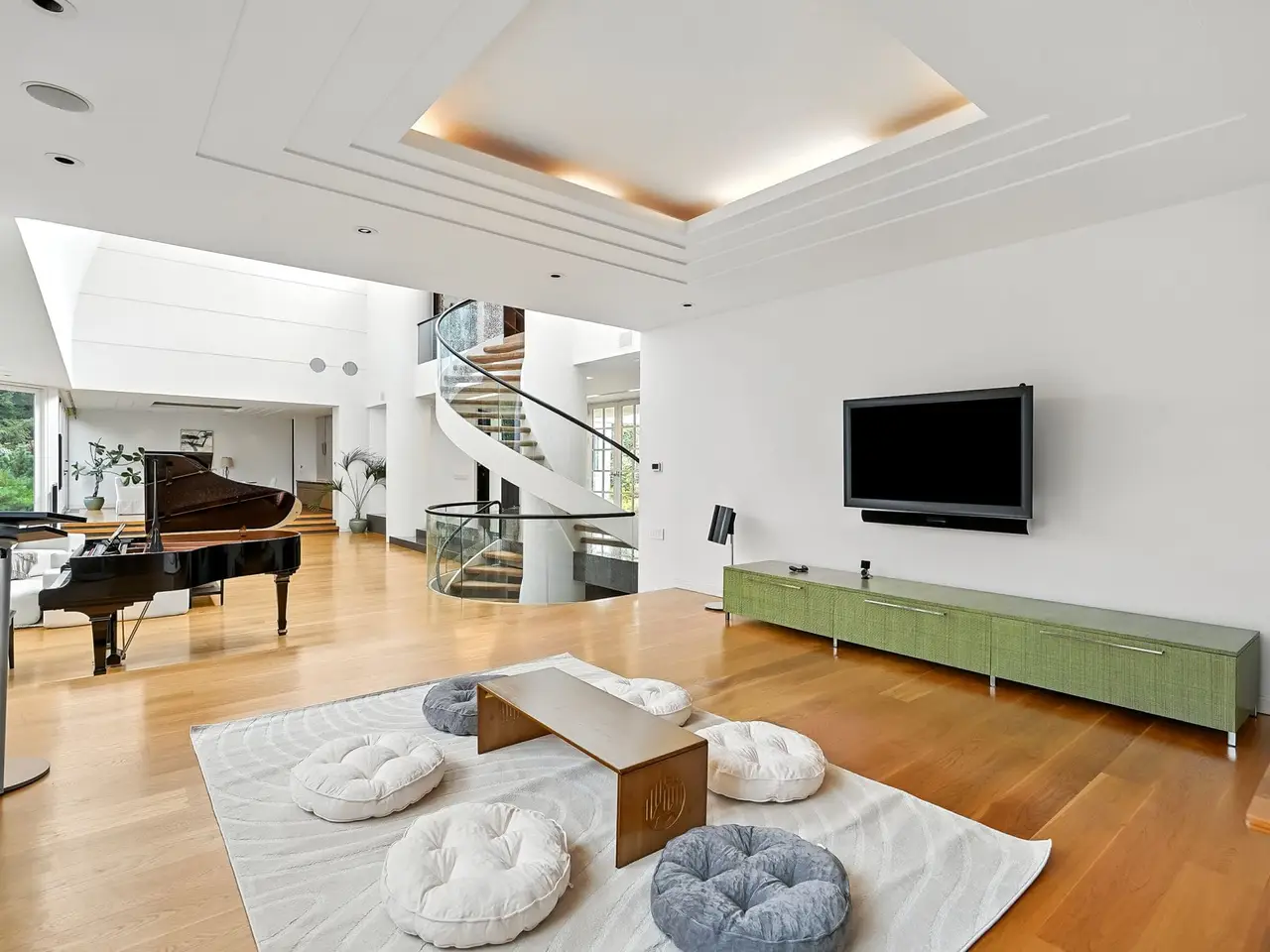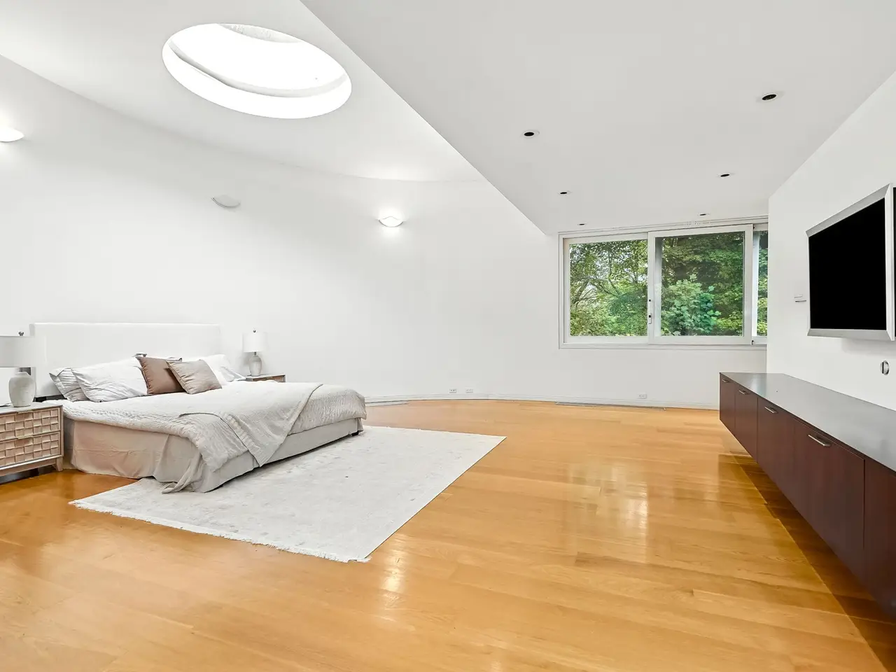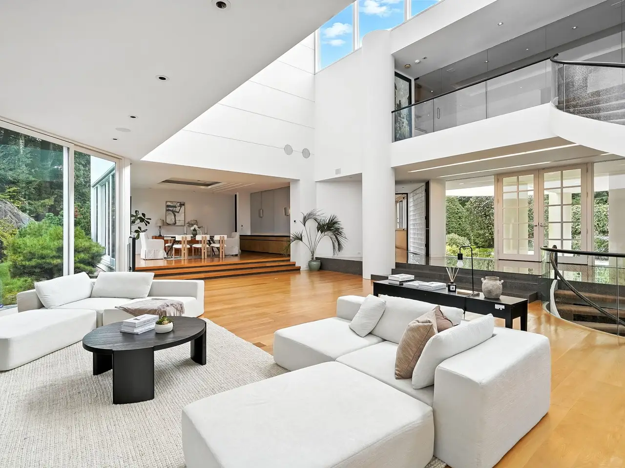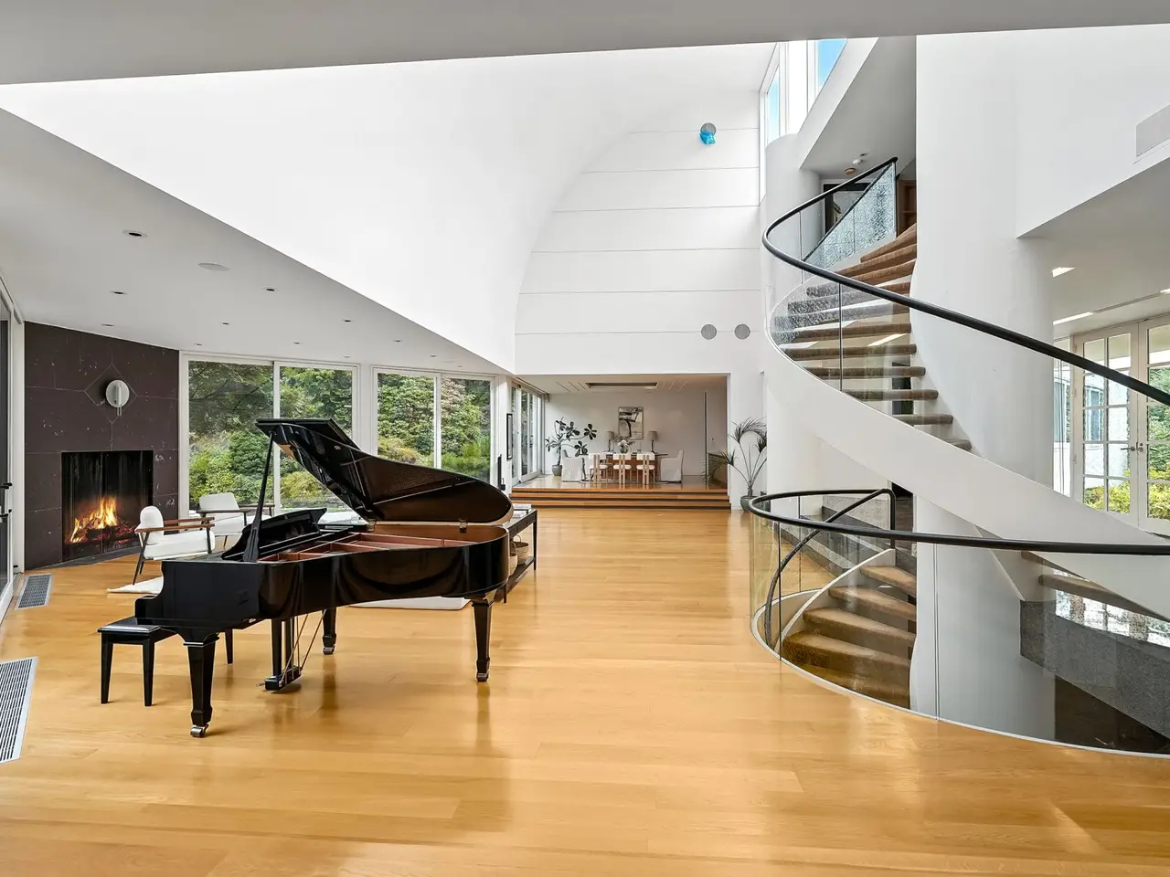 Nestled in breathtaking natural surroundings, this modern architectural masterpiece by renowned designer Myron Goldfinger offers three levels of striking contemporary design. The residence features a soaring three-story curved ceiling, a dramatic floating staircase, and expansive open-plan living and entertaining spaces that frame the home's private setting. The main-level primary suite provides a serene retreat, while the sleek, state-of-the-art kitchen is ideal for both everyday living and entertaining. Additional highlights include a fitness room, Shoreline pool with cabana, and a private tennis court. A 4+ car attached garage and below-ground oil heating add convenience. Located just 45 minutes from New York City, this one-of-a-kind residence blends luxury, privacy, and timeless modern design.