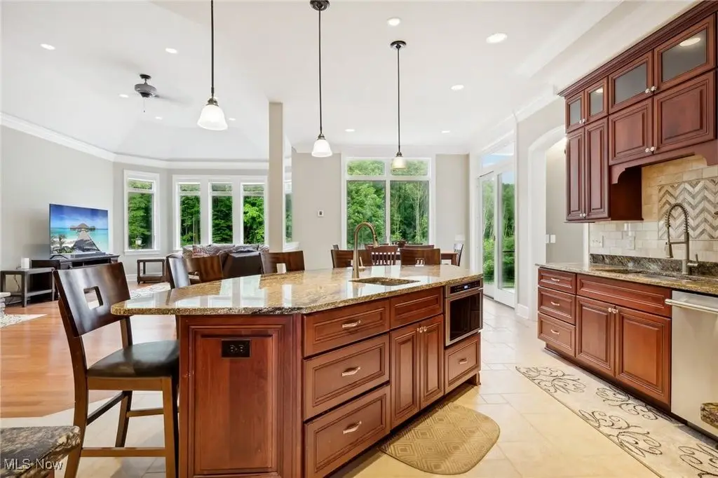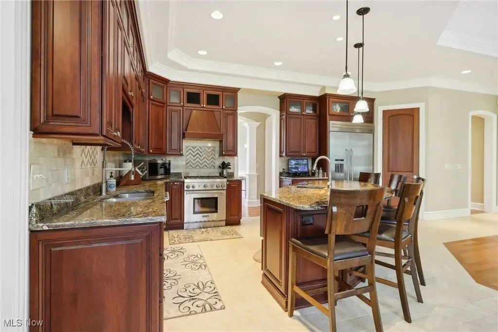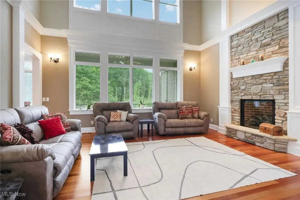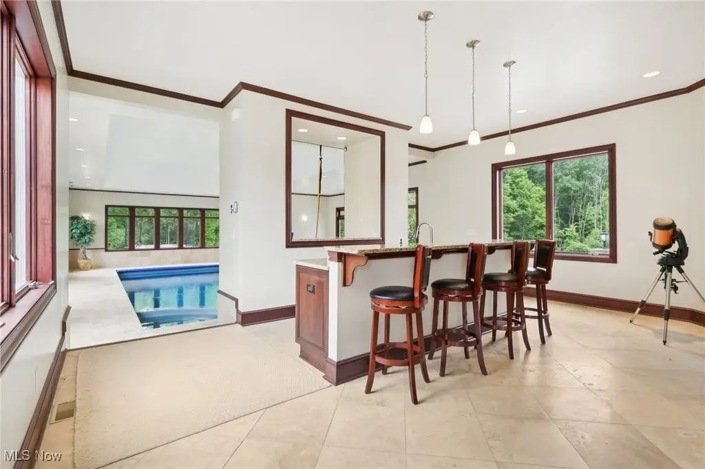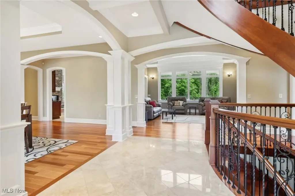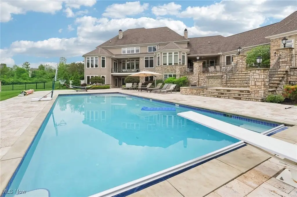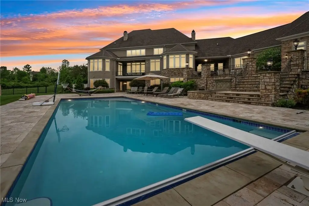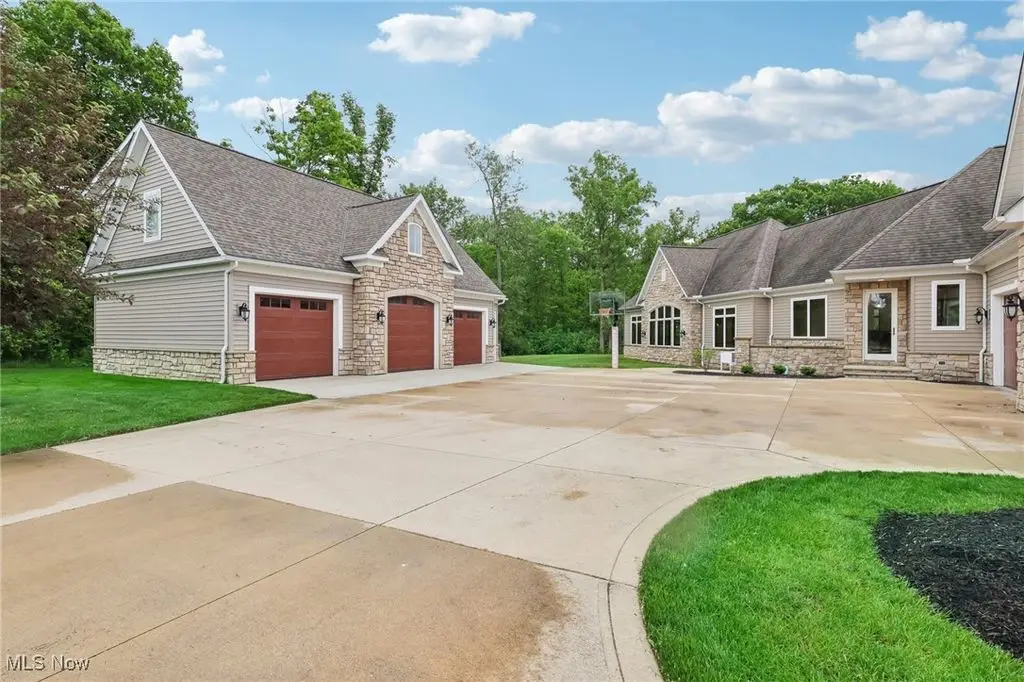 Luxury 3-Acre Estate in the Historic Chardon area...This elegant cul-de-sac home blends timeless craftsmanship with modern luxury. Inside, 10-foot ceilings, 8-foot solid cherry doors, Brazilian cherry flooring and a dramatic two-story white marble foyer with a custom cherry wood and wrought iron spiral staircase set the tone.The two-story great room features a wall of windows overlooking wooded grounds, a two-story patio, inground heated pool, and a hot tub with a waterfall feature. Beyond the formal dining room is the freshly painted kitchen with cherry cabinetry, granite counters, stainless Thermador appliances, walk-in pantry, new tile backsplash, breakfast nook, and a large island with seating for five.A first-floor office/bedroom, laundry, mudroom, and an owners' suite with floor-to-ceiling windows, power shades, dual walk-in luxury closets, and spa-style bath complete the main level.Enjoy an indoor 16x36 pool with Travertine tile, hot tub, and a Dectron humidity control system which also aids to heat the pool room. Upstairs are three bedrooms - one a princess suite - with private baths.Outdoors, the Travertine-tiled pool area offers a new built-in grill with new granite countertop, hot tub, and expansive patio. The finished walk-out basement adds a second kitchen, cherry coffered ceilings, bedroom, work-out room and full bath. Parking includes an attached 4-car garage plus a detached heated 3-car garage with a finished loft.