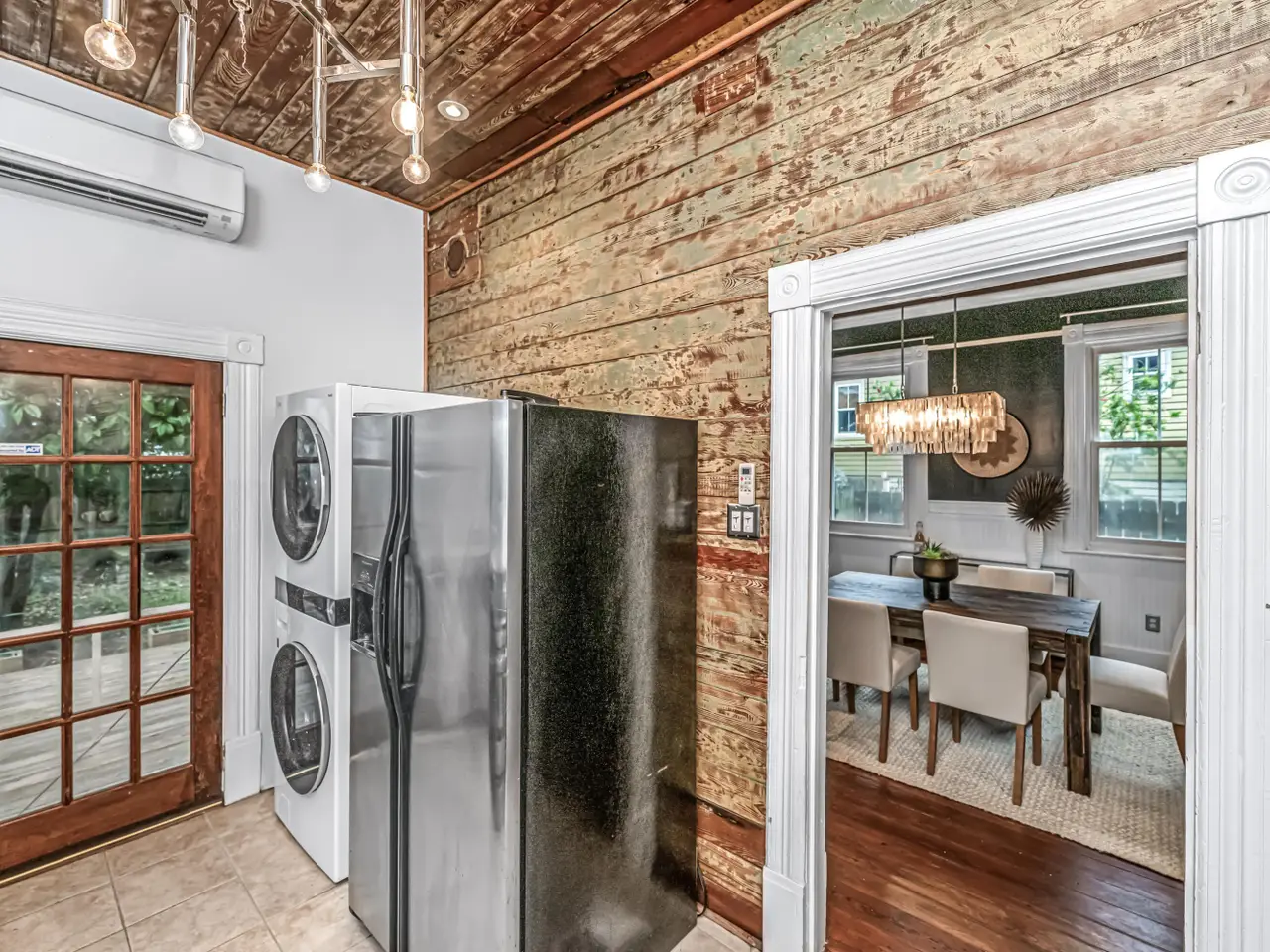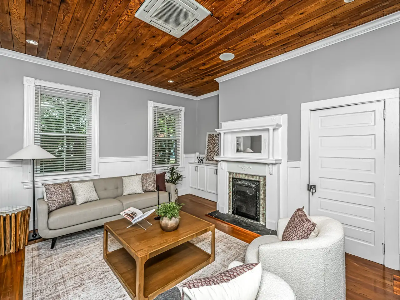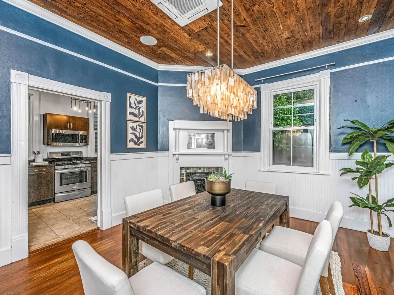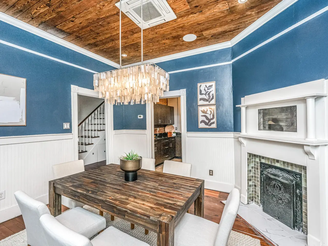 Nestled in the heart of Charleston's historic Westside, this elegant Charleston Single home seamlessly blends timeless charm with thoughtful updates. Boasting three generous bedrooms and two full baths, this classic residence welcomes you with gleaming wood floors, detailed crown molding, and abundant natural light throughout. The inviting living room features a cozy fireplace, while the formal dining room, also with its own fireplace, sets the stage for memorable gatherings. The renovated kitchen offers modern functionality with a touch of Southern grace. The kitchen is a true showpiece, featuring walls and ceiling crafted from repurposed wood salvaged from the home- offering a warm, authentic nod to the past while embracing modern functionality. All three spacious bedrooms are tucked away upstairs for added privacy, with the primary opening to the iconic double piazzas that overlook the quiet street and lush backyard. It also has its own fireplace, an inviting retreat! A durable and stylish metal roof adds long-term peace of mind and architectural appeal. Step into the beautifully landscaped courtyard, where Old Charleston brick, a raised deck, and a serene seating area create a perfect outdoor retreat. Mature flora, a fruiting grapefruit tree, and a charming shed add character and convenience to this enchanting property. This is Charleston living at its finest. Schedule your showing at this classic home today.