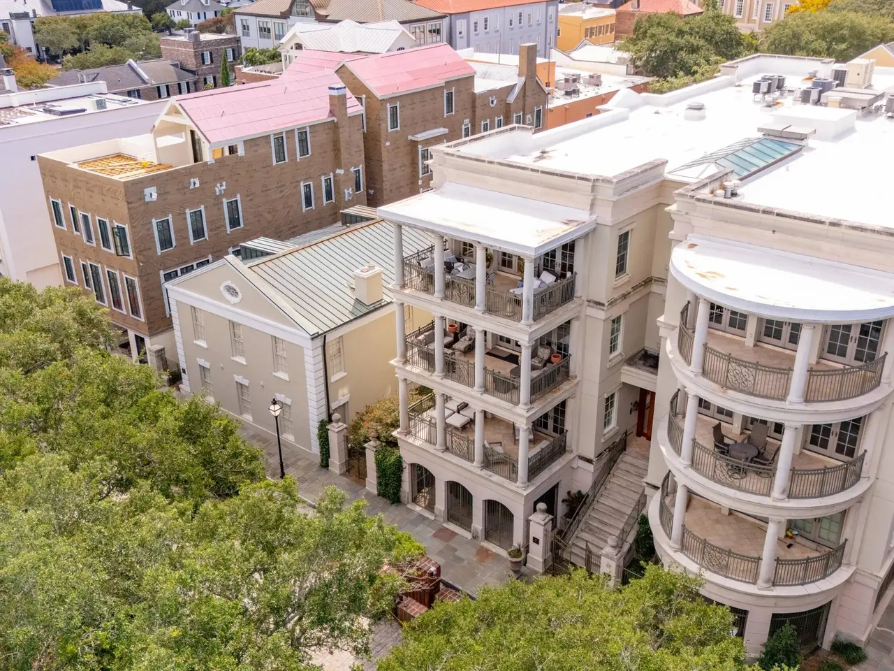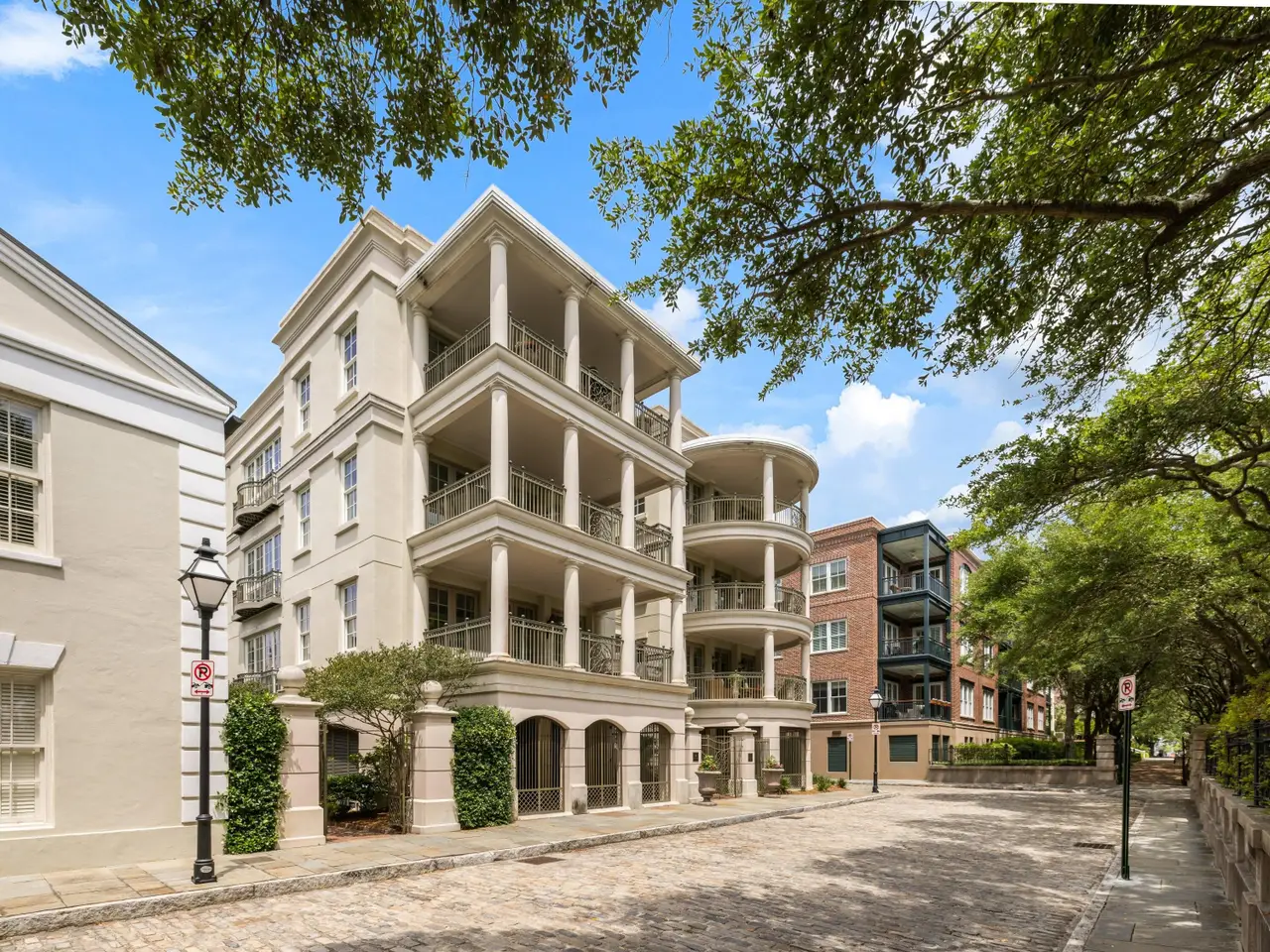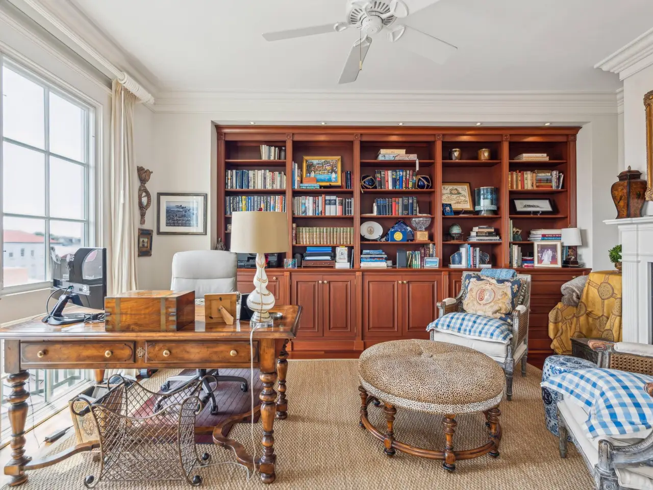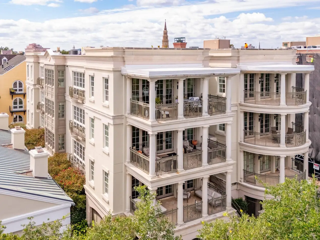 Rare, elegant penthouse-level apartment offering southern views of the Charleston Harbor from the living/dining room and terrace, with historic steeple views from the primary suite. This spacious residence offers the very best apartment floor plan in the city. Luxurious trim and mouldings throughout, this fine apartment lives like a grand home. Well-proportioned formal space with separate formal living room, and dining room divided by a mahogany paneled wet bar and storage. The side hall gallery connects the formal and informal spaces with abundant storage. The well-appointed kitchen offers a separate breakfast area with views of the harbor and beautiful sunrises. Adjacent to the kitchen is a library with mahogany built-ins and another fireplace perfect for evenings or desk working. The bedroom wing offers a comfortable guest bedroom with en suite bath. The luxurious primary suite features another fireplace with abundant light throughout. This suite is unique with two separate baths and two walk-in closets, all en suite. With its prime location, walkable to the very best restaurants and shopping, along with two garage spaces below, this luxurious residence is hands above any in the city.