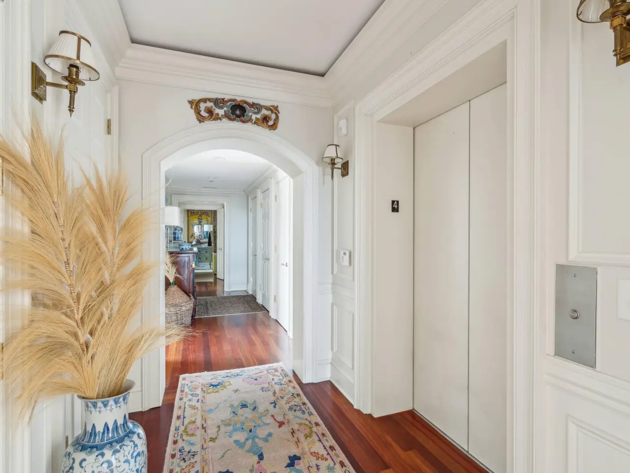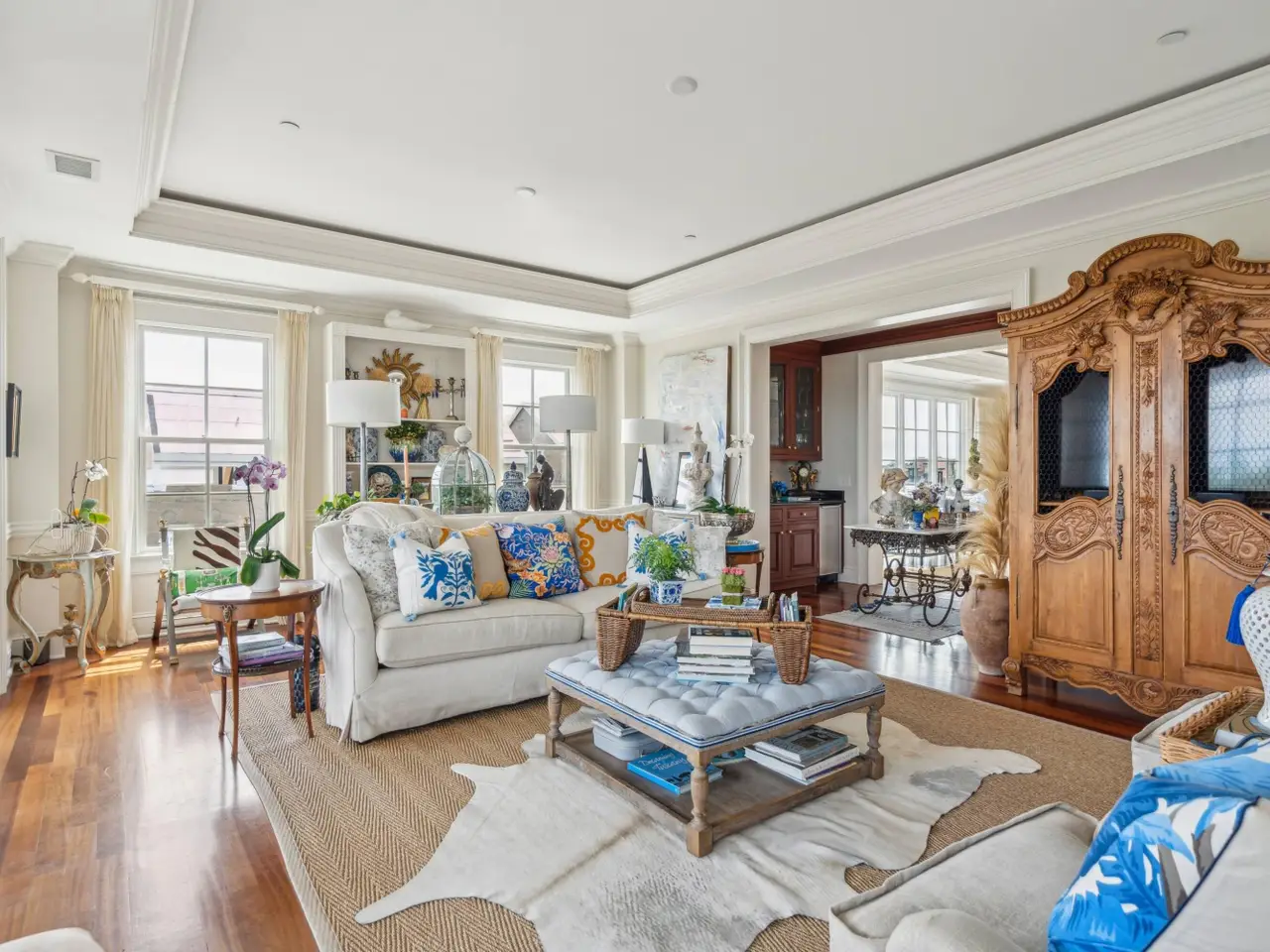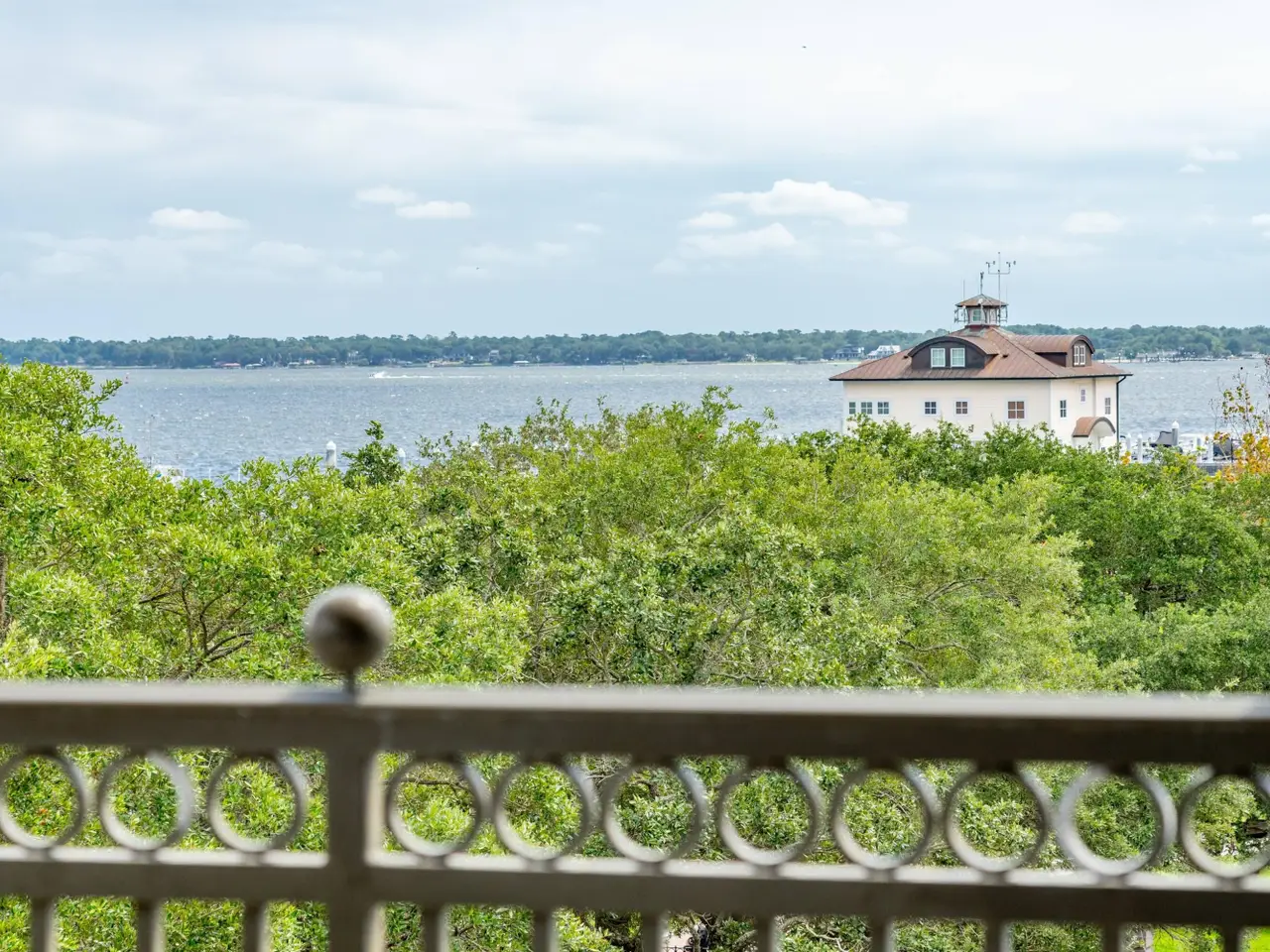 Rare, elegant penthouse-level apartment offering southern views of the Charleston Harbor from the living/dining room and terrace, with historic steeple views from the primary suite. This spacious residence offers the very best apartment floor plan in the city. Luxurious trim and mouldings throughout, this fine apartment lives like a grand home. Well-proportioned formal space with separate formal living room, and dining room divided by a mahogany paneled wet bar and storage. The side hall gallery connects the formal and informal spaces with abundant storage. The well-appointed kitchen offers a separate breakfast area with views of the harbor and beautiful sunrises. Adjacent to the kitchen is a library with mahogany built-ins and another fireplace perfect for evenings or desk working. The bedroom wing offers a comfortable guest bedroom with en suite bath. The luxurious primary suite features another fireplace with abundant light throughout. This suite is unique with two separate baths and two walk-in closets, all en suite. With its prime location, walkable to the very best restaurants and shopping, along with two garage spaces below, this luxurious residence is hands above any in the city.