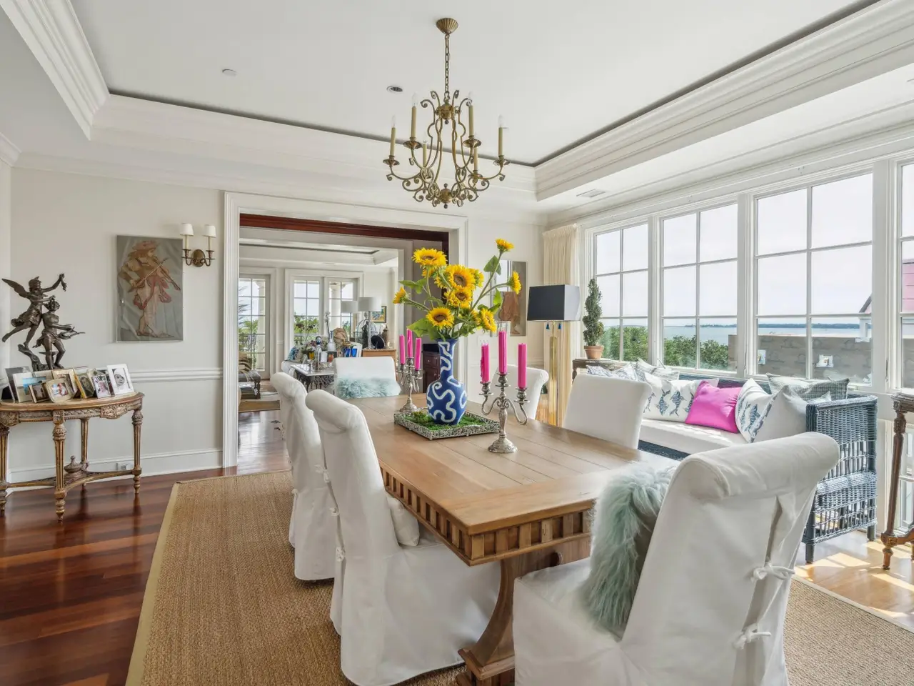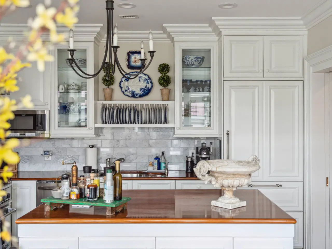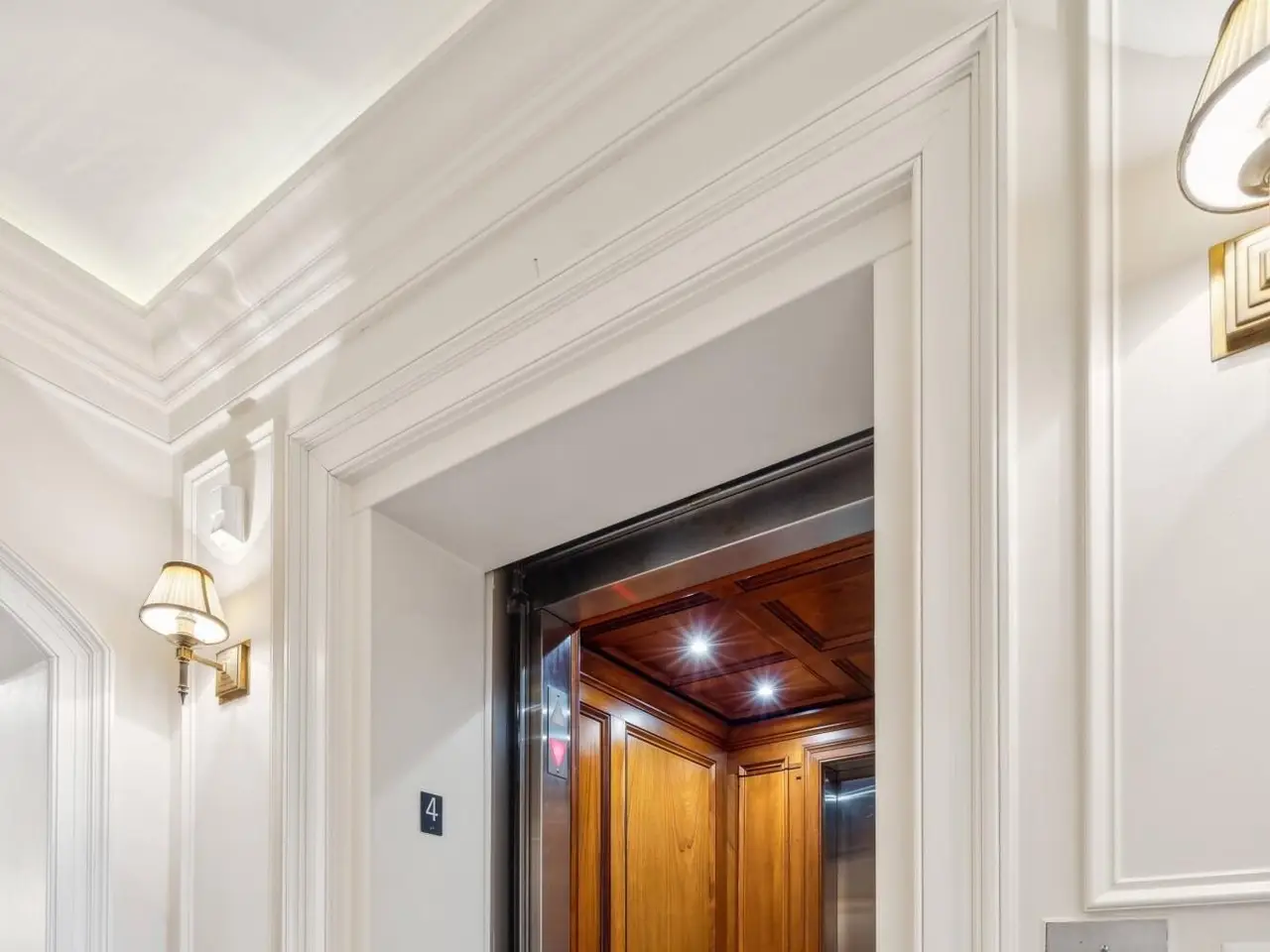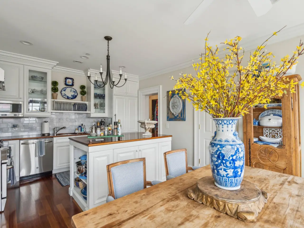 Rare, elegant penthouse-level apartment offering southern views of the Charleston Harbor from the living/dining room and terrace, with historic steeple views from the primary suite. This spacious residence offers the very best apartment floor plan in the city. Luxurious trim and mouldings throughout, this fine apartment lives like a grand home. Well-proportioned formal space with separate formal living room, and dining room divided by a mahogany paneled wet bar and storage. The side hall gallery connects the formal and informal spaces with abundant storage. The well-appointed kitchen offers a separate breakfast area with views of the harbor and beautiful sunrises. Adjacent to the kitchen is a library with mahogany built-ins and another fireplace perfect for evenings or desk working. The bedroom wing offers a comfortable guest bedroom with en suite bath. The luxurious primary suite features another fireplace with abundant light throughout. This suite is unique with two separate baths and two walk-in closets, all en suite. With its prime location, walkable to the very best restaurants and shopping, along with two garage spaces below, this luxurious residence is hands above any in the city.